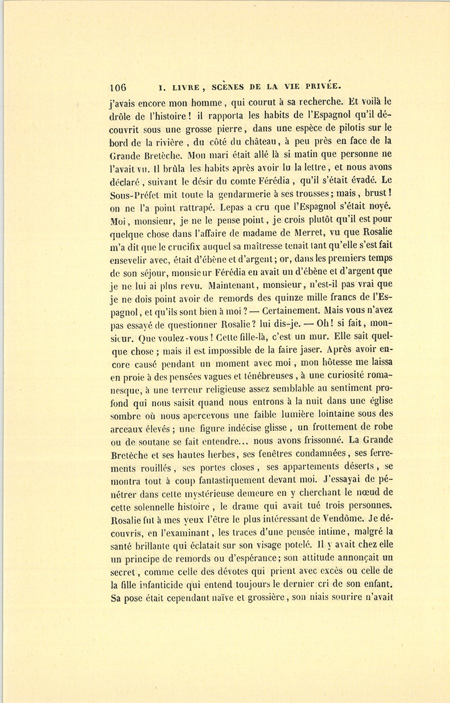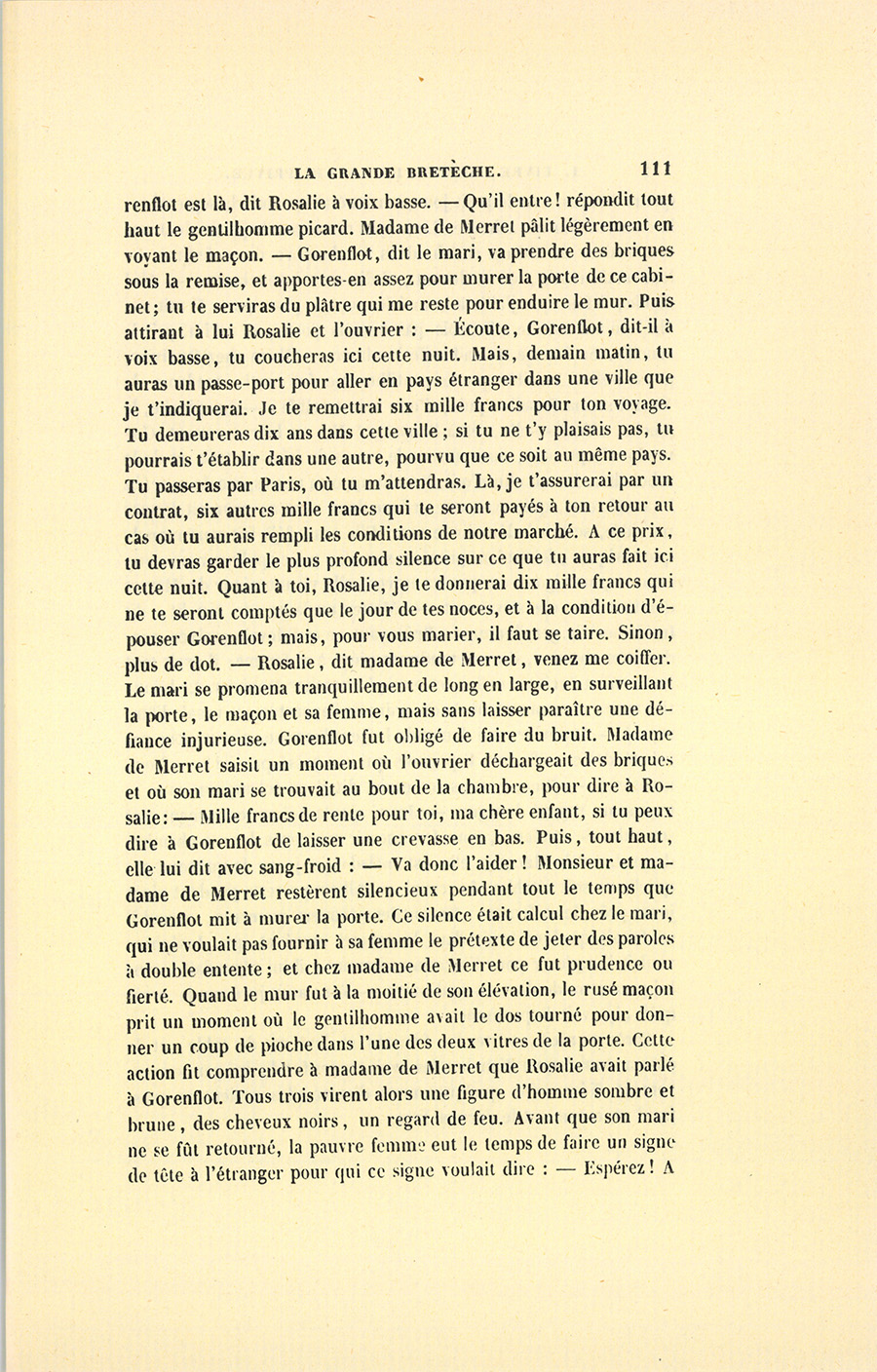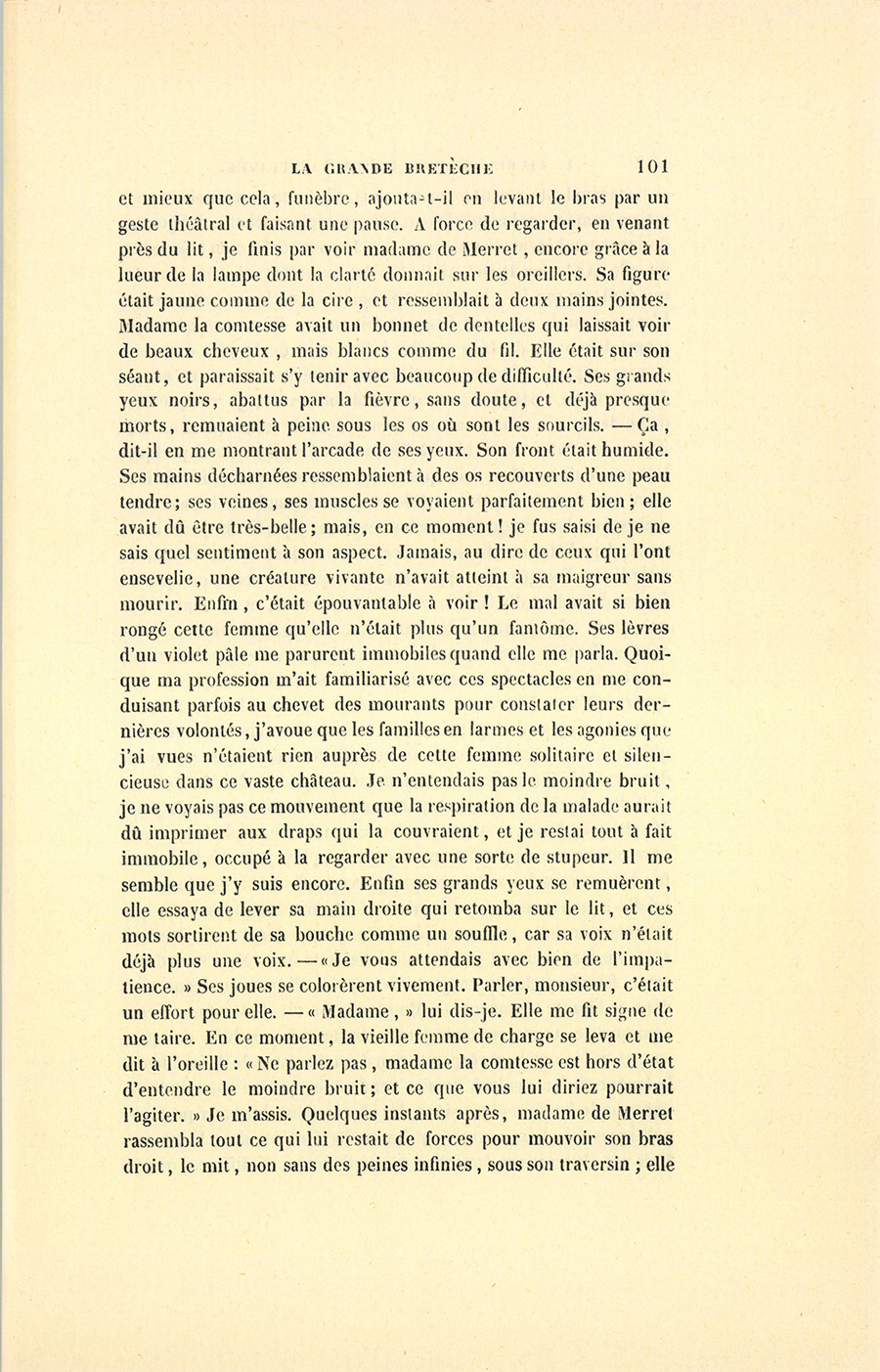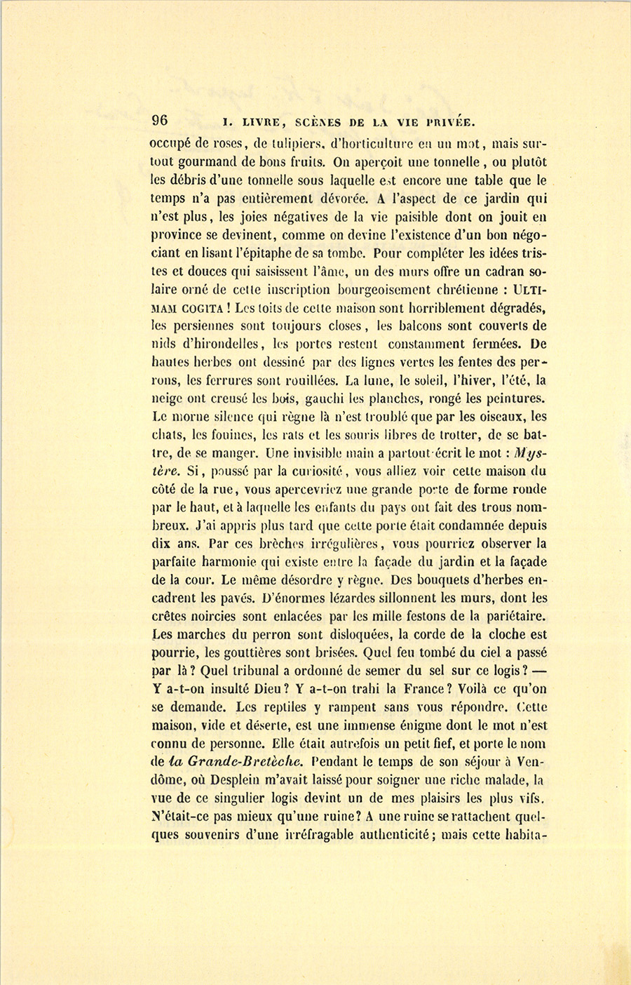 – À une centaine de pas environ de Vendôme, sur les bords du Loir, dit-il, il se trouve une vieille maison brune, surmontée de toits très-élevés, et si complétement isolée qu’il n’existe à l’entour ni tannerie puante ni méchante auberge, comme vous en voyez aux abords de presque toutes les petites villes. Devant ce logis est un jardin donnant sur la rivière, et où les buis, autrefois ras qui dessinaient les allées, croissent maintenant à leur fantaisie. Quelques saules, nés dans le Loir, ont rapidement poussé comme la haie de clôture, et cachent à demi la maison. Les plantes que nous appelons mauvaises décorent de leur belle végétation le talus de la rive. Les arbres fruitiers, négligés depuis dix ans, ne produisent plus de récolte, et leurs rejetons forment des taillis. Les espaliers ressemblent à des charmilles. Les sentiers, sablés jadis, sont remplis de pourpier ; mais, à vrai dire, il n’y a plus trace de sentier. Du haut de la montagne sur laquelle pendent les ruines du vieux château des ducs de Vendôme, le seul endroit d’où l’œil puisse plonger sur cet enclos, on se dit que, dans un temps qu’il est difficile de déterminer ce coin de terre fit les délices de quelque gentilhomme {p. 96} occupé de roses, de tulipiers, d’horticulture en un mot, mais surtout gourmand de bons fruits. On aperçoit une tonnelle, ou plutôt les débris d’une tonnelle sous laquelle est encore une table que le temps n’a pas entièrement dévorée. À l’aspect de ce jardin qui n’est plus, les joies négatives de la vie paisible dont on jouit en province se devinent, comme on devine l’existence d’un bon négociant en lisant l’épitaphe de sa tombe. Pour compléter les idées tristes et douces qui saisissent l’âme, un des murs offre un cadran solaire orné de cette inscription bourgeoisement chrétienne : Ultimam cogita ! Les toits de cette maison sont horriblement dégradés, les persiennes sont toujours closes, les balcons sont couverts de nids d’hirondelles, les portes restent constamment fermées. De hautes herbes ont dessiné par des lignes vertes les fentes des perrons, les ferrures sont rouillées. La lune, le soleil, l’hiver, l’été, la neige ont creusé les bois, gauchi les planches, rongé les peintures. Le morne silence qui règne là n’est troublé que par les oiseaux, les chats, les fouines, les rats et les souris libres de trotter, de se battre, de se manger. Une invisible main a partout écrit le mot : Mystère. Si, poussé par la curiosité, vous alliez voir cette maison du côté de la rue, vous apercevriez une grande porte de forme ronde par le haut, et à laquelle les enfants du pays ont fait des trous nombreux. J’ai appris plus tard que cette porte était condamnée depuis dix ans. Par ces brèches irrégulières, vous pourriez observer la parfaite harmonie qui existe entre la façade du jardin et la façade de la cour. Le même désordre y règne. Des bouquets d’herbes encadrent les pavés. D’énormes lézardes sillonnent les murs, dont les crêtes noircies sont enlacées par les mille festons de la pariétaire. Les marches du perron sont disloquées, la corde de la cloche est pourrie, les gouttières sont brisées. Quel feu tombé du ciel a passé par là ? Quel tribunal a ordonné de semer du sel sur ce logis ? – Y a-t-on insulté Dieu ? Y a-t-on trahi la France ? Voilà ce qu’on se demande. Les reptiles y rampent sans vous répondre. Cette maison, vide et déserte, est une immense énigme dont le mot n’est connu de personne. Elle était autrefois un petit fief, et porte le nom de la Grande-Bretèche. Pendant le temps de mon1 séjour à Vendôme, où Desplein m’avait laissé pour soigner une riche malade, la vue de ce singulier logis devint un de mes plaisirs les plus vifs. N’était-ce pas mieux qu’une ruine ? À une ruine se rattachent quelques souvenirs d’une irréfragable authenticité ; mais cette habitation {p. 97} encore debout, quoique lentement démolie par une main vengeresse, renfermait un secret, une pensée inconnue ; elle trahissait un caprice tout au moins. Plus d’une fois, le soir, je me fis aborder à la haie devenue sauvage qui protégeait cet enclos. Je bravais les égratignures, j’entrais dans ce jardin sans maître, dans cette propriété qui n’était plus ni publique ni particulière ; j’y restais des heures entières à contempler son désordre. Je n’aurais pas voulu, pour prix de l’histoire à laquelle sans doute était dû ce spectacle bizarre, faire une seule question à quelque Vendômois bavard. Là, je composais de délicieux romans ; je m’y livrais à de petites débauches de mélancolie qui me ravissaient. Si j’avais connu le motif, peut-être vulgaire, de cet abandon, j’eusse perdu les poésies inédites dont je m’enivrais. Pour moi, cet asile représentait les images les plus variées de la vie humaine, assombrie par ses malheurs : c’était tantôt l’air du cloître, moins les religieux ; tantôt la paix du cimetière, sans les morts qui vous parlent leur langage épitaphique ; aujourd’hui la maison du lépreux, demain celle des Atrides ; mais c’était surtout la province avec ses idées recueillies, avec sa vie de sablier. J’y ai souvent pleuré, je n’y ai jamais ri. Plus d’une fois j’ai ressenti des terreurs involontaires en y entendant, au-dessus de ma tête, le sifflement sourd que rendaient les ailes de quelque ramier pressé. Le sol y est humide ; il faut s’y défier des lézards, des vipères, des grenouilles qui s’y promènent avec la sauvage liberté de la nature ; il faut surtout ne pas craindre le froid, car en quelques instants vous sentez un manteau de glace qui se pose sur vos épaules, comme la main du commandeur sur le cou de don Juan. Un soir j’y ai frissonné : le vent avait fait tourner une vieille girouette rouillée, dont les cris ressemblèrent à un gémissement poussé par la maison au moment où 