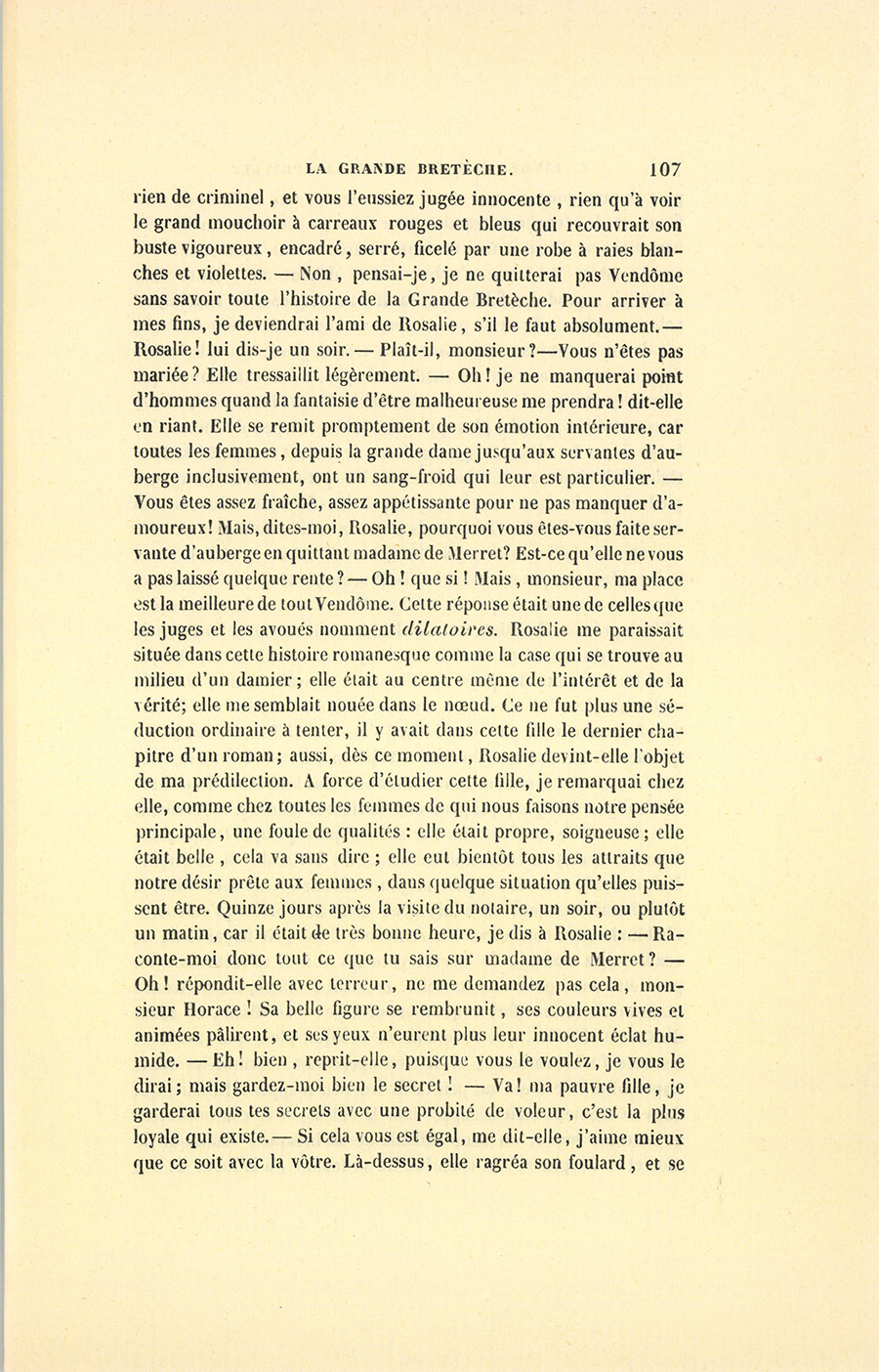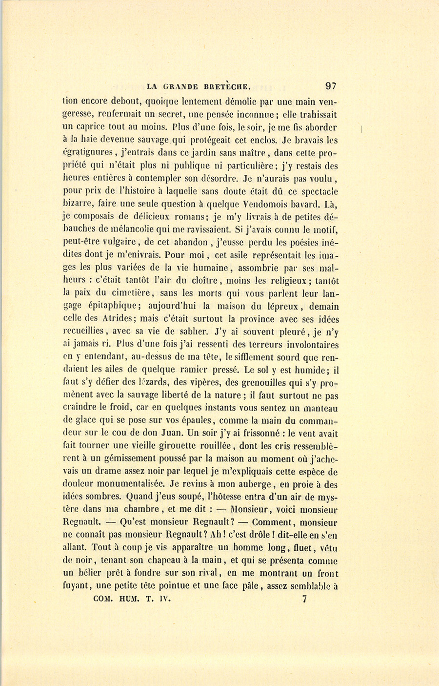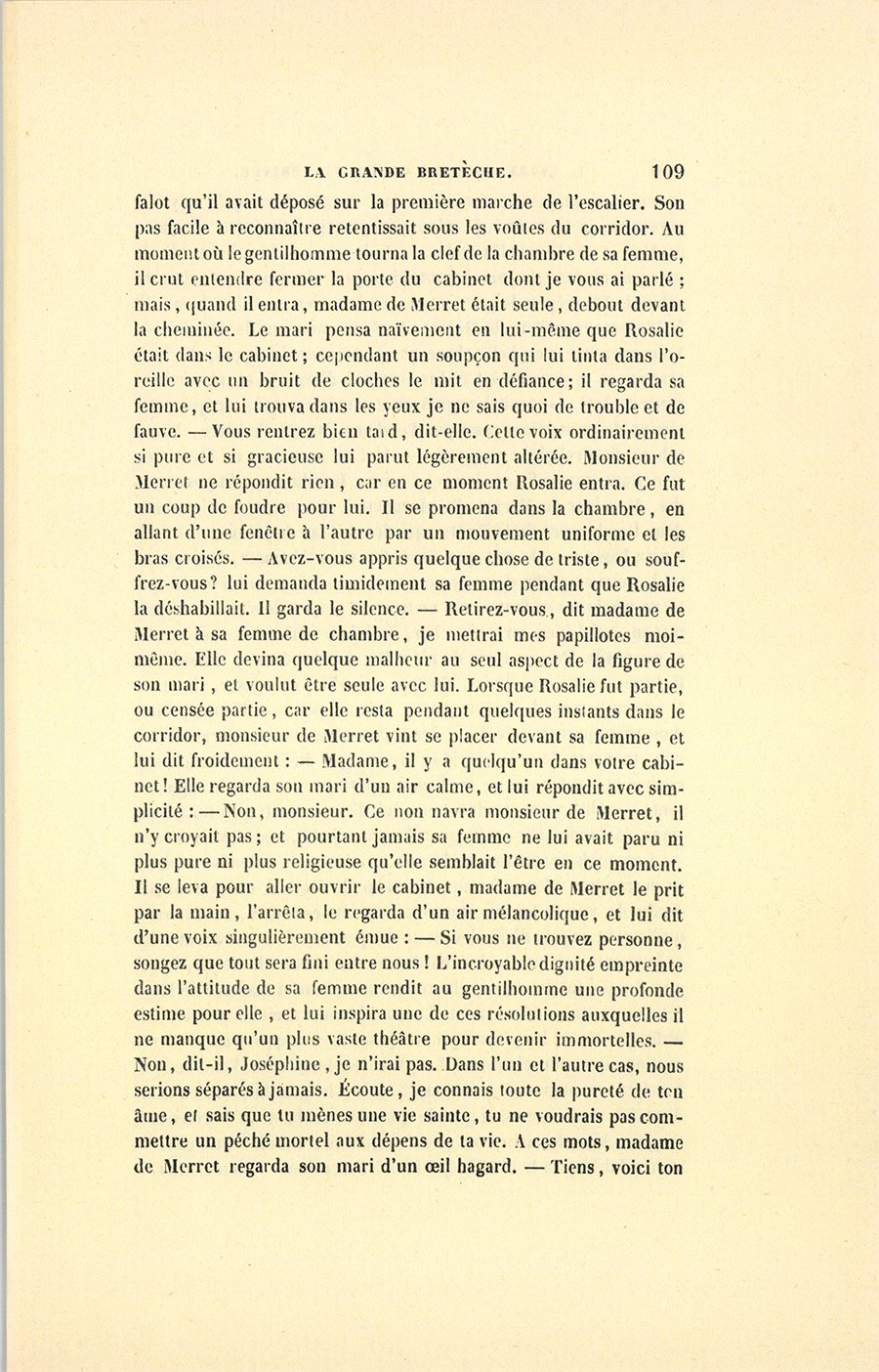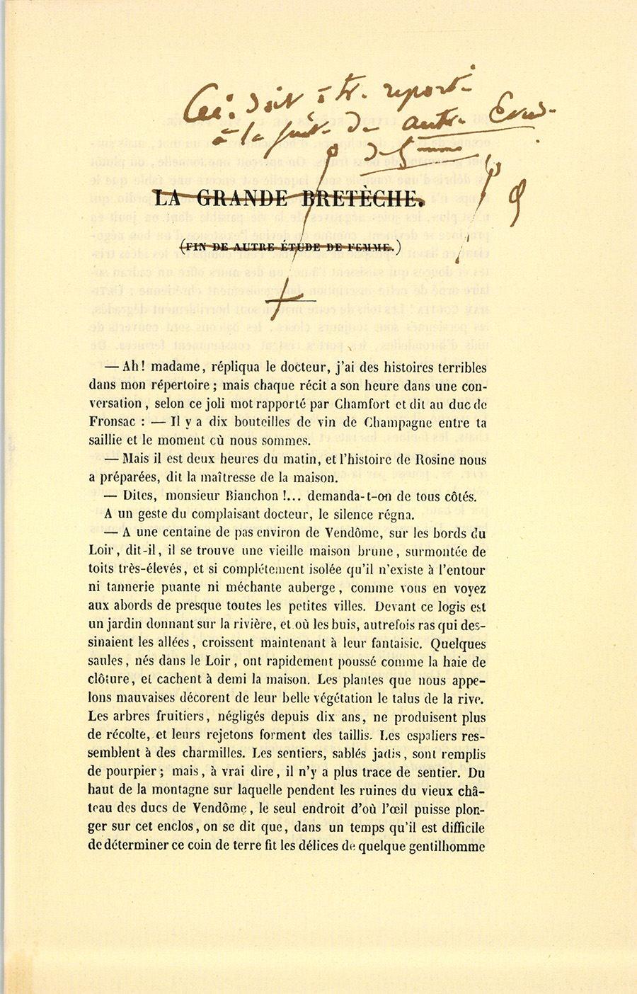 – À une centaine de pas environ de Vendôme, sur les bords du Loir, dit-il, il se trouve une vieille maison brune, surmontée de toits très-élevés, et si complétement isolée qu’il n’existe à l’entour ni tannerie puante ni méchante auberge, comme vous en voyez aux abords de presque toutes les petites villes. Devant ce logis est un jardin donnant sur la rivière, et où les buis, autrefois ras qui dessinaient les allées, croissent maintenant à leur fantaisie. Quelques saules, nés dans le Loir, ont rapidement poussé comme la haie de clôture, et cachent à demi la maison. Les plantes que nous appelons mauvaises décorent de leur belle végétation le talus de la rive. Les arbres fruitiers, négligés depuis dix ans, ne produisent plus de récolte, et leurs rejetons forment des taillis. Les espaliers ressemblent à des charmilles. Les sentiers, sablés jadis, sont remplis de pourpier ; mais, à vrai dire, il n’y a plus trace de sentier. Du haut de la montagne sur laquelle pendent les ruines du vieux château des ducs de Vendôme, le seul endroit d’où l’œil puisse plonger sur cet enclos, on se dit que, dans un temps qu’il est difficile de déterminer ce coin de terre fit les délices de quelque gentilhomme {p. 96} occupé de roses, de tulipiers, d’horticulture en un mot, mais surtout gourmand de bons fruits. On aperçoit une tonnelle, ou plutôt les débris d’une tonnelle sous laquelle est encore une table que le temps n’a pas entièrement dévorée. À l’aspect de ce jardin qui n’est plus, les joies négatives de la vie paisible dont on jouit en province se devinent, comme on devine l’existence d’un bon négociant en lisant l’épitaphe de sa tombe. Pour compléter les idées tristes et douces qui saisissent l’âme, un des murs offre un cadran solaire orné de cette inscription bourgeoisement chrétienne : Ultimam cogita ! Les toits de cette maison sont horriblement dégradés, les persiennes sont toujours closes, les balcons sont couverts de nids d’hirondelles, les portes restent constamment fermées. De hautes herbes ont dessiné par des lignes vertes les fentes des perrons, les ferrures sont rouillées. La lune, le soleil, l’hiver, l’été, la neige ont creusé les bois, gauchi les planches, rongé les peintures. Le morne silence qui règne là n’est troublé que par les oiseaux, les chats, les fouines, les rats et les souris libres de trotter, de se battre, de se manger. Une invisible main a partout écrit le mot : Mystère. Si, poussé par la curiosité, vous alliez voir cette maison du côté de la rue, vous apercevriez une grande porte de forme ronde par le haut, et à laquelle les enfants du pays ont fait des trous nombreux. J’ai appris plus tard que cette porte était condamnée depuis dix ans. Par ces brèches irrégulières, vous pourriez observer la parfaite harmonie qui existe entre la façade du jardin et la façade de la cour. Le même désordre y règne. Des bouquets d’herbes encadrent les pavés. D’énormes lézardes sillonnent les murs, dont les crêtes noircies sont enlacées par les mille festons de la pariétaire. Les marches du perron sont disloquées, la corde de la cloche est pourrie, les gouttières sont brisées. Quel feu tombé du ciel a passé par là ? Quel tribunal a ordonné de semer du sel sur ce logis ? – Y a-t-on insulté Dieu ? Y a-t-on trahi la France ? Voilà ce qu’on se demande. Les reptiles y rampent sans vous répondre. Cette maison, vide et déserte, est une immense énigme dont le mot n’est connu de personne. Elle était autrefois un petit fief, et porte le nom de la Grande-Bretèche. Pendant le temps de mon1 séjour à Vendôme, où Desplein m’avait laissé pour soigner une riche malade, la vue de ce singulier logis devint un de mes plaisirs les plus vifs. N’était-ce pas mieux qu’une ruine ? À une ruine se rattachent quelques souvenirs d’une irréfragable authenticité ; mais cette habitation {p. 97} encore debout, quoique lentement démolie par une main vengeresse, renfermait un secret, une pensée inconnue ; elle trahissait un caprice tout au moins. Plus d’une fois, le soir, je me fis aborder à la haie devenue sauvage qui protégeait cet enclos. Je bravais les égratignures, j’entrais dans ce jardin sans maître, dans cette propriété qui n’était plus ni publique ni particulière ; j’y restais des heures entières à contempler son désordre. Je n’aurais pas voulu, pour prix de l’histoire à laquelle sans doute était dû ce spectacle bizarre, faire une seule question à quelque Vendômois bavard. Là, je composais de délicieux romans ; je m’y livrais à de petites débauches de mélancolie qui me ravissaient. Si j’avais connu le motif, peut-être vulgaire, de cet abandon, j’eusse perdu les poésies inédites dont je m’enivrais. Pour moi, cet asile représentait les images les plus variées de la vie humaine, assombrie par ses malheurs : c’était tantôt l’air du cloître, moins les religieux ; tantôt la paix du cimetière, sans les morts qui vous parlent leur langage épitaphique ; aujourd’hui la maison du lépreux, demain celle des Atrides ; mais c’était surtout la province avec ses idées recueillies, avec sa vie de sablier. J’y ai souvent pleuré, je n’y ai jamais ri. Plus d’une fois j’ai ressenti des terreurs involontaires en y entendant, au-dessus de ma tête, le sifflement sourd que rendaient les ailes de quelque ramier pressé. Le sol y est humide ; il faut s’y défier des lézards, des vipères, des grenouilles qui s’y promènent avec la sauvage liberté de la nature ; il faut surtout ne pas craindre le froid, car en quelques instants vous sentez un manteau de glace qui se pose sur vos épaules, comme la main du commandeur sur le cou de don Juan. Un soir j’y ai frissonné : le vent avait fait tourner une vieille girouette rouillée, dont les cris ressemblèrent à un gémissement poussé par la maison au moment où 