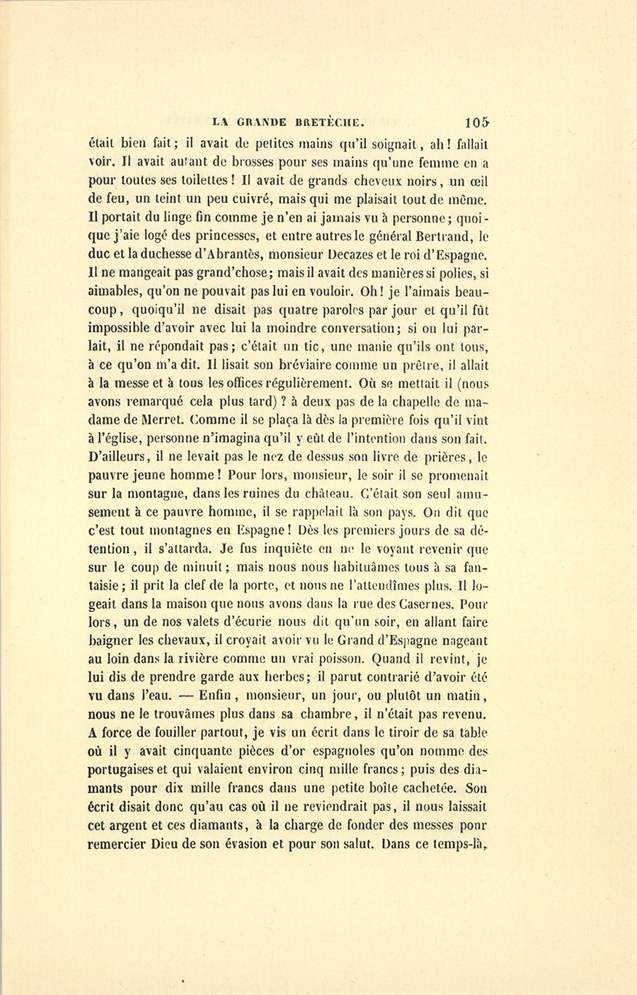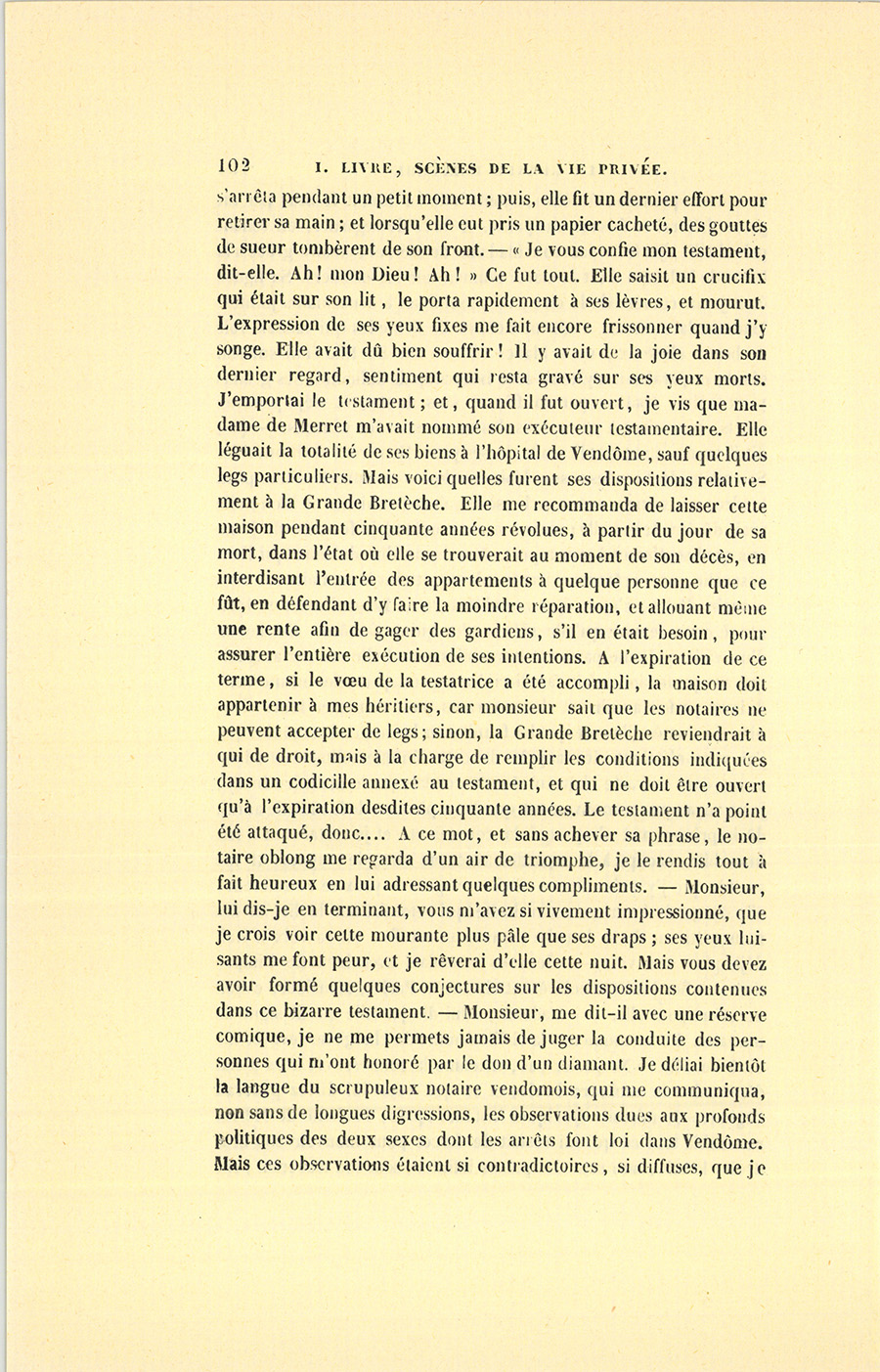 – Oui, dis-je, et sa mort est une des plus belles que je connaisse. Nous avions passé le duc et moi la nuit au chevet de la mourante, dont la pulmonie, arrivée au dernier degré, ne laissait aucun espoir, elle avait été administrée la veille. Le duc s’était endormi. Madame la duchesse, s’étant réveillée vers quatre {p. 457} heures du matin, me fit, de la manière la plus touchante et en souriant, un signe amical pour me dire de le laisser reposer, et cependant elle allait mourir ! Elle était arrivée à une maigreur extraordinaire, mais son visage avait conservé ses traits et ses formes vraiment sublimes. Sa pâleur faisait ressembler sa peau à de la porcelaine derrière laquelle on aurait mis une lumière. Ses yeux vifs et ses couleurs tranchaient sur ce teint plein d’une molle élégance, et il respirait dans sa physionomie une imposante tranquillité. Elle paraissait plaindre le duc, et ce sentiment prenait sa source dans une tendresse élevée qui semblait ne plus connaître de bornes aux approches de la mort. Le silence était profond. La chambre, doucement éclairée par une lampe, avait l’aspect de toutes les chambres de malades au moment de la mort. En ce moment la pendule sonna. Le duc se réveilla, et fut au désespoir d’avoir dormi. Je ne vis pas le geste d’impatience par lequel il peignit le regret qu’il éprouvait d’avoir perdu de vue sa femme pendant un des derniers moments qui lui étaient accordés ; mais il est sûr qu’une personne autre que la mourante aurait pu s’y tromper. Homme d’état, préoccupé des intérêts de la France, le duc avait mille de ces bizarreries apparentes qui font prendre les gens de génie pour des fous, mais dont l’explication se trouve dans la nature exquise et dans les exigences de leur esprit. Il vint se mettre dans un fauteuil près du lit de sa femme, et la regarda fixement. La mourante avança un peu la main, prit celle de son mari, la serra faiblement ; et d’une voix douce, mais émue, elle lui dit : – Mon pauvre ami, qui donc maintenant te comprendra ? Puis elle mourut en le regardant.