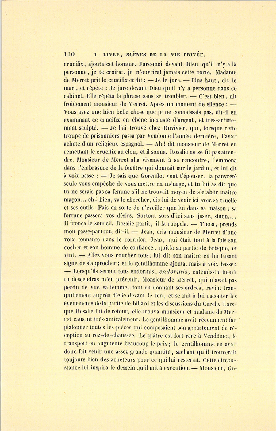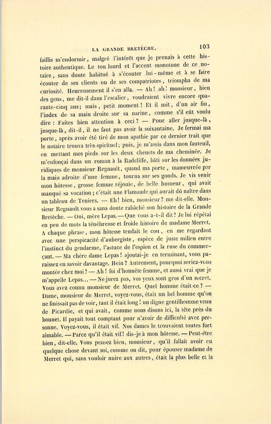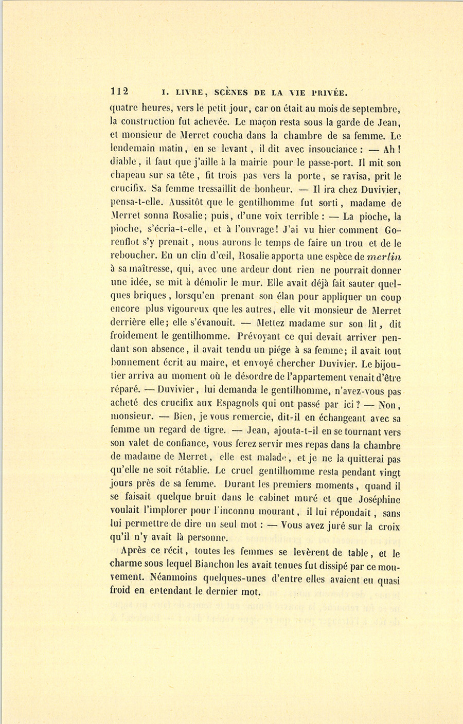 {p. 95} – Ah ! madame, répliqua le docteur, j’ai des histoires terribles dans mon répertoire ; mais chaque récit a son heure dans une conversation, selon ce joli mot rapporté par Chamfort et dit au duc de Fronsac : – Il y a dix bouteilles de vin de Champagne entre ta saillie et le moment où nous sommes.
