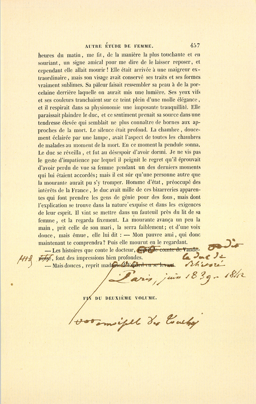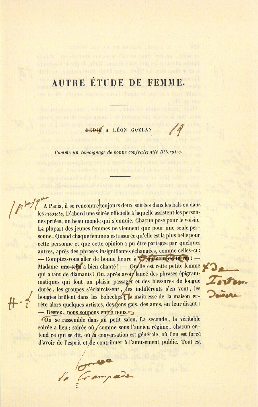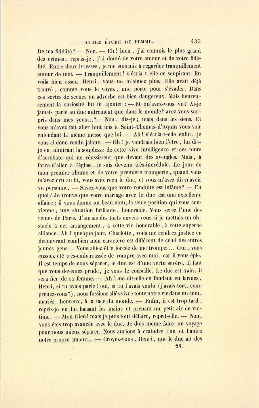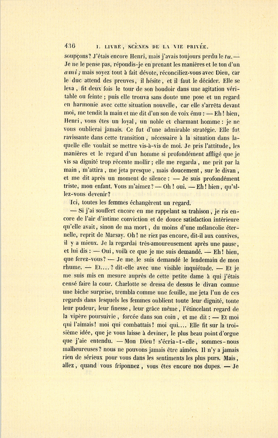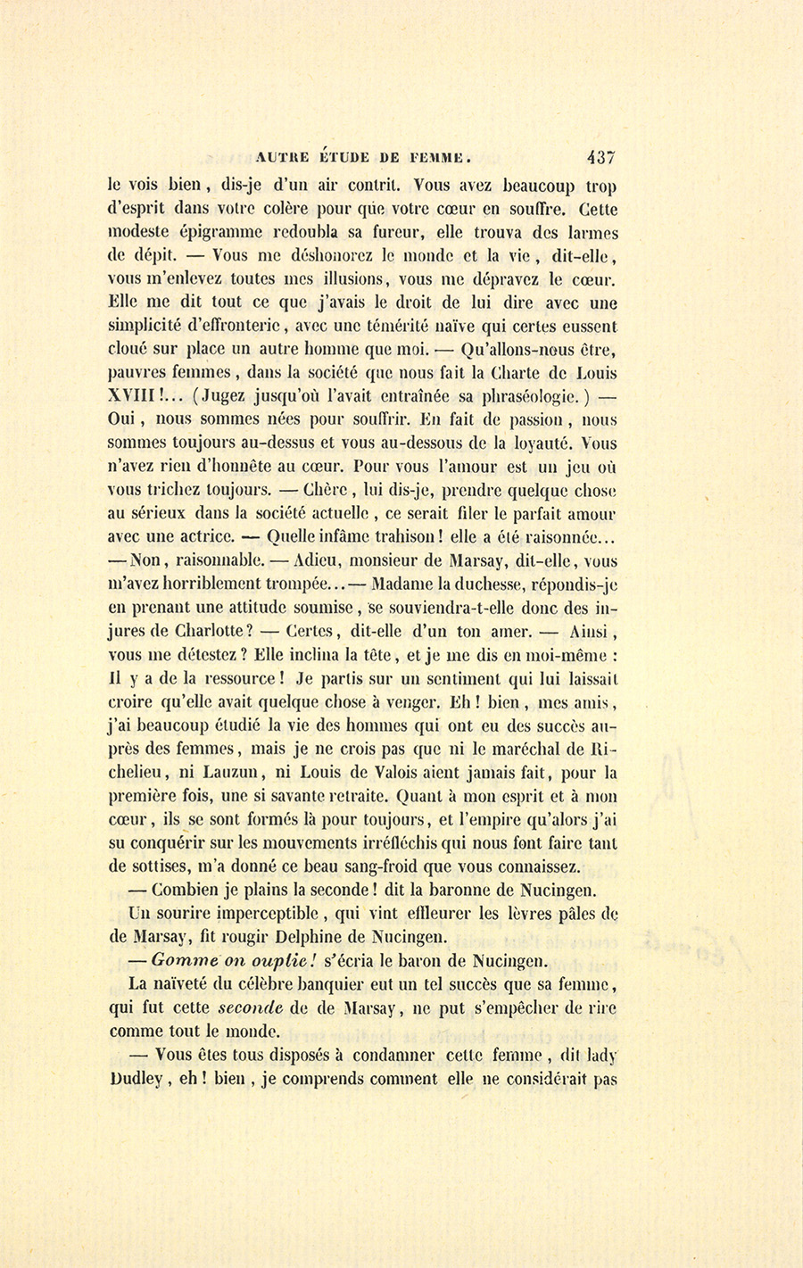 Le salon de mademoiselle des Touches, célèbre d’ailleurs à Paris, est le dernier asile où se soit réfugié l’esprit français d’autrefois, avec sa profondeur cachée, ses mille détours et sa politesse exquise. Là vous observerez encore de la grâce dans les manières malgré les conventions de la politesse, de l’abandon dans la causerie malgré la réserve naturelle aux gens comme il faut, et surtout de la générosité dans les idées. Là, nul ne pense à garder sa pensée pour un drame ; et, dans un récit, personne ne voit un livre à faire. Enfin le hideux squelette d’une littérature aux abois ne se dresse point, à propos d’une saillie heureuse ou d’un sujet intéressant. Le souvenir d’une de ces soirées m’est plus particulièrement resté, moins à cause d’une confidence où l’illustre de Marsay mit à découvert un des replis les plus profonds du cœur de la femme, qu’à cause des observations auxquelles son récit donna lieu sur les changements qui se sont opérés chez la femme française depuis la fatale révolution de juillet.