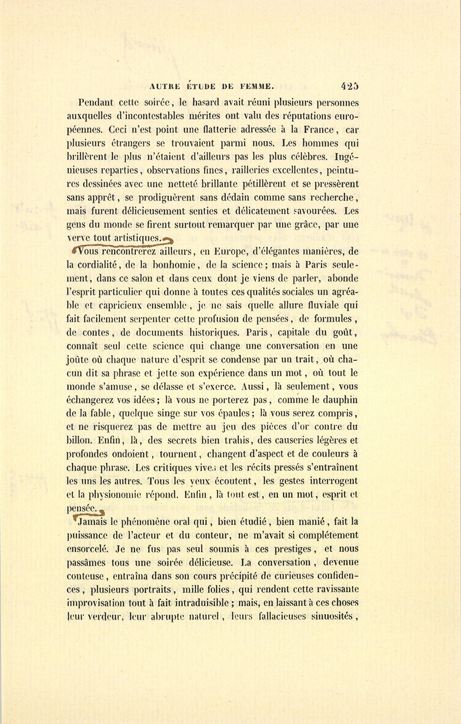 {p. 425} Pendant cette soirée, le hasard avait réuni plusieurs personnes auxquelles d’incontestables mérites ont valu des réputations européennes. Ceci n’est point une flatterie adressée à la France, car plusieurs étrangers se trouvaient parmi nous. Les hommes qui brillèrent le plus n’étaient d’ailleurs pas les plus célèbres. Ingénieuses reparties, observations fines, railleries excellentes, peintures dessinées avec une netteté brillante pétillèrent et se pressèrent sans apprêt, se prodiguèrent sans dédain comme sans recherche, mais furent délicieusement senties et délicatement savourées. Les gens du monde se firent surtout remarquer par une grâce, par une verve tout artistiques. Vous rencontrerez ailleurs, en Europe, d’élégantes manières, de la cordialité, de la bonhomie, de la science ; mais à Paris seulement, dans ce salon et dans ceux dont je viens de parler, abonde l’esprit particulier qui donne à toutes ces qualités sociales un agréable et capricieux ensemble, je ne sais quelle allure fluviale qui fait facilement serpenter cette profusion de pensées, de formules, de contes, de documents historiques. Paris, capitale du goût, connaît seul cette science qui change une conversation en une joûte où chaque nature d’esprit se condense par un trait, où chacun dit sa phrase et jette son expérience dans un mot, où tout le monde s’amuse, se délasse et s’exerce. Aussi, là seulement, vous échangerez vos idées ; là vous ne porterez pas, comme le dauphin de la fable, quelque singe sur vos épaules ; là vous serez compris, et ne risquerez pas de mettre au jeu des pièces d’or contre du billon. Enfin, là, des secrets bien trahis, des causeries légères et profondes ondoient, tournent, changent d’aspect et de couleurs à chaque phrase. Les critiques vives et les récits pressés s’entraînent les uns les autres. Tous les yeux écoutent, les gestes interrogent et la physionomie répond. Enfin, là tout est, en un mot, esprit et pensée. Jamais le phénomène oral qui, bien étudié, bien manié, fait la puissance de l’acteur et du conteur, ne m’avait si complètement ensorcelé. Je ne fus pas seul soumis à ces prestiges, et nous passâmes tous une soirée délicieuse. La conversation, devenue conteuse, entraîna dans son cours précipité de curieuses confidences, plusieurs portraits, mille folies, qui rendent cette ravissante improvisation tout à fait intraduisible ; mais, en laissant à ces choses leur verdeur, leur abrupte naturel, leurs fallacieuses sinuosités, {p. 426} peut-être comprendrez-vous bien le charme d’une véritable soirée française, prise au moment où la familiarité la plus douce fait oublier à chacun ses intérêts, son amour-propre spécial, ou, si vous voulez, ses prétentions.