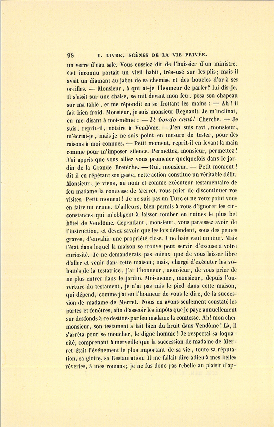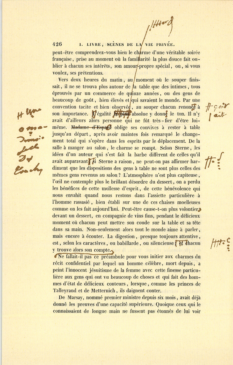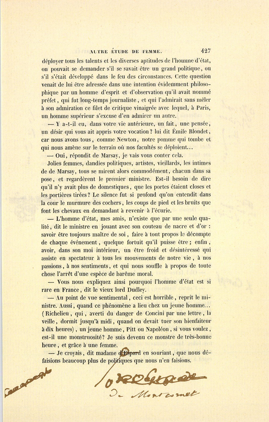 De Marsay, nommé premier ministre depuis six mois, avait déjà donné les preuves d’une capacité supérieure. Quoique ceux qui le connaissaient de longue main ne fussent pas étonnés de lui voir {p. 427} déployer tous les talents et les diverses aptitudes de l’homme d’état, on pouvait se demander s’il se savait être un grand politique, ou s’il s’était développé dans le feu des circonstances. Cette question venait de lui être adressée dans une intention évidemment philosophique par un homme d’esprit et d’observation qu’il avait nommé préfet, qui fut long-temps journaliste, et qui l’admirait sans mêler à son admiration ce filet de critique vinaigrée avec lequel, à Paris, un homme supérieur s’excuse d’en admirer un autre.