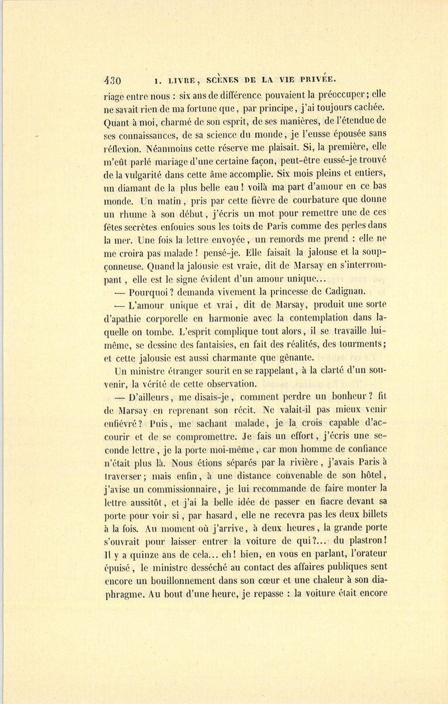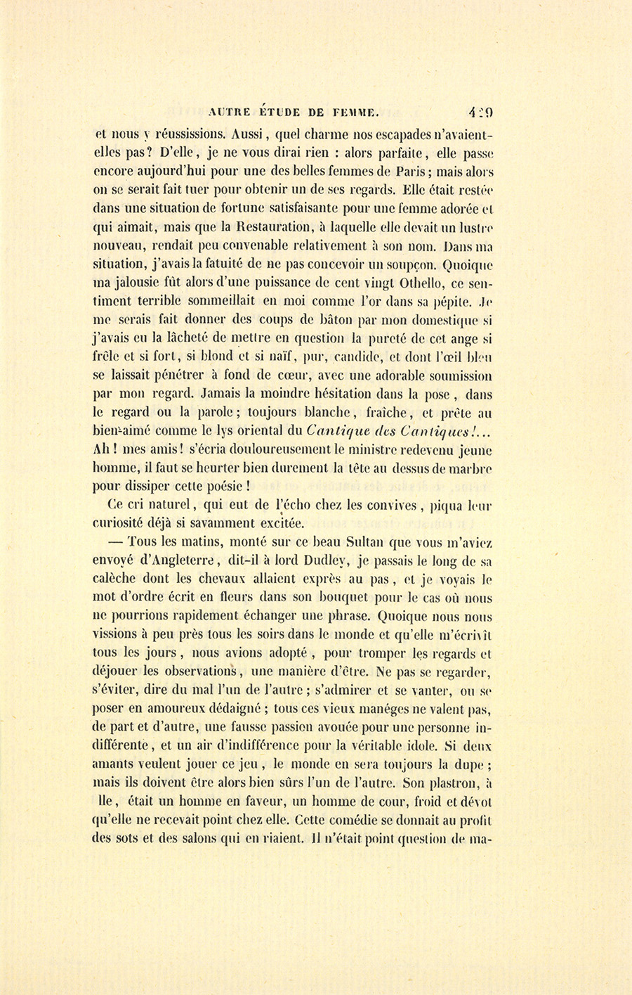 – Tous les matins, monté sur ce beau Sultan que vous m’aviez envoyé d’Angleterre, dit-il à lord Dudley, je passais le long de sa calèche dont les chevaux allaient exprès au pas, et je voyais le mot d’ordre écrit en fleurs dans son bouquet pour le cas où nous ne pourrions rapidement échanger une phrase. Quoique nous nous vissions à peu près tous les soirs dans le monde et qu’elle m’écrivît tous les jours, nous avions adopté, pour tromper les regards et déjouer les observations, une manière d’être. Ne pas se regarder, s’éviter, dire du mal l’un de l’autre ; s’admirer et se vanter, ou se poser en amoureux dédaigné ; tous ces vieux manéges ne valent pas, de part et d’autre, une fausse passion avouée pour une personne indifférente, et un air d’indifférence pour la véritable idole. Si deux amants veulent jouer ce jeu, le monde en sera toujours la dupe ; mais ils doivent être alors bien sûrs l’un de l’autre. Son plastron, à elle, était un homme en faveur, un homme de cour, froid et dévot qu’elle ne recevait point chez elle. Cette comédie se donnait au profit des sots et des salons qui en riaient. Il n’était point question de {p. 430} mariage entre nous : six ans de différence pouvaient la préoccuper ; elle ne savait rien de ma fortune que, par principe, j’ai toujours cachée. Quant à moi, charmé de son esprit, de ses manières, de l’étendue de ses connaissances, de sa science du monde, je l’eusse épousée sans réflexion. Néanmoins cette réserve me plaisait. Si, la première, elle m’eût parlé mariage d’une certaine façon, peut-être eussé-je trouvé de la vulgarité dans cette âme accomplie. Six mois pleins et entiers, un diamant de la plus belle eau ! voilà ma part d’amour en ce bas monde. Un matin, pris par cette fièvre de courbature que donne un rhume à son début, j’écris un mot pour remettre une de ces fêtes secrètes enfouies sous les toits de Paris comme des perles dans la mer. Une fois la lettre envoyée, un remords me prend : elle ne me croira pas malade ! pensé-je. Elle faisait la jalouse et la soupçonneuse. Quand la jalousie est vraie, dit de Marsay en s’interrompant, elle est le signe évident d’un amour unique…