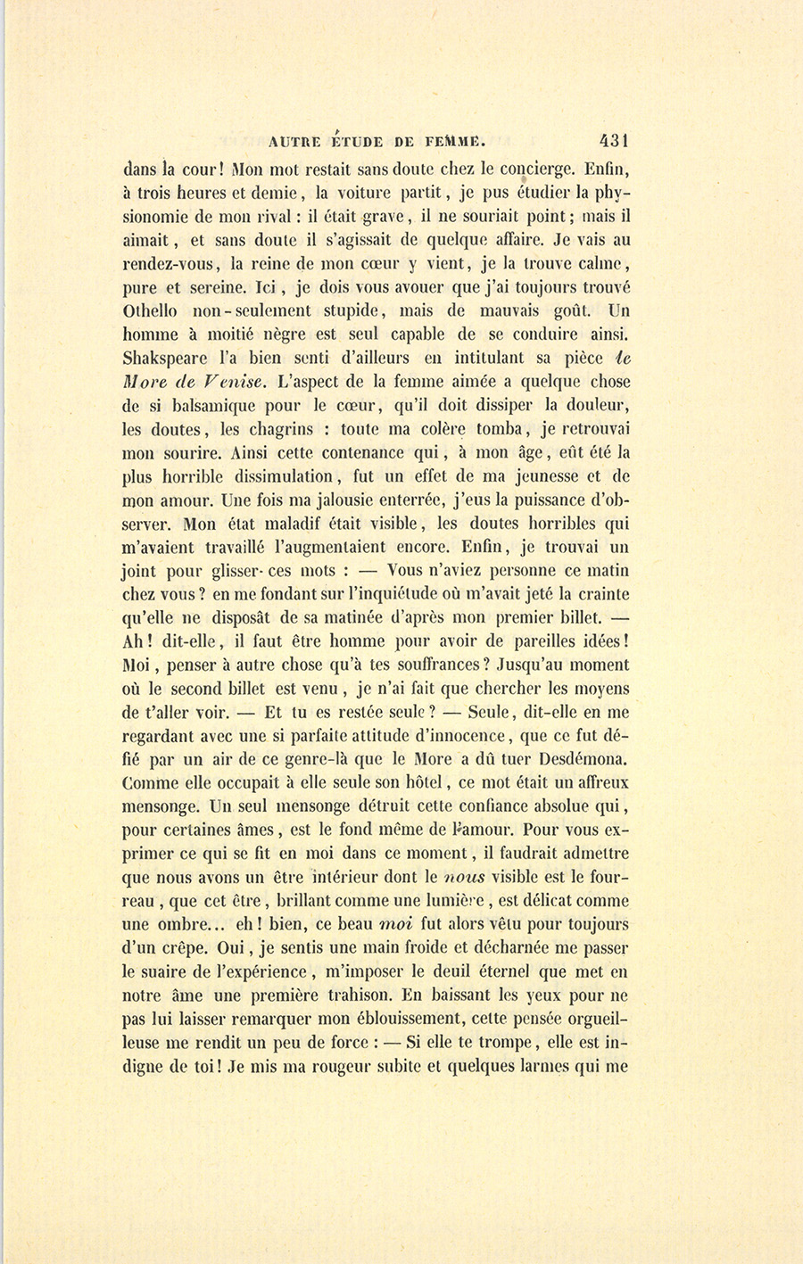 – D’ailleurs, me disais-je, comment perdre un bonheur ? fit de Marsay en reprenant son récit. Ne valait-il pas mieux venir enfiévré ? Puis, me sachant malade, je la crois capable d’accourir et de se compromettre. Je fais un effort, j’écris une seconde lettre, je la porte moi-même, car mon homme de confiance n’était plus là. Nous étions séparés par la rivière, j’avais Paris à traverser ; mais enfin, à une distance convenable de son hôtel, j’avise un commissionnaire, je lui recommande de faire monter la lettre aussitôt, et j’ai la belle idée de passer en fiacre devant sa porte pour voir si, par hasard, elle ne recevra pas les deux billets à la fois. Au moment où j’arrive, à deux heures, la grande porte s’ouvrait pour laisser entrer la voiture de qui ?… du plastron ! Il y a quinze ans de cela… eh ! bien, en vous en parlant, l’orateur épuisé, le ministre desséché au contact des affaires publiques sent encore un bouillonnement dans son cœur et une chaleur à son diaphragme. Au bout d’une heure, je repasse : la voiture était encore {p. 431} dans la cour ! Mon mot restait sans doute chez le concierge. Enfin, à trois heures et demie, la voiture partit, je pus étudier la physionomie de mon rival : il était grave, il ne souriait point ; mais il aimait, et sans doute il s’agissait de quelque affaire. Je vais au rendez-vous, la reine de mon cœur y vient, je la trouve calme, pure et sereine. Ici, je dois vous avouer que j’ai toujours trouvé Othello non-seulement stupide, mais de mauvais goût. Un homme à moitié nègre est seul capable de se conduire ainsi. Shakspeare l’a bien senti d’ailleurs en intitulant sa pièce le More de Venise. L’aspect de la femme aimée a quelque chose de si balsamique pour le cœur, qu’il doit dissiper la douleur, les doutes, les chagrins : toute ma colère tomba, je retrouvai mon sourire. Ainsi cette contenance qui, à mon âge, eût été la plus horrible dissimulation, fut un effet de ma jeunesse et de mon amour. Une fois ma jalousie enterrée, j’eus la puissance d’observer. Mon état maladif était visible, les doutes horribles qui m’avaient travaillé l’augmentaient encore. Enfin, je trouvai un joint pour glisser ces mots : – Vous n’aviez personne ce matin chez vous ? en me fondant sur l’inquiétude où m’avait jeté la crainte qu’elle ne disposât de sa matinée d’après mon premier billet. – Ah ! dit-elle, il faut être homme pour avoir de pareilles idées ! Moi, penser à autre chose qu’à tes souffrances ? Jusqu’au moment où le second billet est venu, je n’ai fait que chercher les moyens de t’aller voir. – Et tu es restée seule ? – Seule, dit-elle en me regardant avec une si parfaite attitude d’innocence, que ce fut défié par un air de ce genre-là que le More a dû tuer Desdémona. Comme elle occupait à elle seule son hôtel, ce mot était un affreux mensonge. Un seul mensonge détruit cette confiance absolue qui, pour certaines âmes, est le fond même de l’amour. Pour vous exprimer ce qui se fit en moi dans ce moment, il faudrait admettre que nous avons un être intérieur dont le nous visible est le fourreau, que cet être, brillant comme une lumière, est délicat comme une ombre… eh ! bien, ce beau moi fut alors vêtu pour toujours d’un crêpe. Oui, je sentis une main froide et décharnée me passer le suaire de l’expérience, m’imposer le deuil éternel que met en notre âme une première trahison. En baissant les yeux pour ne pas lui laisser remarquer mon éblouissement, cette pensée orgueilleuse me rendit un peu de force : – Si elle te trompe, elle est indigne de toi ! Je mis ma rougeur subite et quelques larmes qui me {p. 432} vinrent aux yeux sur un redoublement de douleur, et la douce créature voulut me reconduire jusque chez moi, les stores du fiacre baissés. Pendant le chemin, elle fut d’une sollicitude et d’une tendresse qui eussent trompé ce même More de Venise que je prends pour point de comparaison. En effet, si ce grand enfant hésite deux secondes encore, tout spectateur intelligent devine qu’il va demander pardon à Desdémona. Aussi, tuer une femme, est-ce un acte d’enfant ! Elle pleura en me quittant, tant elle était malheureuse de ne pouvoir me soigner elle-même. Elle souhaitait être mon valet de chambre, dont le bonheur était pour elle un sujet de jalousie, et tout cela rédigé, oh ! mais comme l’eût écrit Clarisse heureuse. Il y a toujours un fameux singe dans la plus jolie et la plus angélique des femmes !