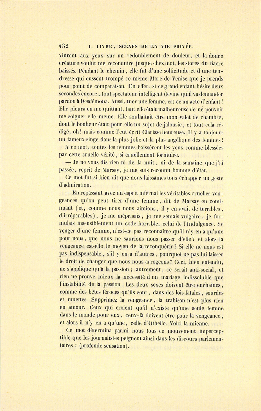 – En repassant avec un esprit infernal les véritables cruelles vengeances qu’on peut tirer d’une femme, dit de Marsay en continuant (et, comme nous nous aimions, il y en avait de terribles, d’irréparables), je me méprisais, je me sentais vulgaire, je formulais insensiblement un code horrible, celui de l’Indulgence. Se venger d’une femme, n’est-ce pas reconnaître qu’il n’y en a qu’une pour nous, que nous ne saurions nous passer d’elle ? et alors la vengeance est-elle le moyen de la reconquérir ? Si elle ne nous est pas indispensable, s’il y en a d’autres, pourquoi ne pas lui laisser le droit de changer que nous nous arrogeons ? Ceci, bien entendu, ne s’applique qu’à la passion ; autrement, ce serait anti-social, et rien ne prouve mieux la nécessité d’un mariage indissoluble que l’instabilité de la passion. Les deux sexes doivent être enchaînés, comme des bêtes féroces qu’ils sont, dans des lois fatales, sourdes et muettes. Supprimez la vengeance, la trahison n’est plus rien en amour. Ceux qui croient qu’il n’existe qu’une seule femme dans le monde pour eux, ceux-là doivent être pour la vengeance, et alors il n’y en a qu’une, celle d’Othello. Voici la mienne.