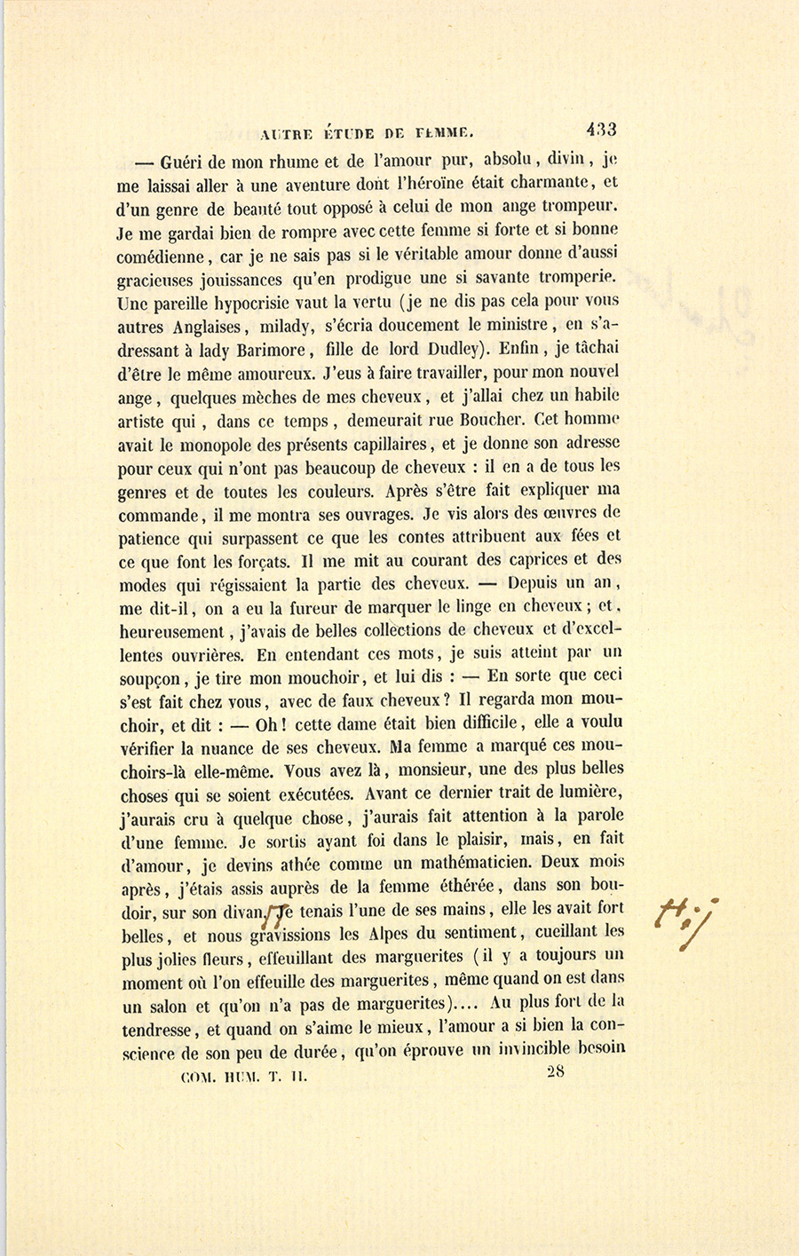 {p. 433} – Guéri de mon rhume et de l’amour pur, absolu, divin, je me laissai aller à une aventure dont l’héroïne était charmante, et d’un genre de beauté tout opposé à celui de mon ange trompeur. Je me gardai bien de rompre avec cette femme si forte et si bonne comédienne, car je ne sais pas si le véritable amour donne d’aussi gracieuses jouissances qu’en prodigue une si savante tromperie. Une pareille hypocrisie vaut la vertu (je ne dis pas cela pour vous autres Anglaises, milady, s’écria doucement le ministre, en s’adressant à lady Barimore, fille de lord Dudley). Enfin, je tâchai d’être le même amoureux. J’eus à faire travailler, pour mon nouvel ange, quelques mèches de mes cheveux, et j’allai chez un habile artiste qui, dans ce temps, demeurait rue Boucher. Cet homme avait le monopole des présents capillaires, et je donne son adresse pour ceux qui n’ont pas beaucoup de cheveux : il en a de tous les genres et de toutes les couleurs. Après s’être fait expliquer ma commande, il me montra ses ouvrages. Je vis alors des œuvres de patience qui surpassent ce que les contes attribuent aux fées et ce que font les forçats. Il me mit au courant des caprices et des modes qui régissaient la partie des cheveux. – Depuis un an, me dit-il, on a eu la fureur de marquer le linge en cheveux ; et, heureusement, j’avais de belles collections de cheveux et d’excellentes ouvrières. En entendant ces mots, je suis atteint par un soupçon, je tire mon mouchoir, et lui dis : – En sorte que ceci s’est fait chez vous, avec de faux cheveux ? Il regarda mon mouchoir, et dit : – Oh ! cette dame était bien difficile, elle a voulu vérifier la nuance de ses cheveux. Ma femme a marqué ces mouchoirs-là elle-même. Vous avez là, monsieur, une des plus belles choses qui se soient exécutées. Avant ce dernier trait de lumière, j’aurais cru à quelque chose, j’aurais fait attention à la parole d’une femme. Je sortis ayant foi dans le plaisir, mais, en fait d’amour, je devins athée comme un mathématicien. Deux mois après, j’étais assis auprès de la femme éthérée, dans son boudoir, sur son divan ; je tenais l’une de ses mains, elle les avait fort belles, et nous gravissions les Alpes du sentiment, cueillant les plus jolies fleurs, effeuillant des marguerites (il y a toujours un moment où l’on effeuille des marguerites, même quand on est dans un salon et qu’on n’a pas de marguerites)... Au plus fort de la tendresse, et quand on s’aime le mieux, l’amour a si bien la conscience de son peu de durée, qu’on éprouve un invincible besoin {p. 434} de se demander : « M’aimes-tu ? m’aimeras-tu toujours ? » Je saisis ce moment élégiaque, si tiède, si fleuri, si épanoui, pour lui faire dire ses plus beaux mensonges dans le ravissant langage de ces exagérations spirituelles, et de cette poésie gasconne particulières à l’amour. Charlotte étala la fine fleur de ses tromperies : elle ne pouvait pas vivre sans moi, j’étais le seul homme qu’il y eût pour elle au monde, elle avait peur de m’ennuyer parce que ma présence lui ôtait tout son esprit ; près de moi, ses facultés devenaient tout amour ; elle était d’ailleurs trop tendre pour ne pas avoir des craintes ; elle cherchait depuis six mois le moyen de m’attacher éternellement et il n’y avait que Dieu qui connaissait ce secret-là ; enfin elle faisait de moi son dieu !…