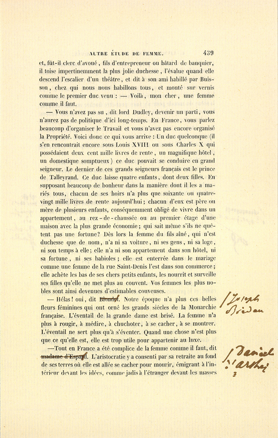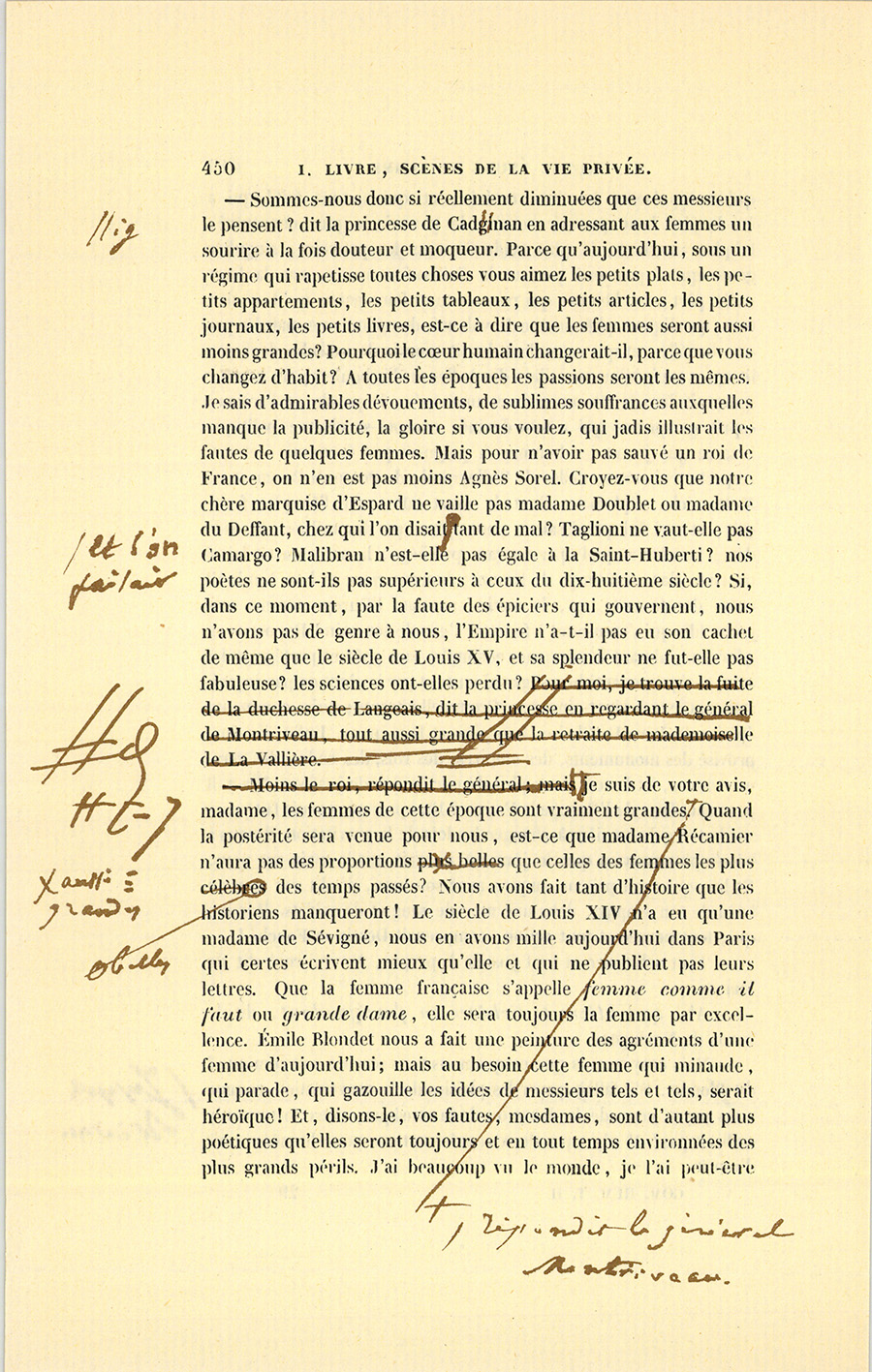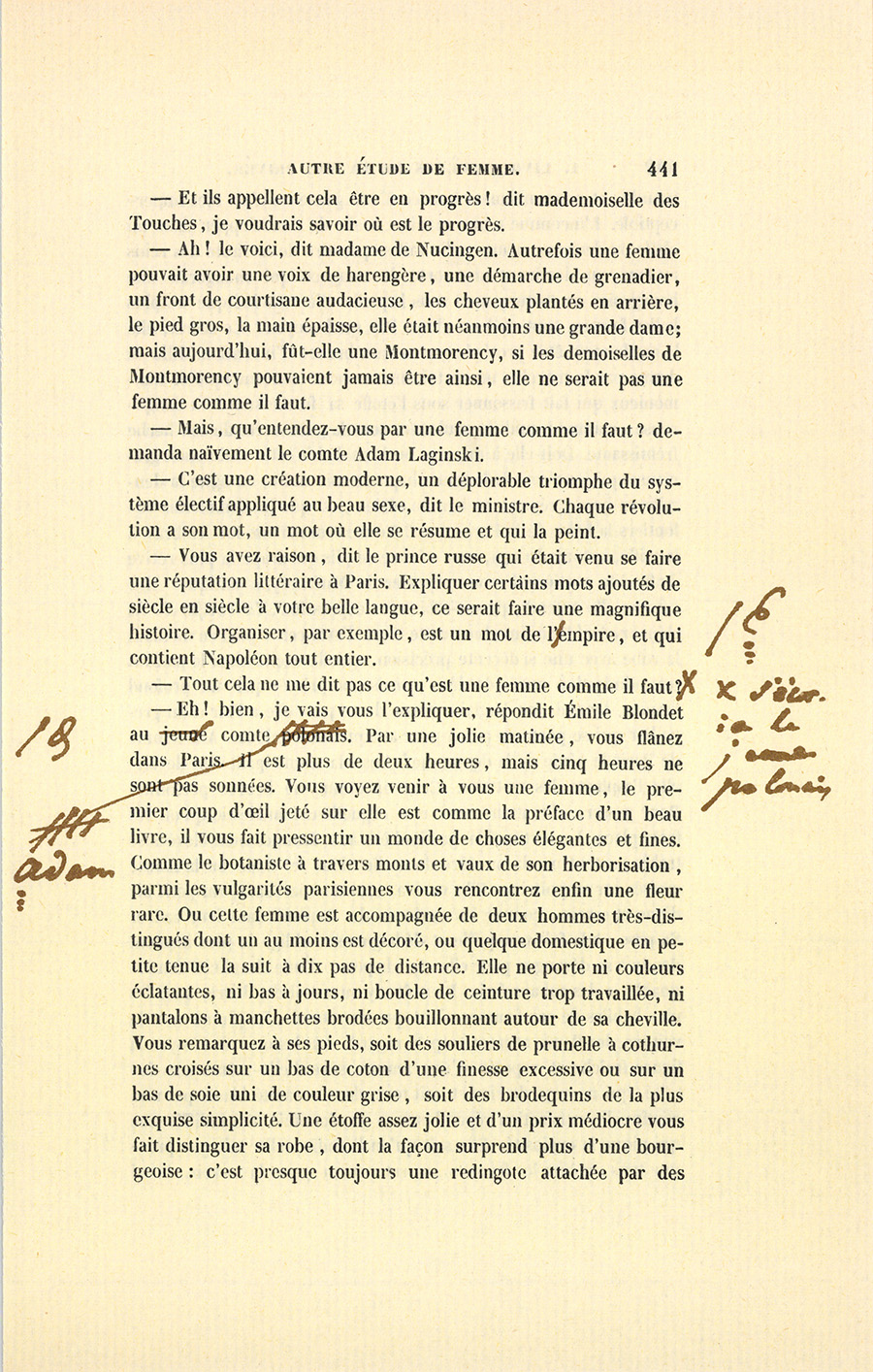 {p. 450} – Sommes-nous donc si réellement diminuées que ces messieurs le pensent ? dit la princesse de Cadignan en adressant aux femmes un sourire à la fois douteur et moqueur. Parce qu’aujourd’hui, sous un régime qui rapetisse toutes choses vous aimez les petits plats, les petits appartements, les petits tableaux, les petits articles, les petits journaux, les petits livres, est-ce à dire que les femmes seront aussi moins grandes ? Pourquoi le cœur humain changerait-il, parce que vous changez d’habit ? À toutes les époques les passions seront les mêmes. Je sais d’admirables dévouements, de sublimes souffrances auxquelles manque la publicité, la gloire si vous voulez, qui jadis illustrait les fautes de quelques femmes. Mais pour n’avoir pas sauvé un roi de France, on n’en est pas moins Agnès Sorel. Croyez-vous que notre chère marquise d’Espard ne vaille pas madame Doublet ou madame du Deffant, chez qui l’on disait et l’on faisait tant de mal ? Taglioni ne vaut-elle pas Camargo ? Malibran n’est-elle pas égale à la Saint-Huberti ? nos poètes ne sont-ils pas supérieurs à ceux du dix-huitième siècle ? Si, dans ce moment, par la faute des épiciers qui gouvernent, nous n’avons pas de genre à nous, l’Empire n’a-t-il pas eu son cachet de même que le siècle de Louis XV, et sa splendeur ne fut-elle pas fabuleuse ? les sciences ont-elles perdu ?