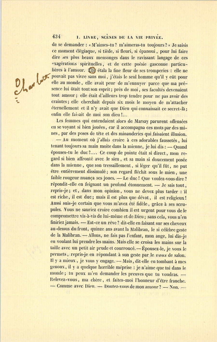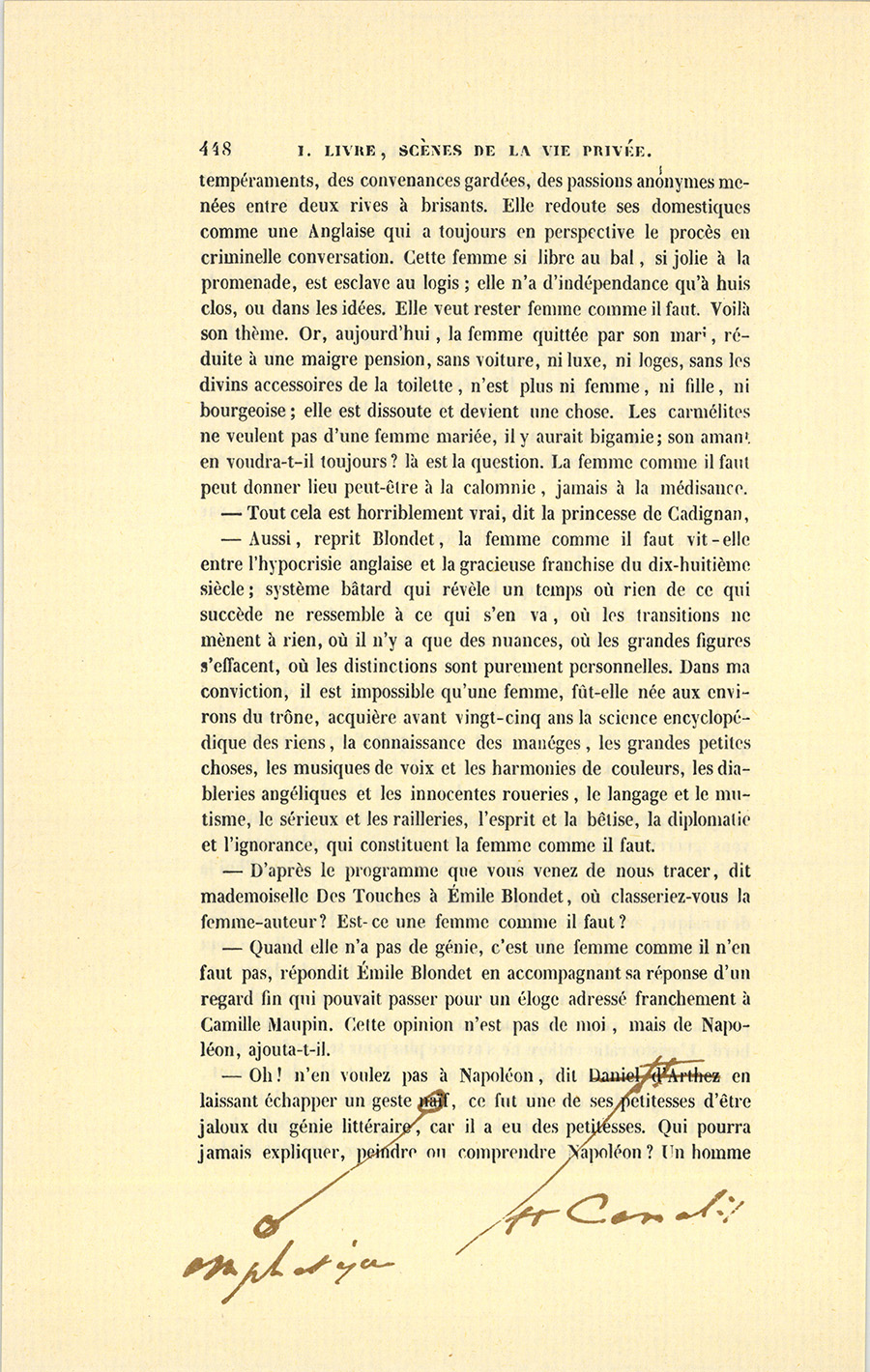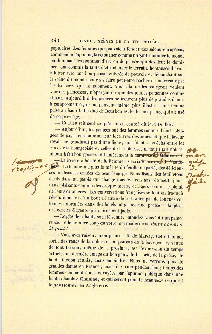 {p. 450} – Sommes-nous donc si réellement diminuées que ces messieurs le pensent ? dit la princesse de Cadignan en adressant aux femmes un sourire à la fois douteur et moqueur. Parce qu’aujourd’hui, sous un régime qui rapetisse toutes choses vous aimez les petits plats, les petits appartements, les petits tableaux, les petits articles, les petits journaux, les petits livres, est-ce à dire que les femmes seront aussi moins grandes ? Pourquoi le cœur humain changerait-il, parce que vous changez d’habit ? À toutes les époques les passions seront les mêmes. Je sais d’admirables dévouements, de sublimes souffrances auxquelles manque la publicité, la gloire si vous voulez, qui jadis illustrait les fautes de quelques femmes. Mais pour n’avoir pas sauvé un roi de France, on n’en est pas moins Agnès Sorel. Croyez-vous que notre chère marquise d’Espard ne vaille pas madame Doublet ou madame du Deffant, chez qui l’on disait et l’on faisait tant de mal ? Taglioni ne vaut-elle pas Camargo ? Malibran n’est-elle pas égale à la Saint-Huberti ? nos poètes ne sont-ils pas supérieurs à ceux du dix-huitième siècle ? Si, dans ce moment, par la faute des épiciers qui gouvernent, nous n’avons pas de genre à nous, l’Empire n’a-t-il pas eu son cachet de même que le siècle de Louis XV, et sa splendeur ne fut-elle pas fabuleuse ? les sciences ont-elles perdu ?