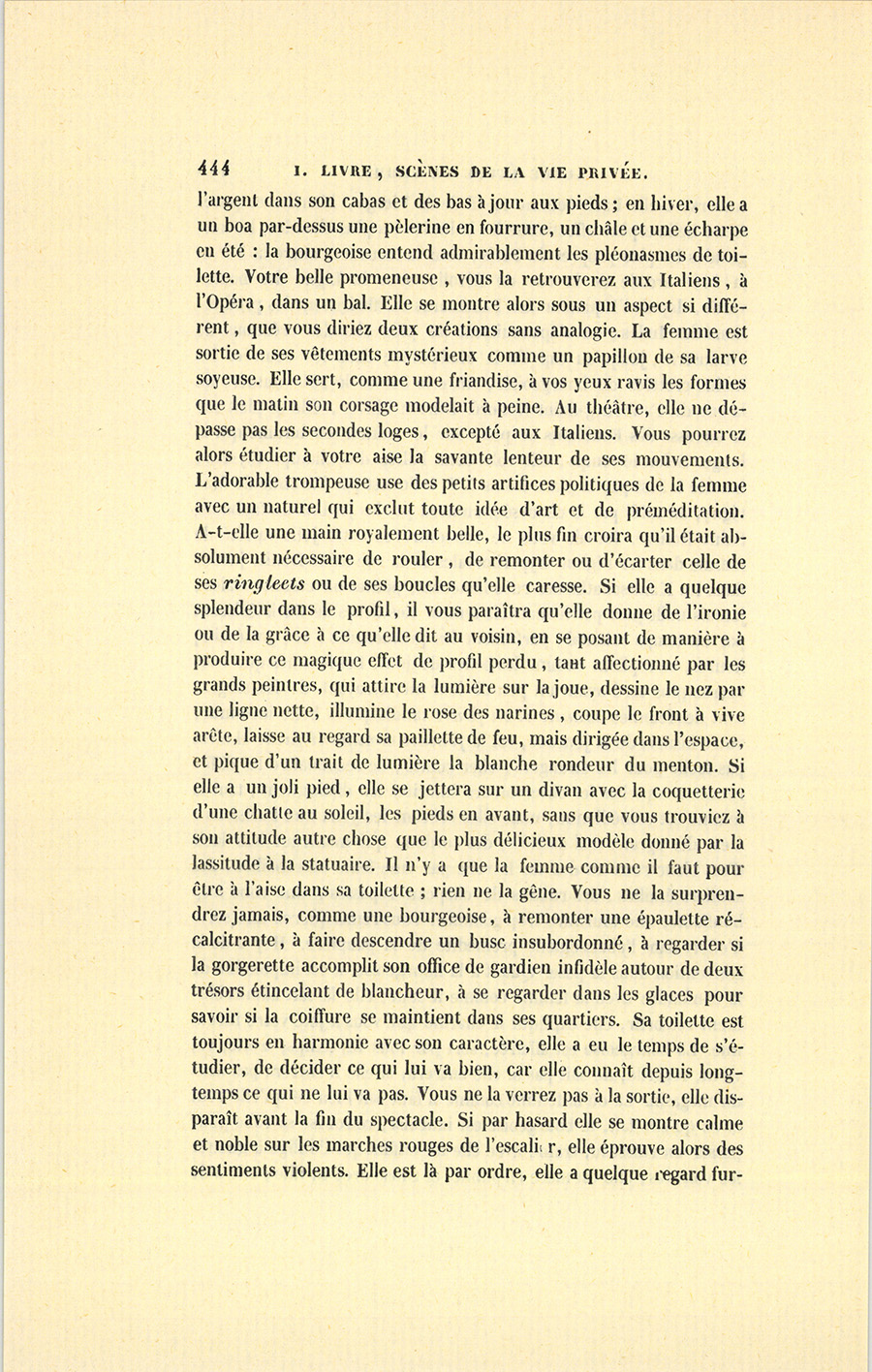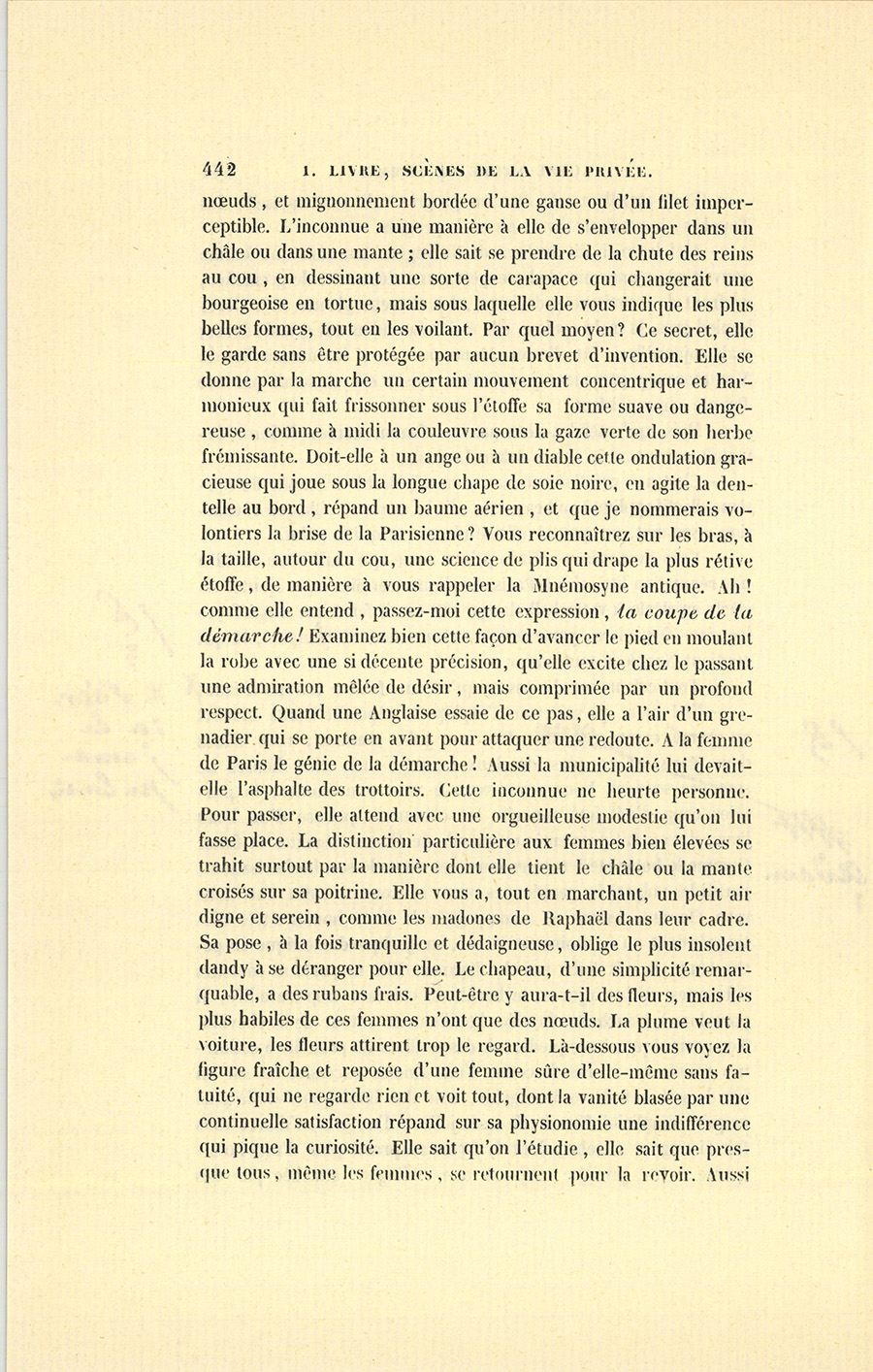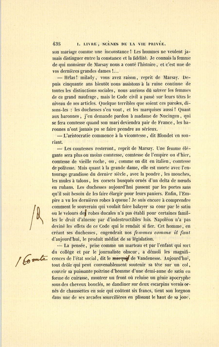 – La pensée, prise comme un marteau et par l’enfant qui sort du collége et par le journaliste obscur, a démoli les magnificences de l’état social, dit le comte de Vandenesse. Aujourd’hui, tout drôle qui peut convenablement soutenir sa tête sur un col, couvrir sa puissante poitrine d’homme d’une demi-aune de satin en forme de cuirasse, montrer un front où reluise un génie apocryphe sous des cheveux bouclés, se dandiner sur deux escarpins vernis ornés de chaussettes en soie qui coûtent six francs, tient son lorgnon dans une de ses arcades sourcilières en plissant le haut de sa joue, {p. 439} et, fût-il clerc d’avoué, fils d’entrepreneur ou bâtard de banquier, il toise impertinemment la plus jolie duchesse, l’évalue quand elle descend l’escalier d’un théâtre, et dit à son ami habillé par Buisson, chez qui nous nous habillons tous, et monté sur vernis comme le premier duc venu : – Voilà, mon cher, une femme comme il faut.