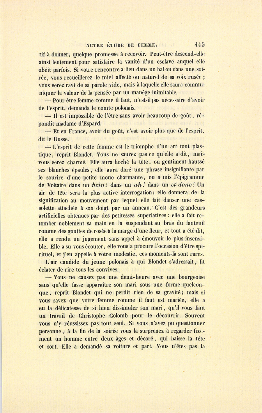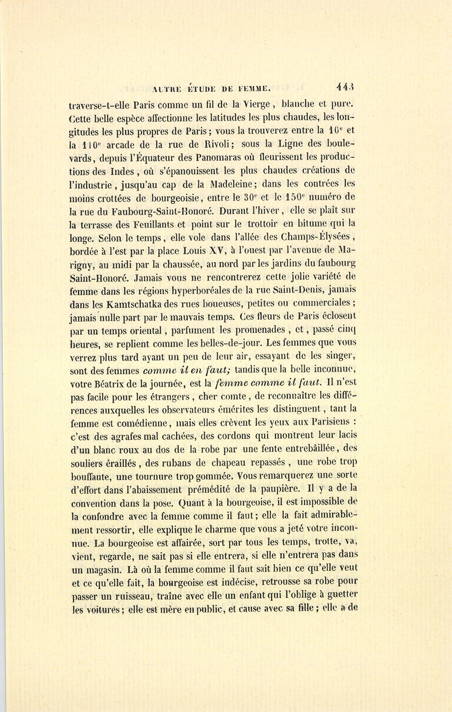 – Ce discours, cher comte Adam, dit Blondet en regardant le Polonais, vous démontrera que la femme comme il faut ne représente pas moins le gâchis intellectuel que le gâchis politique, de même qu’elle est entourée des brillants et peu solides produits d’une industrie qui pense sans cesse à détruire ses œuvres pour les remplacer. Vous sortirez de chez elle en vous disant : Elle a décidément de la supériorité dans les idées ! Vous le croirez d’autant plus qu’elle aura sondé votre cœur et votre esprit d’une main délicate, elle vous aura demandé vos secrets ; car la femme comme il faut paraît tout ignorer pour tout apprendre ; il y a des choses qu’elle ne sait jamais, même quand elle les sait. Seulement vous serez inquiet, vous ignorerez l’état de son cœur. Autrefois les grandes dames aimaient avec affiches, journal à la main et annonces ; aujourd’hui la femme comme il faut a sa petite passion réglée comme un papier de musique, avec ses croches, ses noires, ses blanches, ses soupirs, ses points d’orgue, ses dièzes à la clef. Faible femme, elle ne veut compromettre ni son amour, ni son mari, ni l’avenir de ses enfants. Aujourd’hui le nom, la position, la fortune ne sont plus des pavillons assez respectés pour couvrir toutes les marchandises à bord. L’aristocratie entière ne s’avance plus pour servir de paravent à une femme en faute. La femme comme il faut n’a donc point, comme la grande dame d’autrefois, une allure de haute lutte, elle ne peut rien briser sous son pied, c’est elle qui serait brisée. Aussi est-elle la femme des jésuitiques mezzo termine, des plus louches {p. 448} tempéraments, des convenances gardées, des passions anonymes menées entre deux rives à brisants. Elle redoute ses domestiques comme une Anglaise qui a toujours en perspective le procès en criminelle conversation. Cette femme si libre au bal, si jolie à la promenade, est esclave au logis ; elle n’a d’indépendance qu’à huis clos, ou dans les idées. Elle veut rester femme comme il faut. Voilà son thème. Or, aujourd’hui, la femme quittée par son mari, réduite à une maigre pension, sans voiture, ni luxe, ni loges, sans les divins accessoires de la toilette, n’est plus ni femme, ni fille, ni bourgeoise ; elle est dissoute et devient une chose. Les carmélites ne veulent pas d’une femme mariée, il y aurait bigamie ; son amant en voudra-t-il toujours ? là est la question. La femme comme il faut peut donner lieu peut-être à la calomnie, jamais à la médisance.