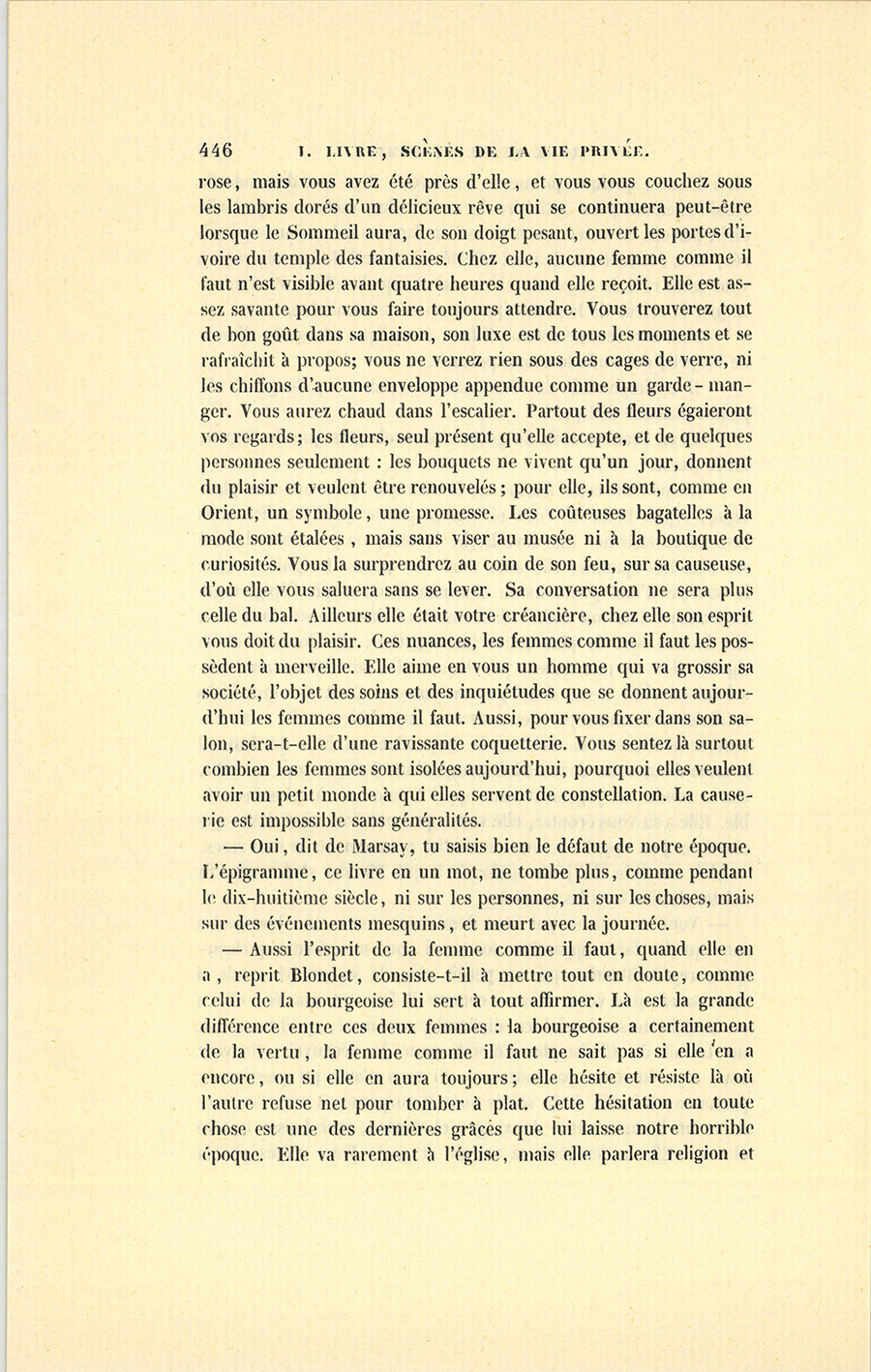 – Vous ne causez pas une demi-heure avec une bourgeoise sans qu’elle fasse apparaître son mari sous une forme quelconque, reprit Blondet qui ne perdit rien de sa gravité ; mais si vous savez que votre femme comme il faut est mariée, elle a eu la délicatesse de si bien dissimuler son mari, qu’il vous faut un travail de Christophe Colomb pour le découvrir. Souvent vous n’y réussissez pas tout seul. Si vous n’avez pu questionner personne, à la fin de la soirée vous la surprenez à regarder fixement un homme entre deux âges et décoré, qui baisse la tête et sort. Elle a demandé sa voiture et part. Vous n’êtes pas la {p. 446} rose, mais vous avez été près d’elle, et vous vous couchez sous les lambris dorés d’un délicieux rêve qui se continuera peut-être lorsque le Sommeil aura, de son doigt pesant, ouvert les portes d’ivoire du temple des fantaisies. Chez elle, aucune femme comme il faut n’est visible avant quatre heures quand elle reçoit. Elle est assez savante pour vous faire toujours attendre. Vous trouverez tout de bon goût dans sa maison, son luxe est de tous les moments et se rafraîchit à propos ; vous ne verrez rien sous des cages de verre, ni les chiffons d’aucune enveloppe appendue comme un garde-manger. Vous aurez chaud dans l’escalier. Partout des fleurs égaieront vos regards ; les fleurs, seul présent qu’elle accepte, et de quelques personnes seulement : les bouquets ne vivent qu’un jour, donnent du plaisir et veulent être renouvelés ; pour elle, ils sont, comme en Orient, un symbole, une promesse. Les coûteuses bagatelles à la mode sont étalées, mais sans viser au musée ni à la boutique de curiosités. Vous la surprendrez au coin de son feu, sur sa causeuse, d’où elle vous saluera sans se lever. Sa conversation ne sera plus celle du bal. Ailleurs elle était votre créancière, chez elle son esprit vous doit du plaisir. Ces nuances, les femmes comme il faut les possèdent à merveille. Elle aime en vous un homme qui va grossir sa société, l’objet des soins et des inquiétudes que se donnent aujourd’hui les femmes comme il faut. Aussi, pour vous fixer dans son salon, sera-t-elle d’une ravissante coquetterie. Vous sentez là surtout combien les femmes sont isolées aujourd’hui, pourquoi elles veulent avoir un petit monde à qui elles servent de constellation. La causerie est impossible sans généralités.