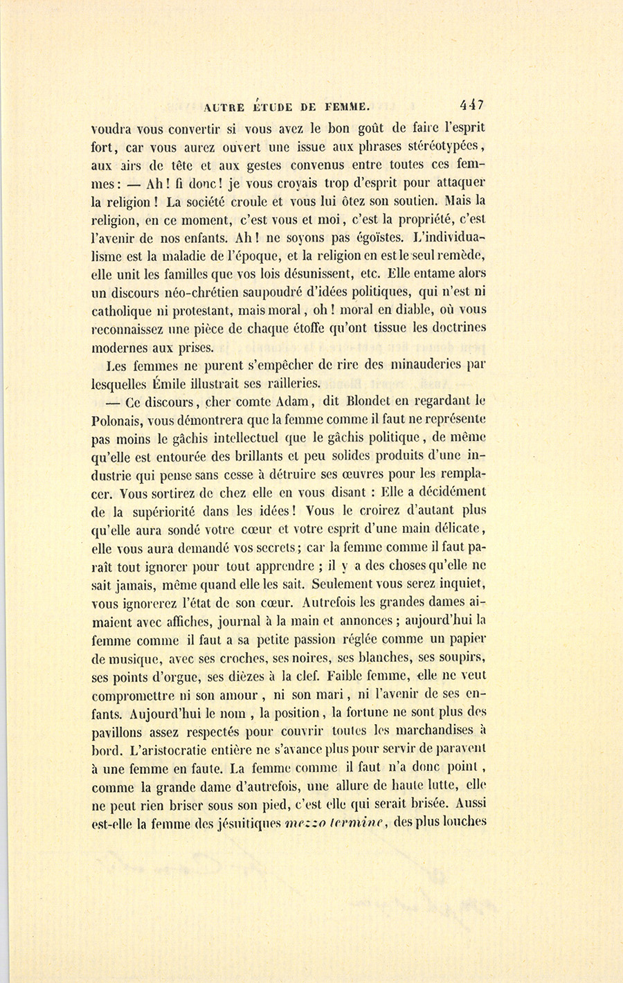 – Aussi l’esprit de la femme comme il faut, quand elle en a, reprit Blondet, consiste-t-il à mettre tout en doute, comme celui de la bourgeoise lui sert à tout affirmer. Là est la grande différence entre ces deux femmes : la bourgeoise a certainement de la vertu, la femme comme il faut ne sait pas si elle en a encore, ou si elle en aura toujours ; elle hésite et résiste là où l’autre refuse net pour tomber à plat. Cette hésitation en toute chose est une des dernières grâces que lui laisse notre horrible époque. Elle va rarement à l’église, mais elle parlera religion et {p. 447} voudra vous convertir si vous avez le bon goût de faire l’esprit fort, car vous aurez ouvert une issue aux phrases stéréotypées, aux airs de tête et aux gestes convenus entre toutes ces femmes : – Ah ! fi donc ! je vous croyais trop d’esprit pour attaquer la religion ! La société croule et vous lui ôtez son soutien. Mais la religion, en ce moment, c’est vous et moi, c’est la propriété, c’est l’avenir de nos enfants. Ah ! ne soyons pas égoïstes. L’individualisme est la maladie de l’époque, et la religion en est le seul remède, elle unit les familles que vos lois désunissent, etc. Elle entame alors un discours néo-chrétien saupoudré d’idées politiques, qui n’est ni catholique ni protestant, mais moral, oh ! moral en diable, où vous reconnaissez une pièce de chaque étoffe qu’ont tissue les doctrines modernes aux prises.
