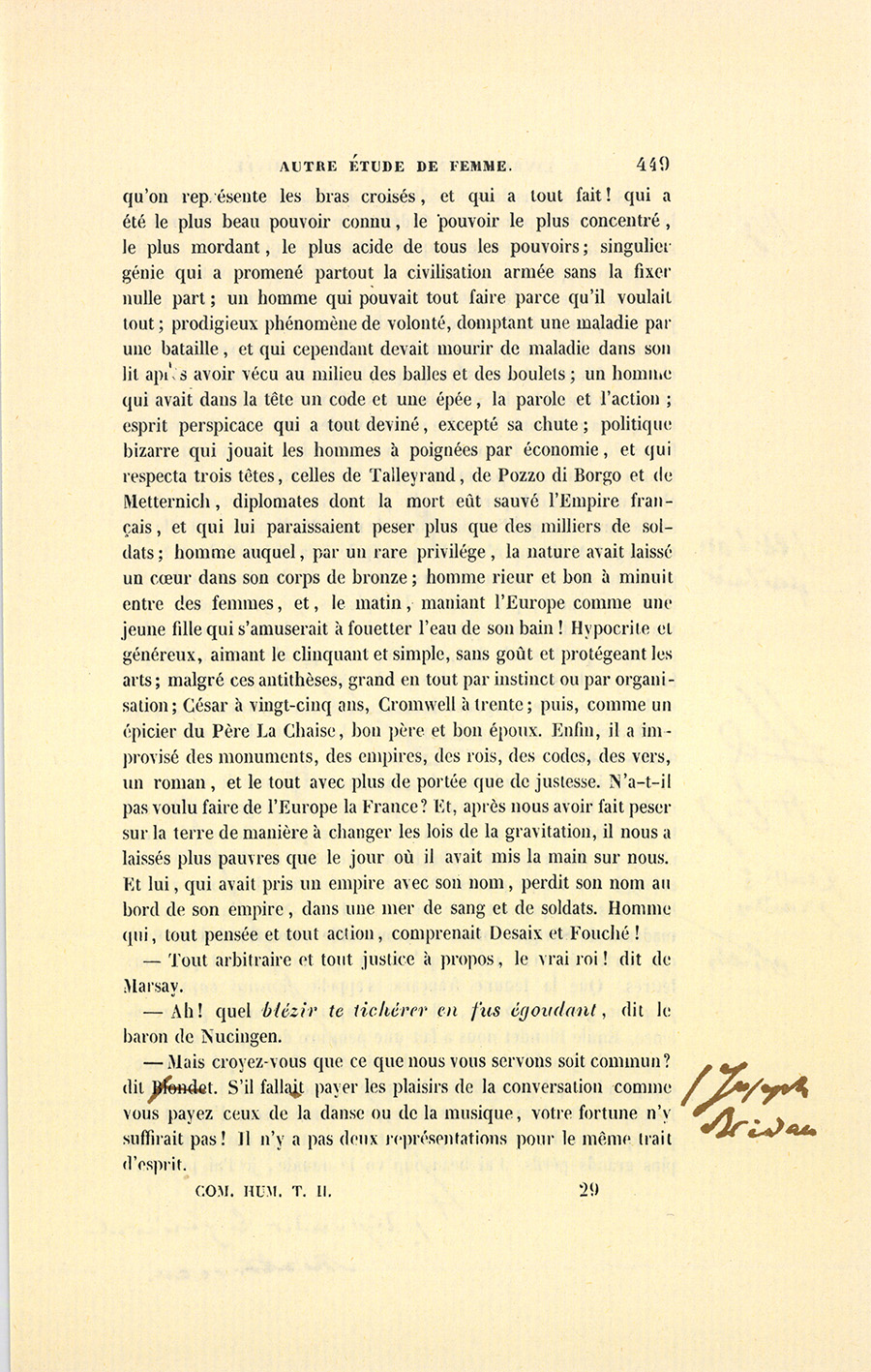 – Oh ! n’en voulez pas à Napoléon, dit Canalis en laissant échapper un geste emphatique, ce fut une de ses petitesses d’être jaloux du génie littéraire, car il a eu des petitesses. Qui pourra jamais expliquer, peindre ou comprendre Napoléon ? Un homme {p. 449} qu’on représente les bras croisés, et qui a tout fait ! qui a été le plus beau pouvoir connu, le pouvoir le plus concentré, le plus mordant, le plus acide de tous les pouvoirs ; singulier génie qui a promené partout la civilisation armée sans la fixer nulle part ; un homme qui pouvait tout faire parce qu’il voulait tout ; prodigieux phénomène de volonté, domptant une maladie par une bataille, et qui cependant devait mourir de maladie dans son lit après avoir vécu au milieu des balles et des boulets ; un homme qui avait dans la tête un code et une épée, la parole et l’action ; esprit perspicace qui a tout deviné, excepté sa chute ; politique bizarre qui jouait les hommes à poignées par économie, et qui respecta trois têtes, celles de Talleyrand, de Pozzo di Borgo et de Metternich, diplomates dont la mort eût sauvé l’Empire français, et qui lui paraissaient peser plus que des milliers de soldats ; homme auquel, par un rare privilége, la nature avait laissé un cœur dans son corps de bronze ; homme rieur et bon à minuit entre des femmes, et, le matin, maniant l’Europe comme une jeune fille qui s’amuserait à fouetter l’eau de son bain ! Hypocrite et généreux, aimant le clinquant et simple, sans goût et protégeant les arts ; malgré ces antithèses, grand en tout par instinct ou par organisation ; César à vingt-cinq ans, Cromwell à trente ; puis, comme un épicier du Père La Chaise, bon père et bon époux. Enfin, il a improvisé des monuments, des empires, des rois, des codes, des vers, un roman, et le tout avec plus de portée que de justesse. N’a-t-il pas voulu faire de l’Europe la France ? Et, après nous avoir fait peser sur la terre de manière à changer les lois de la gravitation, il nous a laissés plus pauvres que le jour où il avait mis la main sur nous. Et lui, qui avait pris un empire avec son nom, perdit son nom au bord de son empire, dans une mer de sang et de soldats. Homme qui, tout pensée et tout action, comprenait Desaix et Fouché !