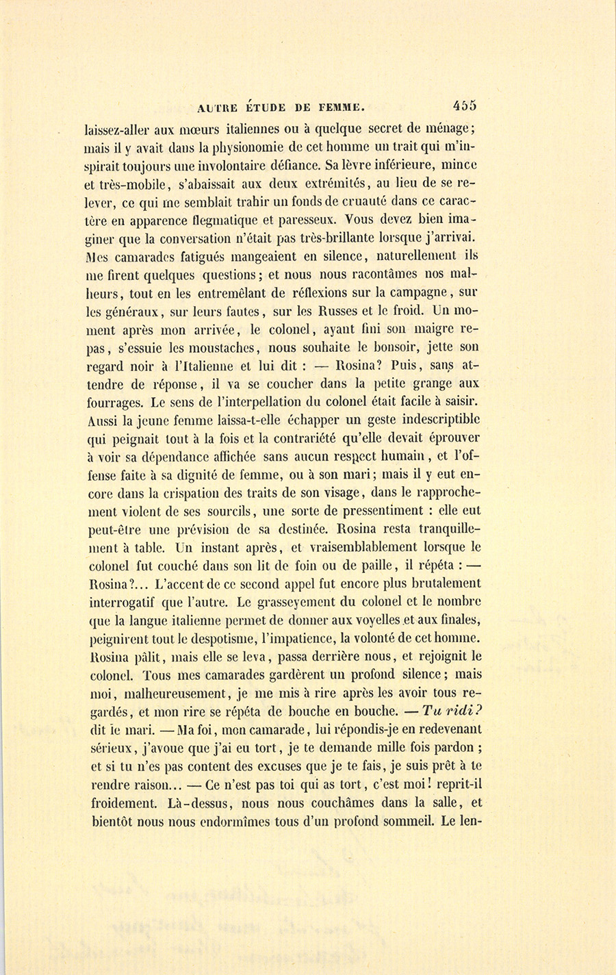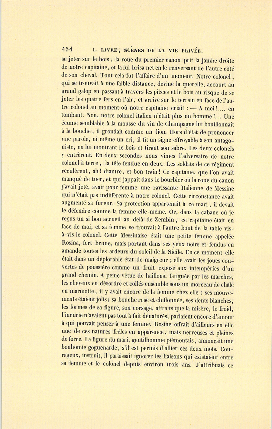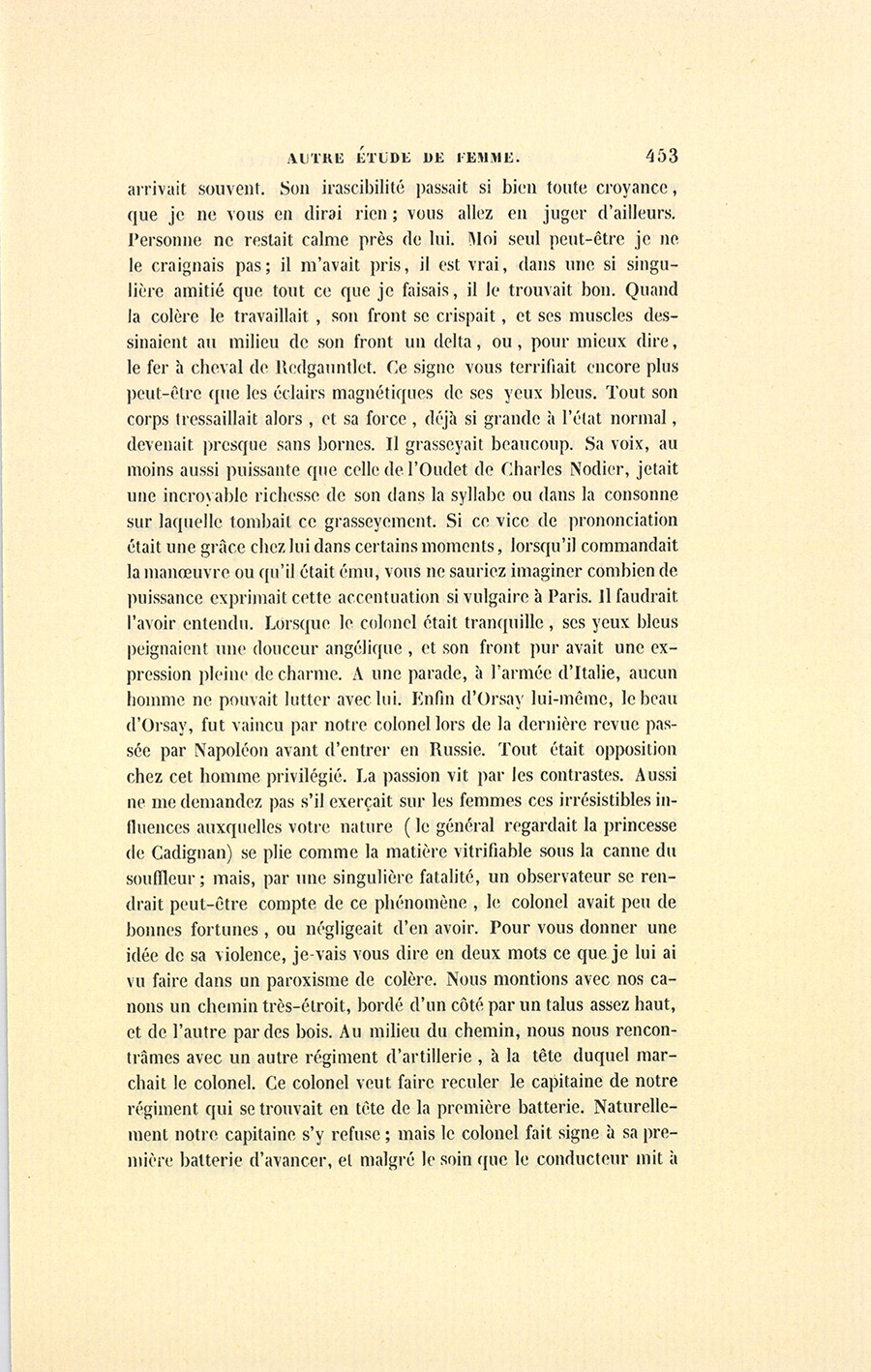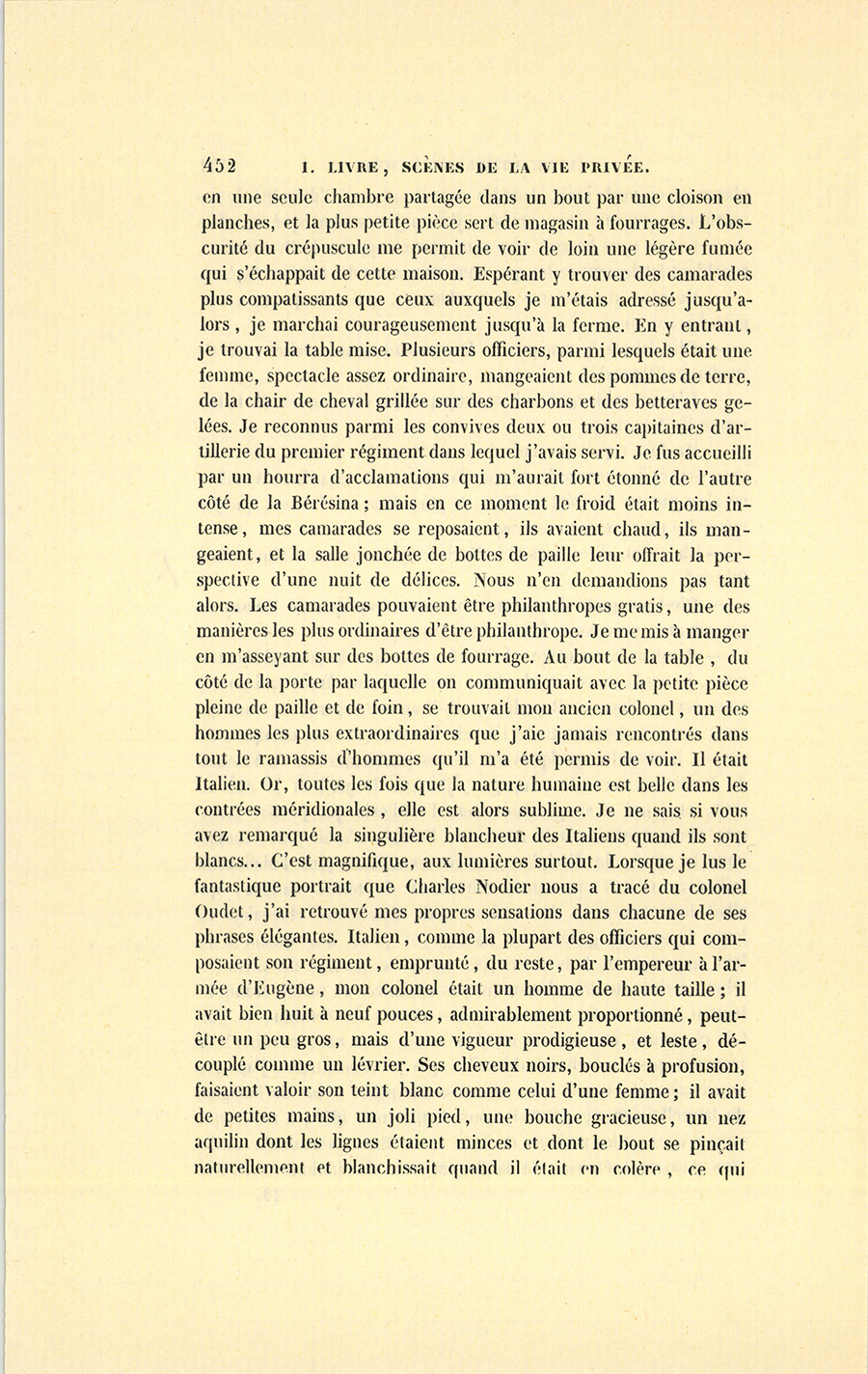 – Pendant la campagne de 1812, dit alors le général Montriveau, je fus la cause involontaire d’un malheur affreux qui pourra vous servir, docteur Bianchon, dit-il en me regardant, vous qui vous occupez beaucoup de l’esprit humain en vous occupant du corps, à résoudre quelques-uns de vos problèmes sur la Volonté. Je faisais ma seconde campagne, j’aimais le péril et je riais de tout, en jeune et simple lieutenant d’artillerie que j’étais ! Lorsque nous arrivâmes à la Bérésina, l’armée n’avait plus, comme vous le savez, de discipline, et ne connaissait plus l’obéissance militaire. C’était un ramas d’hommes de toutes nations, qui allait instinctivement du nord au midi. Les soldats chassaient de leurs foyers un général en haillons et pieds nus quand il ne leur apportait ni bois ni vivres. Après le passage de cette célèbre rivière, le désordre ne fut pas moindre. Je sortais tranquillement, tout seul, sans vivres, des marais de Zembin, et j’allais cherchant une maison où l’on voulût bien me recevoir. N’en trouvant pas, ou chassé de celles que je rencontrais, j’aperçus heureusement, vers le soir, une mauvaise petite ferme de Pologne, de laquelle rien ne pourrait vous donner une idée, à moins que vous n’ayez vu les maisons de bois de la Basse-Normandie ou les plus pauvres métairies de la Beauce. Ces habitations consistent {p. 452} en une seule chambre partagée dans un bout par une cloison en planches, et la plus petite pièce sert de magasin à fourrages. L’obscurité du crépuscule me permit de voir de loin une légère fumée qui s’échappait de cette maison. Espérant y trouver des camarades plus compatissants que ceux auxquels je m’étais adressé jusqu’alors, je marchai courageusement jusqu’à la ferme. En y entrant, je trouvai la table mise. Plusieurs officiers, parmi lesquels était une femme, spectacle assez ordinaire, mangeaient des pommes de terre, de la chair de cheval grillée sur des charbons et des betteraves gelées. Je reconnus parmi les convives deux ou trois capitaines d’artillerie du premier régiment dans lequel j’avais servi. Je fus accueilli par un hourra d’acclamations qui m’aurait fort étonné de l’autre côté de la Bérésina ; mais en ce moment le froid était moins intense, mes camarades se reposaient, ils avaient chaud, ils mangeaient, et la salle jonchée de bottes de paille leur offrait la perspective d’une nuit de délices. Nous n’en demandions pas tant alors. Les camarades pouvaient être philanthropes gratis, une des manières les plus ordinaires d’être philanthrope. Je me mis à manger en m’asseyant sur des bottes de fourrage. Au bout de la table, du côté de la porte par laquelle on communiquait avec la petite pièce pleine de paille et de foin, se trouvait mon ancien colonel, un des hommes les plus extraordinaires que j’aie jamais rencontrés dans tout le ramassis d’hommes qu’il m’a été permis de voir. Il était Italien. Or, toutes les fois que la nature humaine est belle dans les contrées méridionales, elle est alors sublime. Je ne sais si vous avez remarqué la singulière blancheur des Italiens quand ils sont blancs… C’est magnifique, aux lumières surtout. Lorsque je lus le fantastique portrait que Charles Nodier nous a tracé du colonel Oudet, j’ai retrouvé mes propres sensations dans chacune de ses phrases élégantes. Italien, comme la plupart des officiers qui composaient son régiment, emprunté, du reste, par l’empereur à l’armée d’Eugène, mon colonel était un homme de haute taille ; il avait bien huit à neuf pouces, admirablement proportionné, peut-être un peu gros, mais d’une vigueur prodigieuse, et leste, découplé comme un lévrier. Ses cheveux noirs, bouclés à profusion, faisaient valoir son teint blanc comme celui d’une femme ; il avait de petites mains, un joli pied, une bouche gracieuse, un nez aquilin dont les lignes étaient minces et dont le bout se pinçait naturellement et blanchissait quand il était en colère, ce qui {p. 453} arrivait souvent. Son irascibilité passait si bien toute croyance, que je ne vous en dirai rien ; vous allez en juger d’ailleurs. Personne ne restait calme près de lui. Moi seul peut-être je ne le craignais pas ; il m’avait pris, il est vrai, dans une si singulière amitié que tout ce que je faisais, il le trouvait bon. Quand la colère le travaillait, son front se crispait, et ses muscles dessinaient au milieu de son front un delta, ou, pour mieux dire, le fer à cheval de Redgauntlet. Ce signe vous terrifiait encore plus peut-être que les éclairs magnétiques de ses yeux bleus. Tout son corps tressaillait alors, et sa force, déjà si grande à l’état normal, devenait presque sans bornes. Il grasseyait beaucoup. Sa voix, au moins aussi puissante que celle de l’Oudet de Charles Nodier, jetait une incroyable richesse de son dans la syllabe ou dans la consonne sur laquelle tombait ce grasseyement. Si ce vice de prononciation était une grâce chez lui dans certains moments, lorsqu’il commandait la manœuvre ou qu’il était ému, vous ne sauriez imaginer combien de puissance exprimait cette accentuation si vulgaire à Paris. Il faudrait l’avoir entendu. Lorsque le colonel était tranquille, ses yeux bleus peignaient une douceur angélique, et son front pur avait une expression pleine de charme. À une parade, à l’armée d’Italie, aucun homme ne pouvait lutter avec lui. Enfin d’Orsay lui-même, le beau d’Orsay, fut vaincu par notre colonel lors de la dernière revue passée par Napoléon avant d’entrer en Russie. Tout était opposition chez cet homme privilégié. La passion vit par les contrastes. Aussi ne me demandez pas s’il exerçait sur les femmes ces irrésistibles influences auxquelles votre nature (le général regardait la princesse de Cadignan) se plie comme la matière vitrifiable sous la canne du souffleur ; mais, par une singulière fatalit