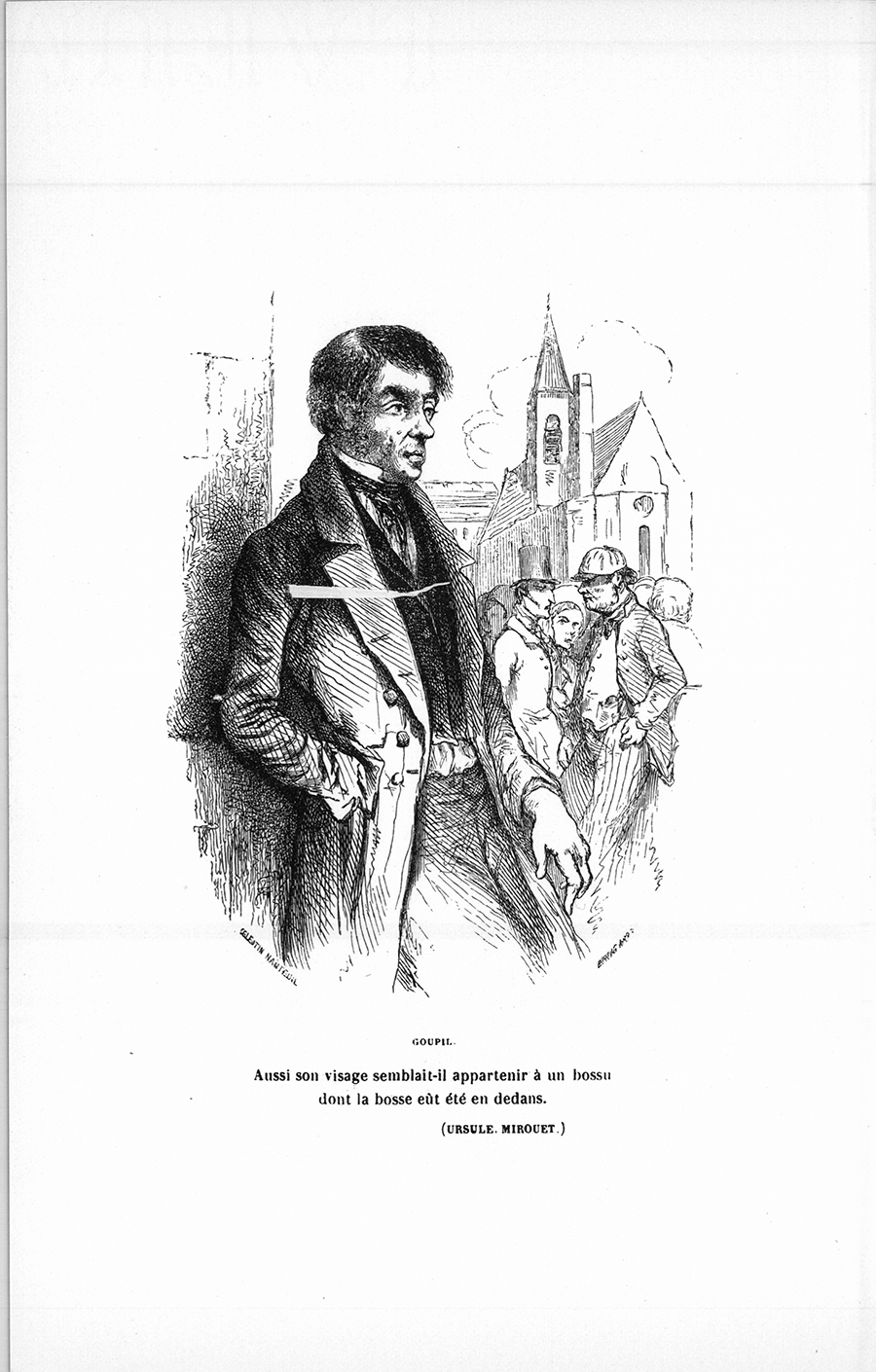 Ce mauvais garçon, nommé Goupil, était le premier clerc de monsieur Crémière-Dionis, le notaire de Nemours. Malgré les antécédents d’une conduite presque crapuleuse, Dionis avait pris Goupil dans son Étude, quand le séjour de Paris, où le clerc avait dissipé la succession de son père, fermier aisé qui le destinait au notariat, lui fut interdit par une complète indigence. En voyant Goupil, vous eussiez aussitôt compris qu’il se fût hâté de jouir de la vie ; car pour obtenir des jouissances, il devait les payer cher. Malgré sa petite taille, le clerc avait à vingt-sept ans le buste développé comme peut l’être celui d’un homme de quarante ans. Des jambes grêles et courtes, une large face au teint brouillé comme un ciel avant l’orage et surmontée d’un front chauve, faisaient encore ressortir cette bizarre conformation. Aussi, son visage semblait-il appartenir à un bossu dont la bosse eût été en dedans. [ill.] Une singularité de ce visage aigre et pâle confirmait l’existence de cette invisible gibbosité. Courbe et tordu comme celui de beaucoup de bossus, le nez se dirigeait de droite à gauche, au lieu de partager exactement la figure. La bouche, contractée aux deux coins, comme celle des Sardes, était toujours sur le qui-vive de l’ironie. La chevelure, rare et roussâtre, tombait par mèches plates et laissait voir le crâne par places. Les mains, grosses et mal emmanchées au bout de bras trop longs, étaient crochues et rarement propres. Goupil portait des souliers bons à jeter au coin d’une borne, et des bas en filoselle d’un noir rougeâtre ; son pantalon et son habit noir, usés jusqu’à la corde et presque gras de crasse ; ses gilets piteux, dont quelques boutons manquaient de moules ; le vieux foulard qui lui servait de cravate, toute sa mise annonçait la cynique misère à laquelle ses passions le condamnaient. Cet ensemble de choses sinistres était dominé par deux yeux de chèvre, une prunelle cerclée de jaune, à la fois lascifs et lâches. Personne n’était plus craint ni plus respecté que Goupil dans Nemours. Armé des prétentions que comportait sa laideur, il avait ce détestable esprit particulier à ceux qui se permettent tout, et l’employait à venger les mécomptes d’une jalousie permanente. Il rimait les couplets satiriques qui se chantent au carnaval, il organisait les charivaris, il faisait à lui seul le petit journal de la ville. Dionis, homme fin et faux, par cela même assez craintif, gardait Goupil autant par peur qu’à cause de son excessive intelligence et {p. 10} de sa connaissance profonde des intérêts du pays. Mais le patron se défiait tant du clerc, qu’il régissait lui-même sa caisse, ne le logeait point chez lui, le tenait à distance, et ne lui confiait aucune affaire secrète ou délicate. Aussi le clerc flattait-il son patron en cachant le ressentiment que lui causait cette conduite, et surveillait-il madame Dionis dans une pensée de vengeance. Doué d’une compréhension vive, il avait le travail facile.