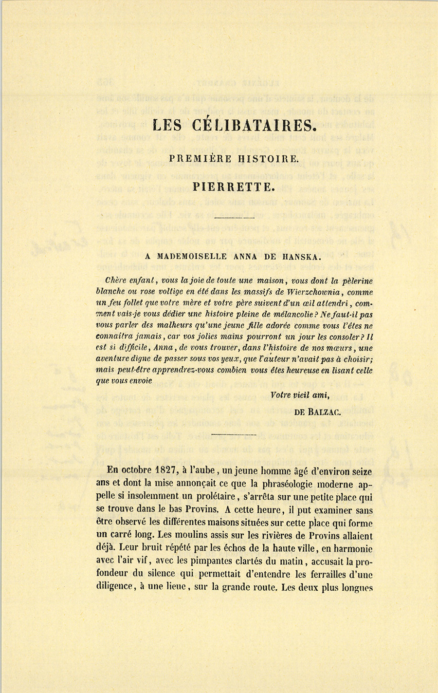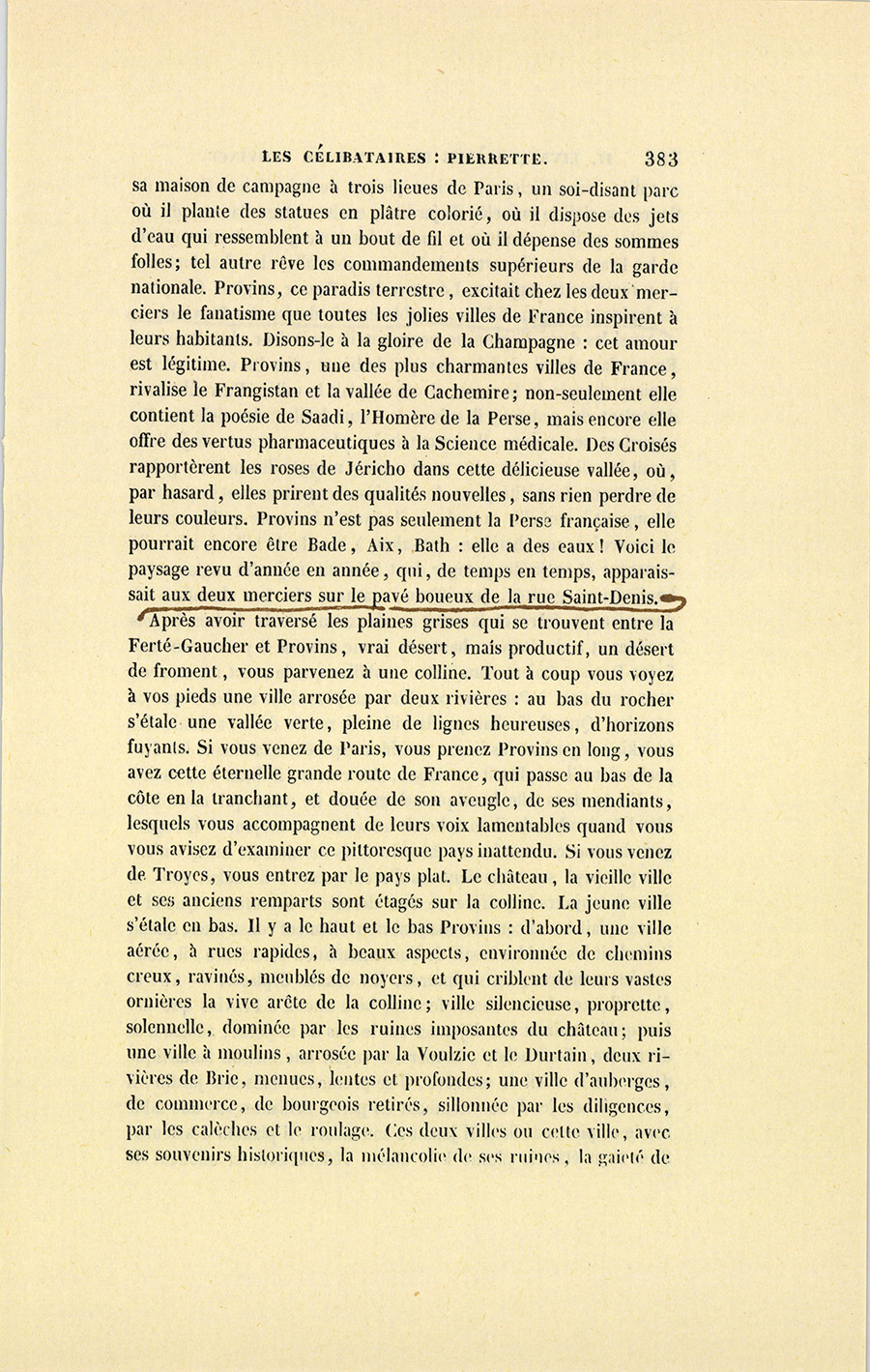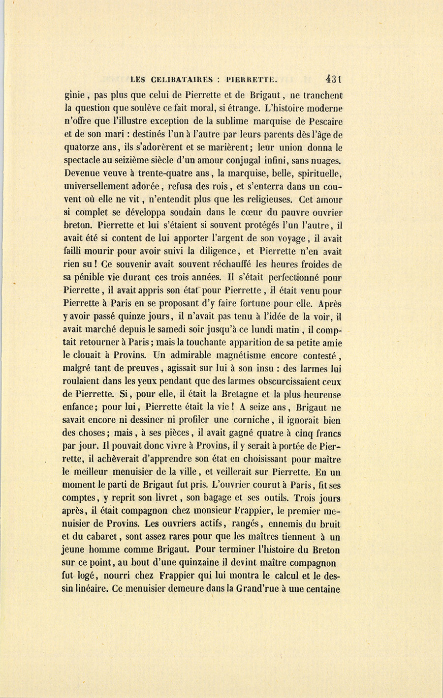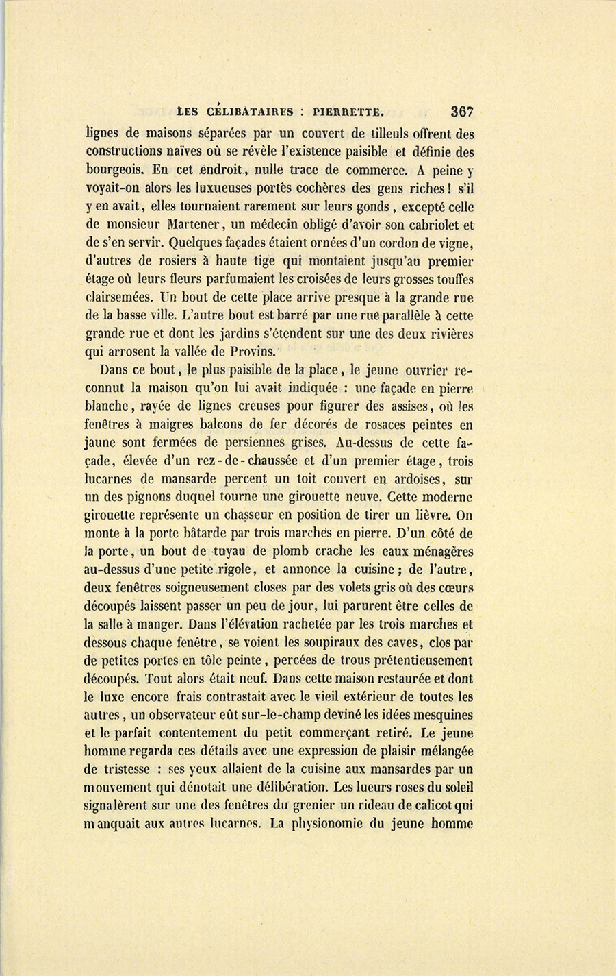 En octobre 1827, à l’aube, un jeune homme âgé d’environ seize ans et dont la mise annonçait ce que la phraséologie moderne appelle si insolemment un prolétaire, s’arrêta sur une petite place qui se trouve dans le bas Provins. À cette heure, il put examiner sans être observé les différentes maisons situées sur cette place qui forme un carré long. Les moulins assis sur les rivières de Provins allaient déjà. Leur bruit répété par les échos de la haute ville, en harmonie avec l’air vif, avec les pimpantes clartés du matin, accusait la profondeur du silence qui permettait d’entendre les ferrailles d’une diligence, à une lieue, sur la grande route. Les deux plus longues {p. 367} lignes de maisons séparées par un couvert de tilleuls offrent des constructions naïves où se révèle l’existence paisible et définie des bourgeois. En cet endroit, nulle trace de commerce. À peine y voyait-on alors les luxueuses portes cochères des gens riches ! s’il y en avait, elles tournaient rarement sur leurs gonds, excepté celle de monsieur Martener, un médecin obligé d’avoir son cabriolet et de s’en servir. Quelques façades étaient ornées d’un cordon de vigne, d’autres de rosiers à haute tige qui montaient jusqu’au premier étage où leurs fleurs parfumaient les croisées de leurs grosses touffes clairsemées. Un bout de cette place arrive presque à la grande rue de la basse ville. L’autre bout est barré par une rue parallèle à cette grande rue et dont les jardins s’étendent sur une des deux rivières qui arrosent la vallée de Provins.