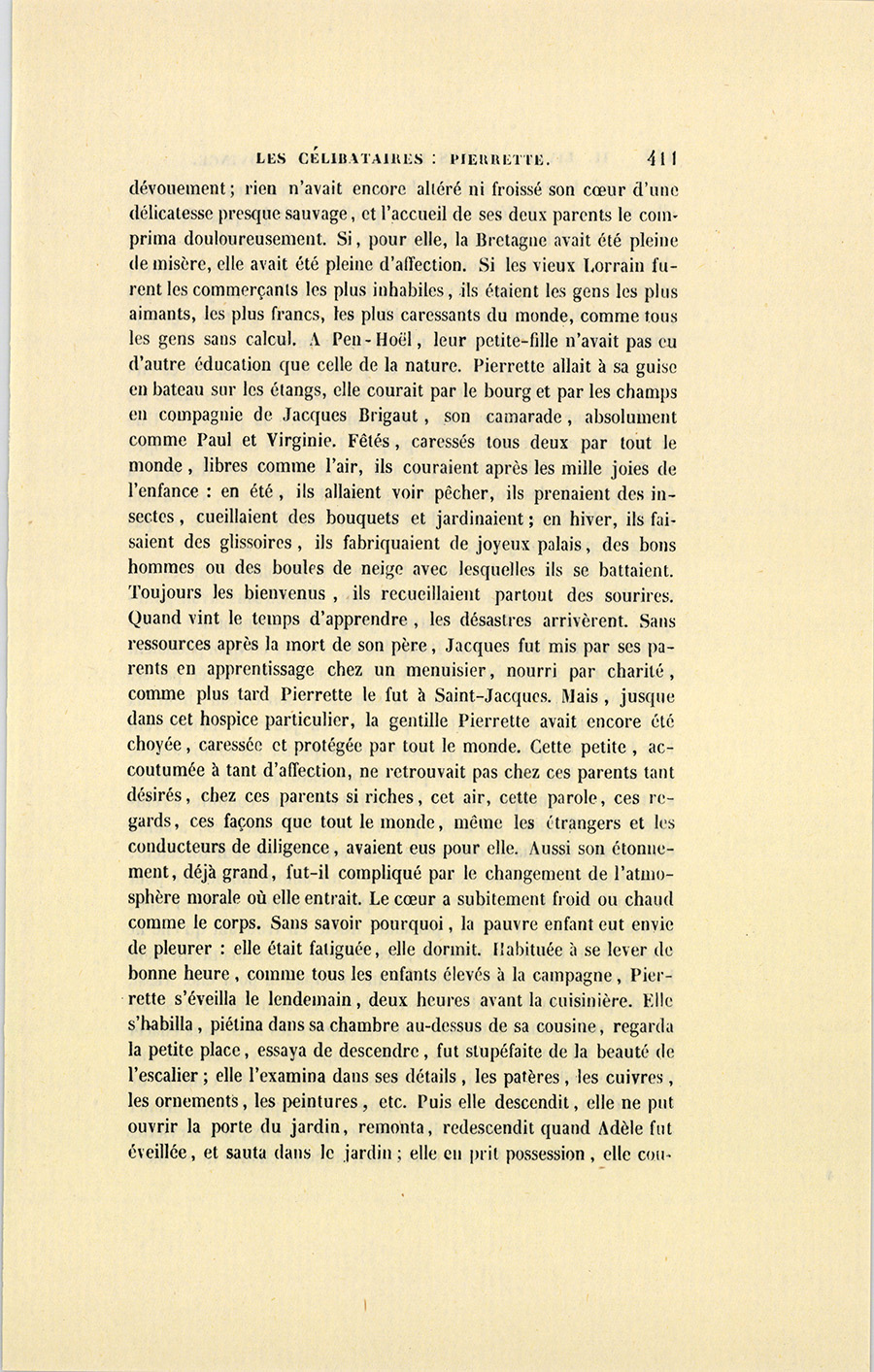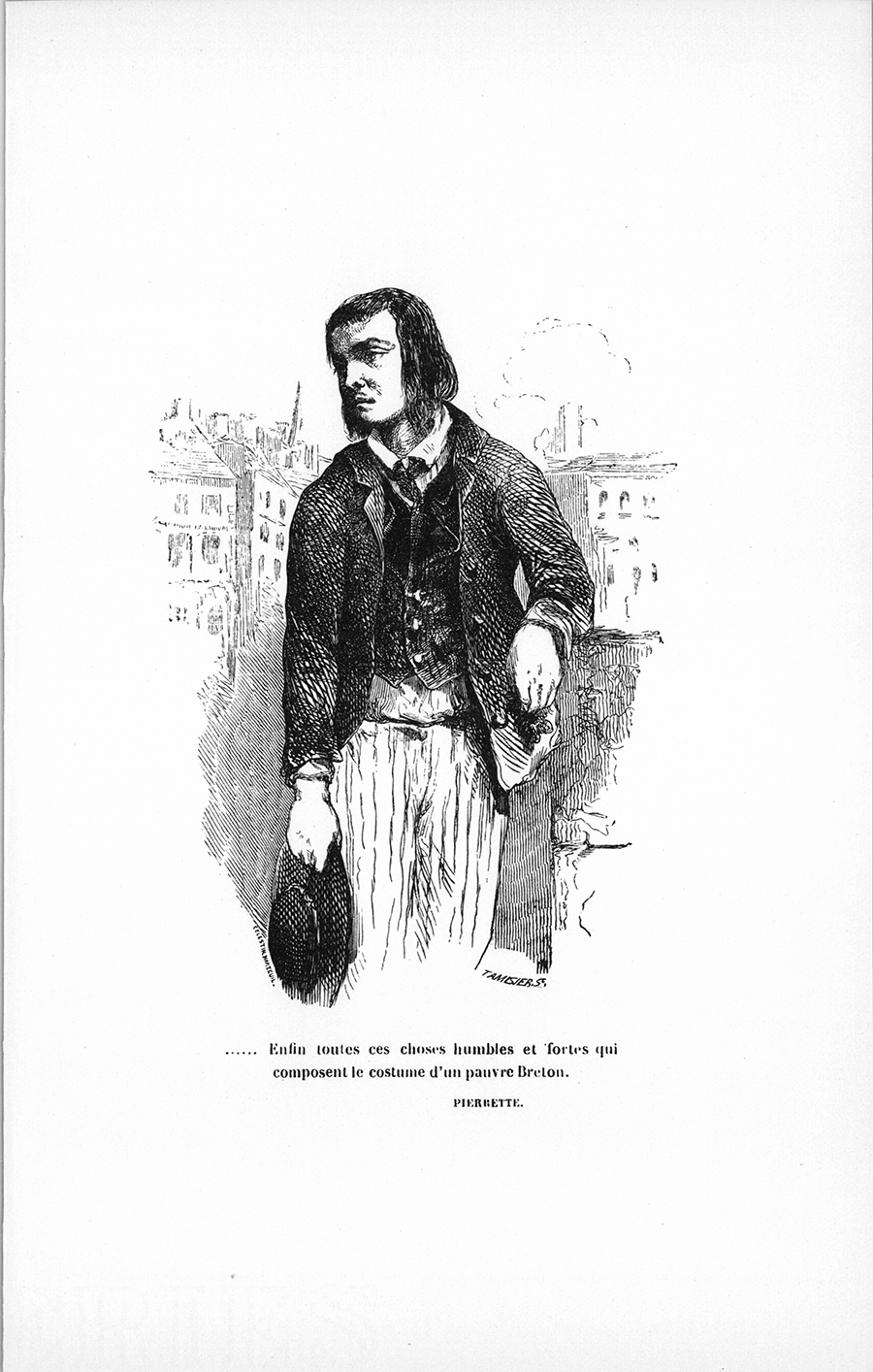 Pierrette ne se recoucha pas. Pour elle, l’arrivée de Brigaut était un événement immense. Pendant la nuit, cet Éden des malheureux, {p. 371} elle échappait aux ennuis, aux tracasseries qu’elle avait à supporter durant la journée. Semblable au héros de je ne sais quelle ballade allemande ou russe, son sommeil lui paraissait être une vie heureuse, et le jour était un mauvais rêve. Après trois années, elle venait d’avoir pour la première fois un réveil agréable. Les souvenirs de son enfance avaient mélodieusement chanté leurs poésies dans son âme. Le premier couplet, elle l’avait entendu en rêve, le second l’avait fait lever en sursaut, au troisième elle avait douté : les malheureux sont de l’école de saint Thomas. Au quatrième couplet, arrivée en chemise et nu-pieds à sa croisée, elle avait reconnu Brigaut, son ami d’enfance. Ah ! c’était bien cette veste carrée à petites basques brusquement coupées et dont les poches ballottent à la chute des reins, la veste de drap bleu classique en Bretagne, le gilet de rouennerie grossière, la chemise de toile fermée par un cœur d’or, le grand col roulé, les boucles d’oreilles, les gros souliers, le pantalon de toile bleue écrue, inégalement déteinte par longueurs de fil, enfin toutes ces choses humbles et fortes qui constituent le costume d’un pauvre Breton. [ill.] Les gros boutons en corne blanche du gilet et de la veste firent battre le cœur de Pierrette. À la vue du bouquet d’ajonc, ses yeux se mouillèrent de larmes, puis une horrible terreur lui comprima dans l’âme les fleurs de son souvenir un moment épanouies. Elle pensa que sa cousine avait pu l’entendre se levant et marchant à sa croisée, elle devina la vieille fille et fit à Brigaut ce signe de frayeur auquel le pauvre Breton s’était empressé d’obéir sans y rien comprendre. Cette soumission instinctive ne peint-elle pas une de ces affections innocentes et absolues comme il y en a, de siècle en siècle, sur cette terre, où elles fleurissent comme l’aloès à l’Isola bella, deux ou trois fois en cent ans ? Qui eût vu Brigaut se sauvant aurait admiré l’héroïsme le plus naïf du plus naïf sentiment. Jacques Brigaut était digne de Pierrette Lorrain, qui finissait sa quatorzième année : deux enfants ! Pierrette ne put s’empêcher de pleurer en le regardant lever le pied avec l’effroi que son geste lui avait communiqué. Puis elle revint s’asseoir sur un méchant fauteuil, en face d’une petite table au-dessus de laquelle se trouvait un miroir. Elle s’y accouda, se mit la tête dans les mains et resta là pensive pendant une heure, occupée à se remémorer le Marais, le bourg de Pen-Hoël, les périlleux voyages entrepris sur un étang dans un bateau détaché pour elle d’un vieux saule par le petit Jacques, puis les vieilles figures de sa grand’mère, de son grand-père, la tête souffrante de sa {p. 372} mère et la belle physionomie du major Brigaut, enfin toute une enfance sans soucis ! Ce fut encore un rêve : des joies lumineuses sur un fond grisâtre. Elle avait ses beaux cheveux cendrés en désordre sous un petit bonnet chiffonné pendant son sommeil, un petit bonnet en percale et à ruches qu’elle s’était fait elle-même. De chaque côté des tempes il passait des boucles échappées de leurs papillottes en papier gris. Derrière la tête, une grosse natte aplatie pendait déroulée. La blancheur excessive de sa figure trahissait une de ces horribles maladies de jeune fille à laquelle la médecine a donné le nom gracieux de chlorose, et qui prive le corps de ses couleurs naturelles, qui trouble l’appétit et annonce de grands désordres dans l’organisme. Ce ton de cire existait dans toute la carnation. Le cou et les épaules expliquaient par leur pâleur d’herbe étiolée la maigreur des bras jetés en avant et croisés. Les pieds de Pierrette paraissaient amollis, amoindris par la maladie. Sa chemise ne tombait qu’à mi-jambe et laissait voir des nerfs fatigués, des veines bleuâtres, une carnation appauvrie. Le froid qui l’atteignit lui rendit les lèvres d’un beau violet. Le triste sourire qui tira les coins de sa bouche assez délicate montra des dents d’un ivoire fin et d’une forme menue, de jolies dents transparentes qui s’accordaient avec ses oreilles fines, avec son nez un peu pointu mais élégant, avec la coupe de son visage qui, malgré sa parfaite rondeur, était mignonne. Toute l’animation de ce charmant visage se trouvait dans des yeux dont l’iris, couleur tabac d’Espagne et mélangé de points noirs, brillait par des reflets d’or autour d’une prunelle profonde et vive. Pierrette avait dû être gaie, elle était triste. Sa gaieté perdue existait encore dans la vivacité des contours de l’œil, dans la grâce ingénue de son front et dans les méplats de son menton court. Ses longs cils se dessinaient comme des pinceaux sur ses pommettes altérées par la souffrance. Le blanc, prodigué outre mesure, rendait d’ailleurs les lignes et les détails de la physionomie très-purs. L’oreille était un petit chef-d’œuvre de sculpture : vous eussiez dit du marbre. Pierrette souffrait de bien des manières. Aussi peut-être voulez-vous son histoire ? la voici.