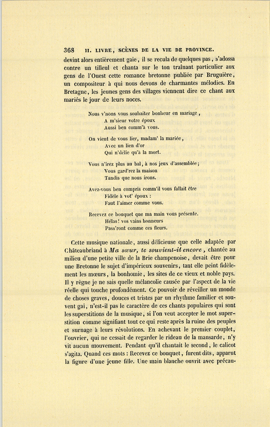 Cette musique nationale, aussi délicieuse que celle adaptée par Châteaubriand à Ma sœur, te souvient-il encore, chantée au milieu d’une petite ville de la Brie champenoise, devait être pour une Bretonne le sujet d’impérieux souvenirs, tant elle peint fidèlement les mœurs, la bonhomie, les sites de ce vieux et noble pays. Il y règne je ne sais quelle mélancolie causée par l’aspect de la vie réelle qui touche profondément. Ce pouvoir de réveiller un monde de choses graves, douces et tristes par un rhythme familier et souvent gai, n’est-il pas le caractère de ces chants populaires qui sont les superstitions de la musique, si l’on veut accepter le mot superstition comme signifiant tout ce qui reste après la ruine des peuples et surnage à leurs révolutions. En achevant le premier couplet, l’ouvrier, qui ne cessait de regarder le rideau de la mansarde, n’y vit aucun mouvement.