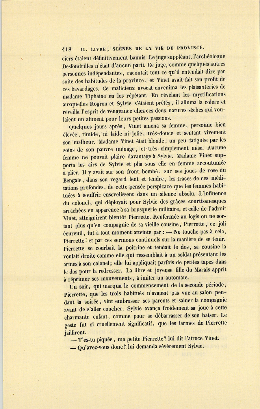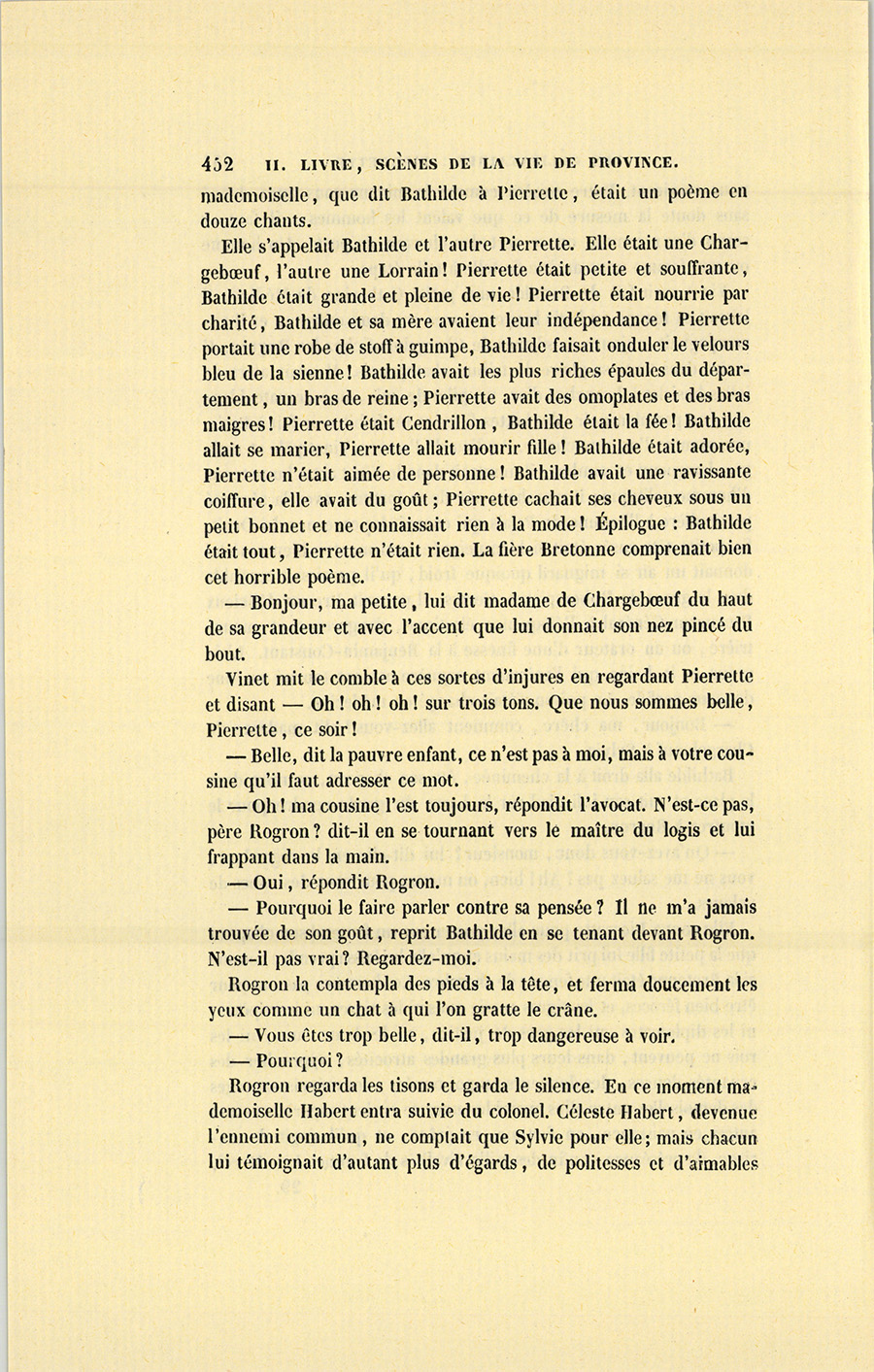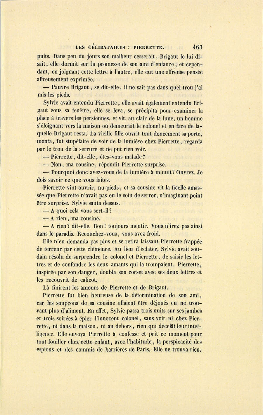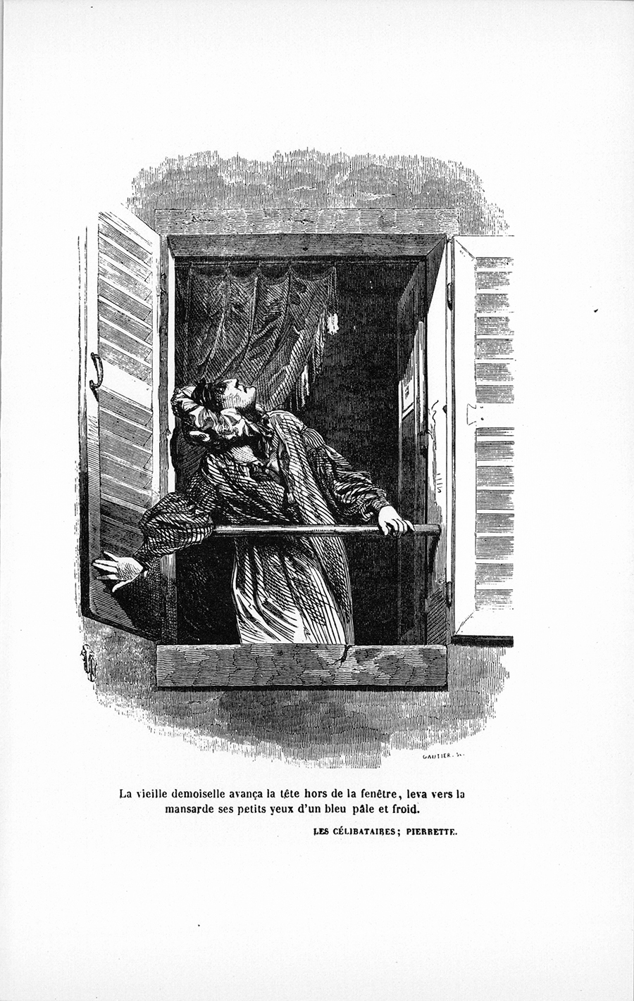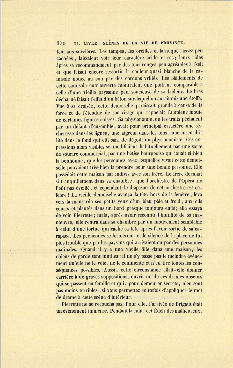 Cette personne était une femme. Aucun homme ne s’arrache aux douceurs du sommeil matinal pour écouter un troubadour en veste, une fille seule se réveille à un chant d’amour. Aussi était-ce une fille, et une vieille fille. Quand elle eut déployé ses persiennes par un geste de chauve-souris, elle regarda dans toutes les directions et n’entendit que vaguement les pas de Brigaut qui s’enfuyait. Y a-t-il rien de plus horrible à voir que la matinale apparition d’une vieille fille laide à sa fenêtre ? De tous les spectacles grotesques qui font la joie des voyageurs quand ils traversent les petites villes, n’est-ce pas le plus déplaisant ? il est trop triste, trop repoussant pour qu’on en rie. Cette vieille fille, à l’oreille si alerte, se présentait dépouillée des artifices en tout genre qu’elle employait pour s’embellir : elle n’avait ni son tour de faux cheveux ni sa collerette. Elle portait cet affreux petit sac en taffetas noir avec lequel les vieilles femmes s’enveloppent l’occiput, et qui dépassait son bonnet de nuit relevé par les mouvements du sommeil. Ce désordre donnait à cette tête l’air menaçant que les peintres {p. 370} prêtent aux sorcières. Les tempes, les oreilles et la nuque, assez peu cachées, laissaient voir leur caractère aride et sec ; leurs rides âpres se recommandaient par des tons rouges peu agréables à l’œil et que faisait encore ressortir la couleur quasi blanche de la camisole nouée au cou par des cordons vrillés. Les bâillements de cette camisole entr’ouverte montraient une poitrine comparable à celle d’une vieille paysanne peu soucieuse de sa laideur. Le bras décharné faisait l’effet d’un bâton sur lequel on aurait mis une étoffe. Vue à sa croisée, cette demoiselle paraissait grande à cause de la force et de l’étendue de son visage qui rappelait l’ampleur inouïe de certaines figures suisses. Sa physionomie, où les traits péchaient par un défaut d’ensemble, avait pour principal caractère une sécheresse dans les lignes, une aigreur dans les tons, une insensibilité dans le fond qui eût saisi de dégoût un physionomiste. Ces expressions alors visibles se modifiaient habituellement par une sorte de sourire commercial, par une bêtise bourgeoise qui jouait si bien la bonhomie, que les personnes avec lesquelles vivait cette demoiselle pouvaient très-bien la prendre pour une bonne personne. Elle possédait cette maison par indivis avec son frère. Le frère dormait si tranquillement dans sa chambre, que l’orchestre de l’Opéra ne l’eût pas éveillé, et cependant le diapason de cet orchestre est célèbre ! La vieille demoiselle avança la tête hors de la fenêtre, leva vers la mansarde ses petits yeux d’un bleu pâle et froid, aux cils courts et plantés dans un bord presque toujours enflé ; elle essaya de voir Pierrette ; mais, après avoir reconnu l’inutilité de sa manœuvre, elle rentra dans sa chambre par un mouvement semblable à celui d’une tortue qui cache sa tête après l’avoir sortie de sa carapace. [ill.] Les persiennes se fermèrent, et le silence de la place ne fut plus troublé que par les paysans qui arrivaient ou par des personnes matinales. Quand il y a une vieille fille dans une maison, les chiens de garde sont inutiles : il ne s’y passe pas le moindre événement qu’elle ne le voie, ne le commente et n’en tire toutes les conséquences possibles. Aussi, cette circonstance allait-elle donner carrière à de graves suppositions, ouvrir un de ces drames obscurs qui se passent en famille et qui, pour demeurer secrets, n’en sont pas moins terribles, si vous permettez toutefois d’appliquer le mot de drame à cette scène d’intérieur.