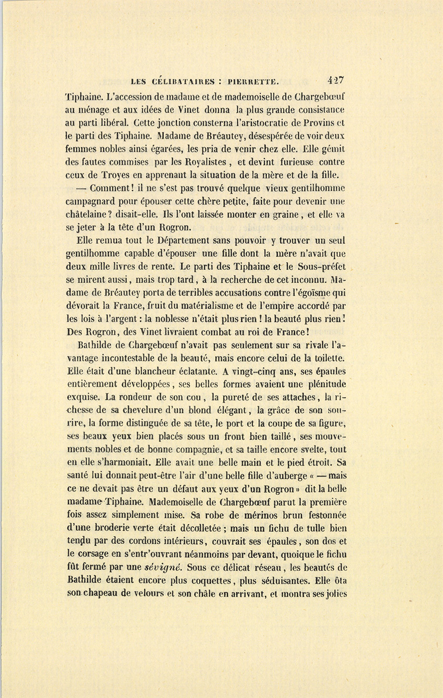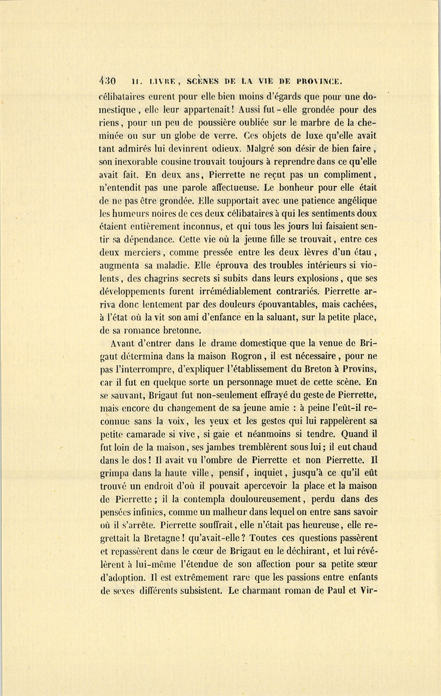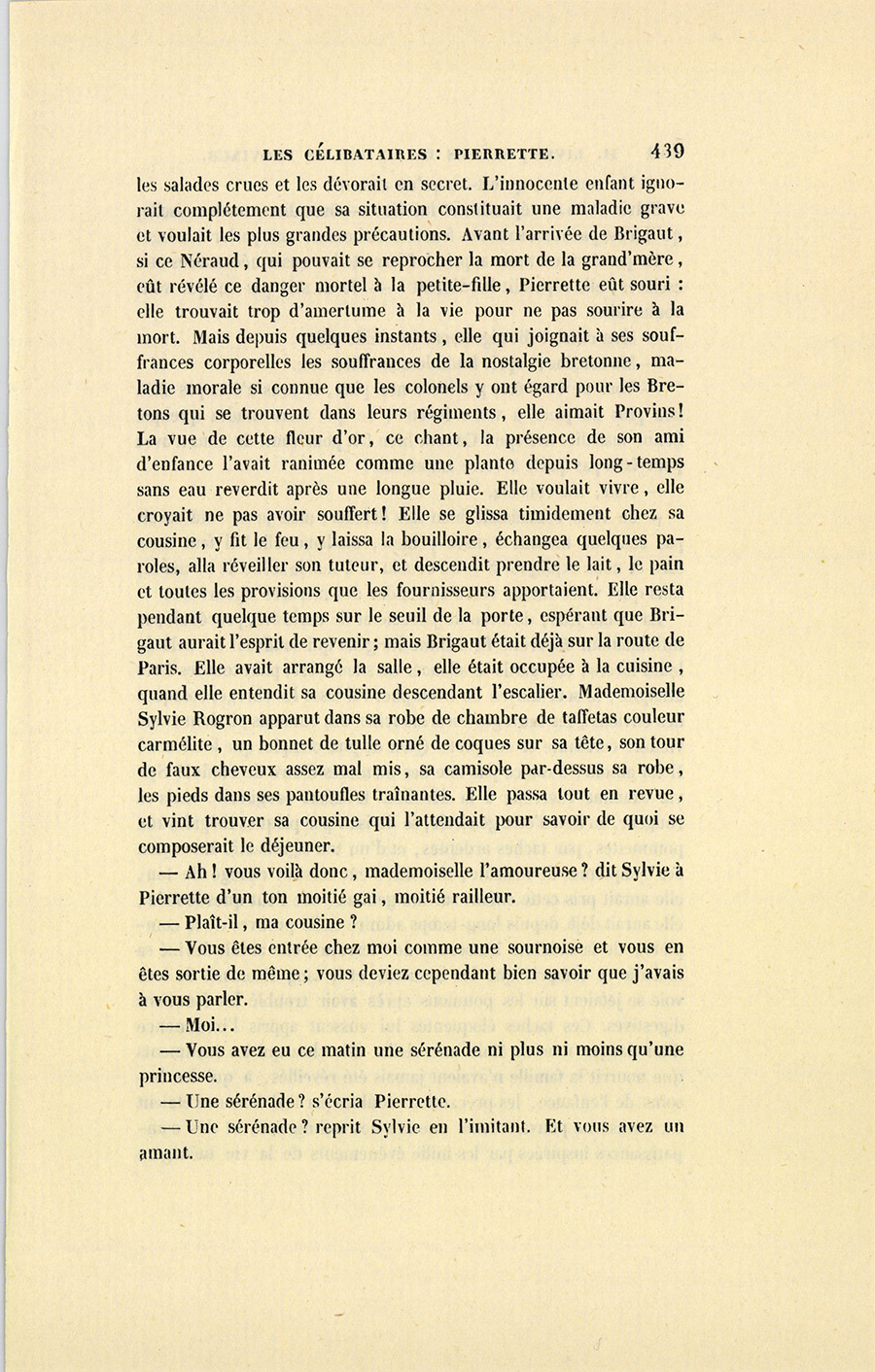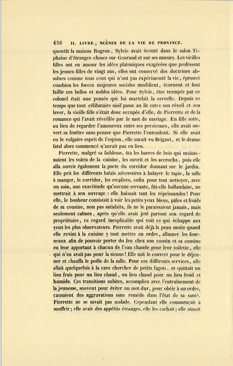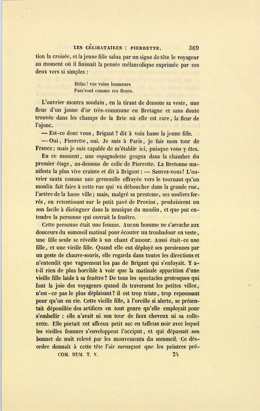 Cette personne était une femme. Aucun homme ne s’arrache aux douceurs du sommeil matinal pour écouter un troubadour en veste, une fille seule se réveille à un chant d’amour. Aussi était-ce une fille, et une vieille fille. Quand elle eut déployé ses persiennes par un geste de chauve-souris, elle regarda dans toutes les directions et n’entendit que vaguement les pas de Brigaut qui s’enfuyait. Y a-t-il rien de plus horrible à voir que la matinale apparition d’une vieille fille laide à sa fenêtre ? De tous les spectacles grotesques qui font la joie des voyageurs quand ils traversent les petites villes, n’est-ce pas le plus déplaisant ? il est trop triste, trop repoussant pour qu’on en rie. Cette vieille fille, à l’oreille si alerte, se présentait dépouillée des artifices en tout genre qu’elle employait pour s’embellir : elle n’avait ni son tour de faux cheveux ni sa collerette. Elle portait cet affreux petit sac en taffetas noir avec lequel les vieilles femmes s’enveloppent l’occiput, et qui dépassait son bonnet de nuit relevé par les mouvements du sommeil. Ce désordre donnait à cette tête l’air menaçant que les peintres {p. 370} prêtent aux sorcières. Les tempes, les oreilles et la nuque, assez peu cachées, laissaient voir leur caractère aride et sec ; leurs rides âpres se recommandaient par des tons rouges peu agréables à l’œil et que faisait encore ressortir la couleur quasi blanche de la camisole nouée au cou par des cordons vrillés. Les bâillements de cette camisole entr’ouverte montraient une poitrine comparable à celle d’une vieille paysanne peu soucieuse de sa laideur. Le bras décharné faisait l’effet d’un bâton sur lequel on aurait mis une étoffe. Vue à sa croisée, cette demoiselle paraissait grande à cause de la force et de l’étendue de son visage qui rappelait l’ampleur inouïe de certaines figures suisses. Sa physionomie, où les traits péchaient par un défaut d’ensemble, avait pour principal caractère une sécheresse dans les lignes, une aigreur dans les tons, une insensibilité dans le fond qui eût saisi de dégoût un physionomiste. Ces expressions alors visibles se modifiaient habituellement par une sorte de sourire commercial, par une bêtise bourgeoise qui jouait si bien la bonhomie, que les personnes avec lesquelles vivait cette demoiselle pouvaient très-bien la prendre pour une bonne personne. Elle possédait cette maison par indivis avec son frère. Le frère dormait si tranquillement dans sa chambre, que l’orchestre de l’Opéra ne l’eût pas éveillé, et cependant le diapason de cet orchestre est célèbre ! La vieille demoiselle avança la tête hors de la fenêtre, leva vers la mansarde ses petits yeux d’un bleu pâle et froid, aux cils courts et plantés dans un bord presque toujours enflé ; elle essaya de voir Pierrette ; mais, après avoir reconnu l’inutilité de sa manœuvre, elle rentra dans sa chambre par un mouvement semblable à celui d’une tortue qui cache sa tête après l’avoir sortie de sa carapace. [ill.] Les persiennes se fermèrent, et le silence de la place ne fut plus troublé que par les paysans qui arrivaient ou par des personnes matinales. Quand il y a une vieille fille dans une maison, les chiens de garde sont inutiles : il ne s’y passe pas le moindre événement qu’elle ne le voie, ne le commente et n’en tire toutes les conséquences possibles. Aussi, cette circonstance allait-elle donner carrière à de graves suppositions, ouvrir un de ces drames obscurs qui se passent en famille et qui, pour demeurer secrets, n’en sont pas moins terribles, si vous permettez toutefois d’appliquer le mot de drame à cette scène d’intérieur.