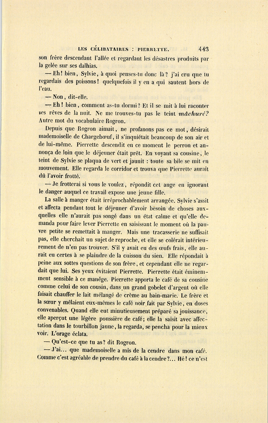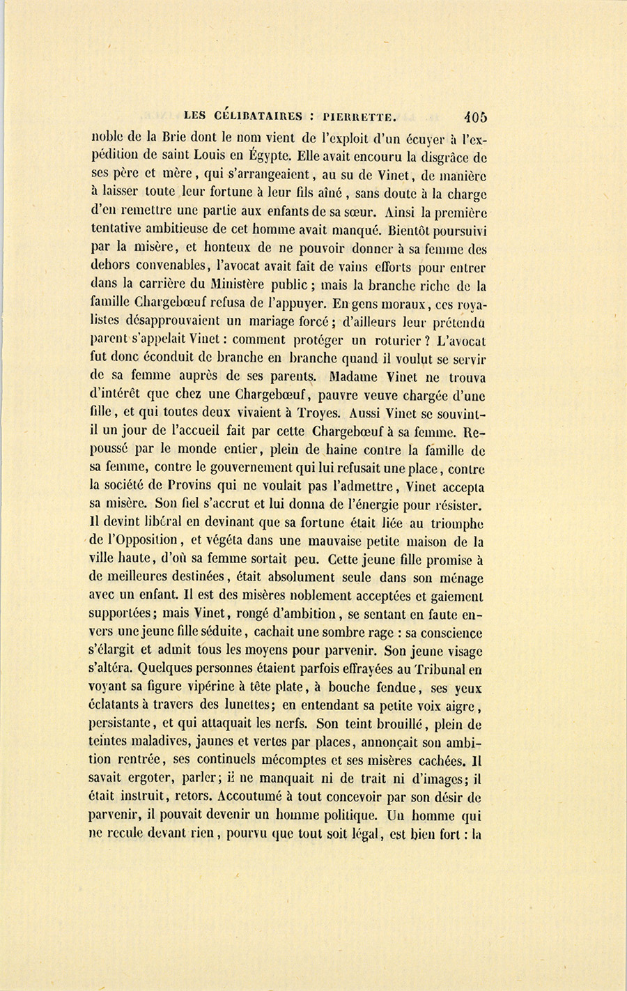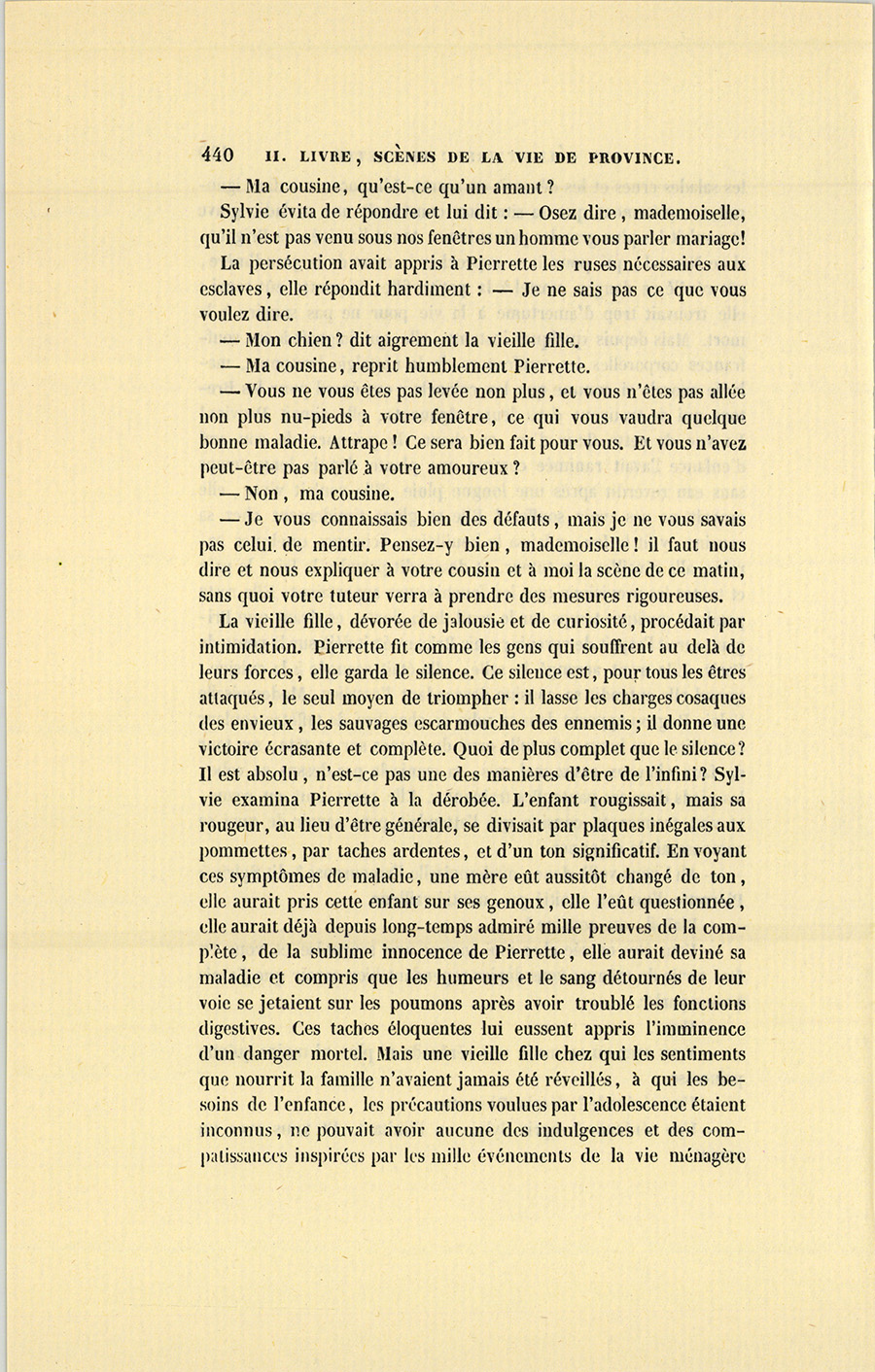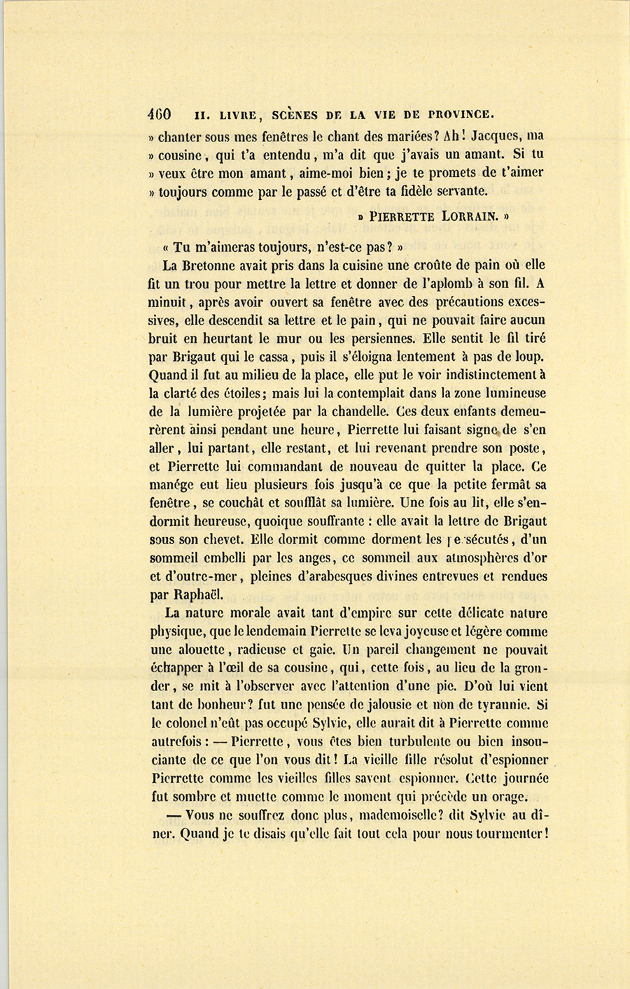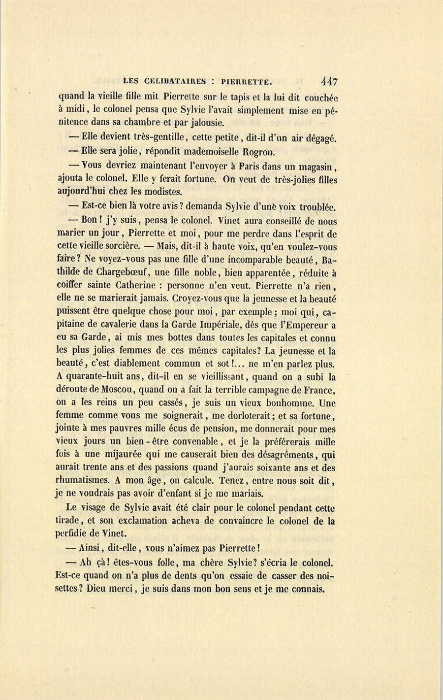 Cette personne était une femme. Aucun homme ne s’arrache aux douceurs du sommeil matinal pour écouter un troubadour en veste, une fille seule se réveille à un chant d’amour. Aussi était-ce une fille, et une vieille fille. Quand elle eut déployé ses persiennes par un geste de chauve-souris, elle regarda dans toutes les directions et n’entendit que vaguement les pas de Brigaut qui s’enfuyait. Y a-t-il rien de plus horrible à voir que la matinale apparition d’une vieille fille laide à sa fenêtre ? De tous les spectacles grotesques qui font la joie des voyageurs quand ils traversent les petites villes, n’est-ce pas le plus déplaisant ? il est trop triste, trop repoussant pour qu’on en rie. Cette vieille fille, à l’oreille si alerte, se présentait dépouillée des artifices en tout genre qu’elle employait pour s’embellir : elle n’avait ni son tour de faux cheveux ni sa collerette. Elle portait cet affreux petit sac en taffetas noir avec lequel les vieilles femmes s’enveloppent l’occiput, et qui dépassait son bonnet de nuit relevé par les mouvements du sommeil. Ce désordre donnait à cette tête l’air menaçant que les peintres {p. 370} prêtent aux sorcières. Les tempes, les oreilles et la nuque, assez peu cachées, laissaient voir leur caractère aride et sec ; leurs rides âpres se recommandaient par des tons rouges peu agréables à l’œil et que faisait encore ressortir la couleur quasi blanche de la camisole nouée au cou par des cordons vrillés. Les bâillements de cette camisole entr’ouverte montraient une poitrine comparable à celle d’une vieille paysanne peu soucieuse de sa laideur. Le bras décharné faisait l’effet d’un bâton sur lequel on aurait mis une étoffe. Vue à sa croisée, cette demoiselle paraissait grande à cause de la force et de l’étendue de son visage qui rappelait l’ampleur inouïe de certaines figures suisses. Sa physionomie, où les traits péchaient par un défaut d’ensemble, avait pour principal caractère une sécheresse dans les lignes, une aigreur dans les tons, une insensibilité dans le fond qui eût saisi de dégoût un physionomiste. Ces expressions alors visibles se modifiaient habituellement par une sorte de sourire commercial, par une bêtise bourgeoise qui jouait si bien la bonhomie, que les personnes avec lesquelles vivait cette demoiselle pouvaient très-bien la prendre pour une bonne personne. Elle possédait cette maison par indivis avec son frère. Le frère dormait si tranquillement dans sa chambre, que l’orchestre de l’Opéra ne l’eût pas éveillé, et cependant le diapason de cet orchestre est célèbre ! La vieille demoiselle avança la tête hors de la fenêtre, leva vers la mansarde ses petits yeux d’un bleu pâle et froid, aux cils courts et plantés dans un bord presque toujours enflé ; elle essaya de voir Pierrette ; mais, après avoir reconnu l’inutilité de sa manœuvre, elle rentra dans sa chambre par un mouvement semblable à celui d’une tortue qui cache sa tête après l’avoir sortie de sa carapace. [ill.] Les persiennes se fermèrent, et le silence de la place ne fut plus troublé que par les paysans qui arrivaient ou par des personnes matinales. Quand il y a une vieille fille dans une maison, les chiens de garde sont inutiles : il ne s’y passe pas le moindre événement qu’elle ne le voie, ne le commente et n’en tire toutes les conséquences possibles. Aussi, cette circonstance allait-elle donner carrière à de graves suppositions, ouvrir un de ces drames obscurs qui se passent en famille et qui, pour demeurer secrets, n’en sont pas moins terribles, si vous permettez toutefois d’appliquer le mot de drame à cette scène d’intérieur.