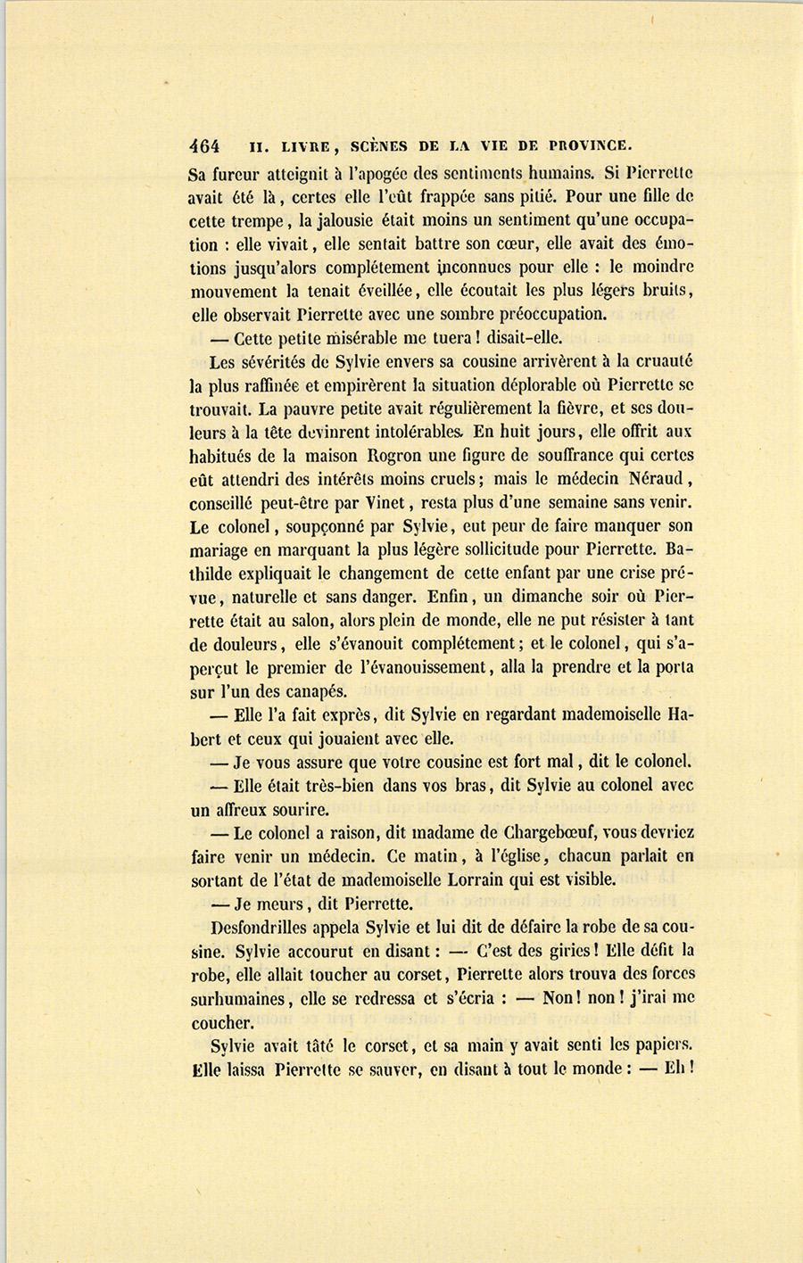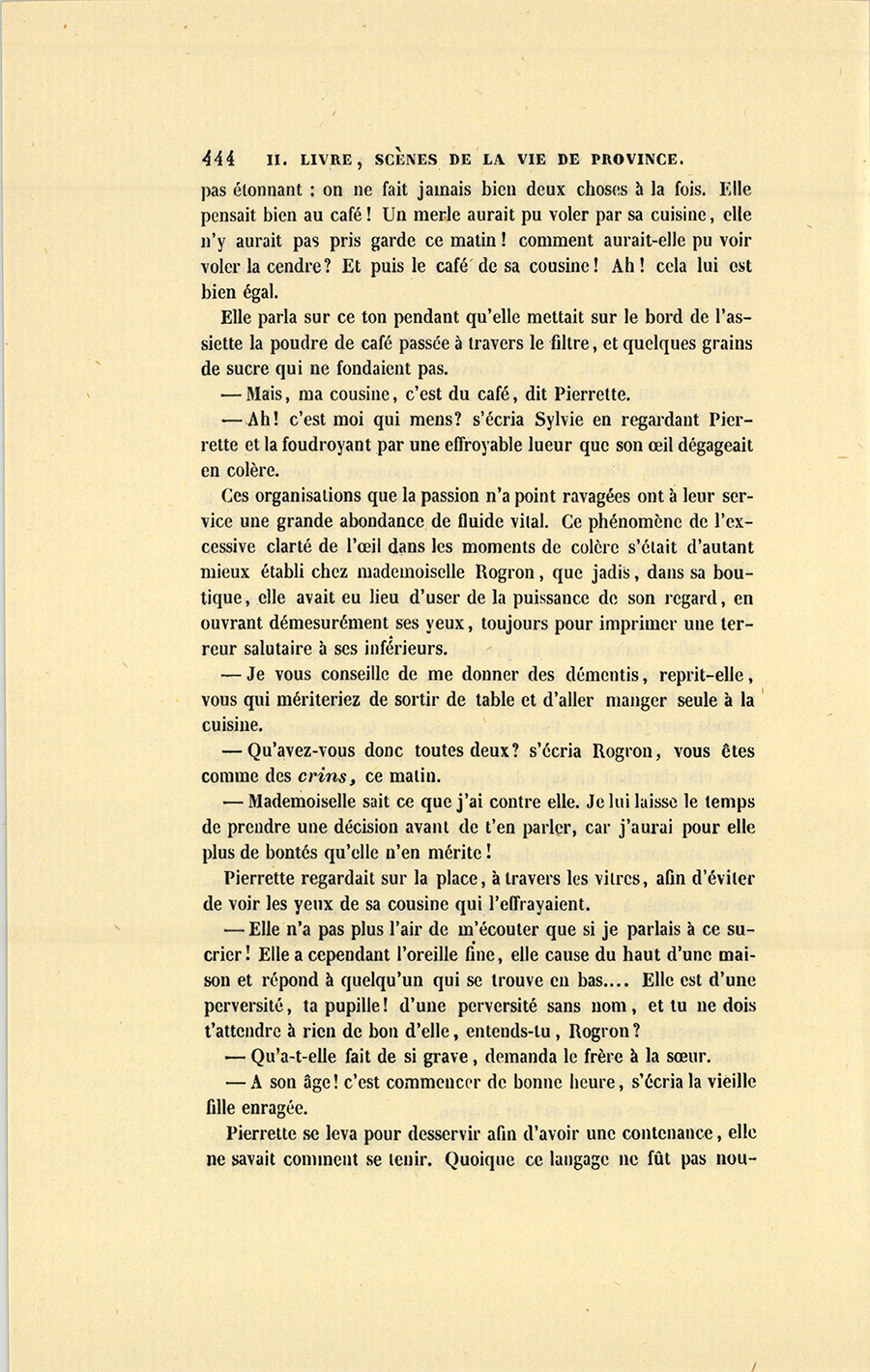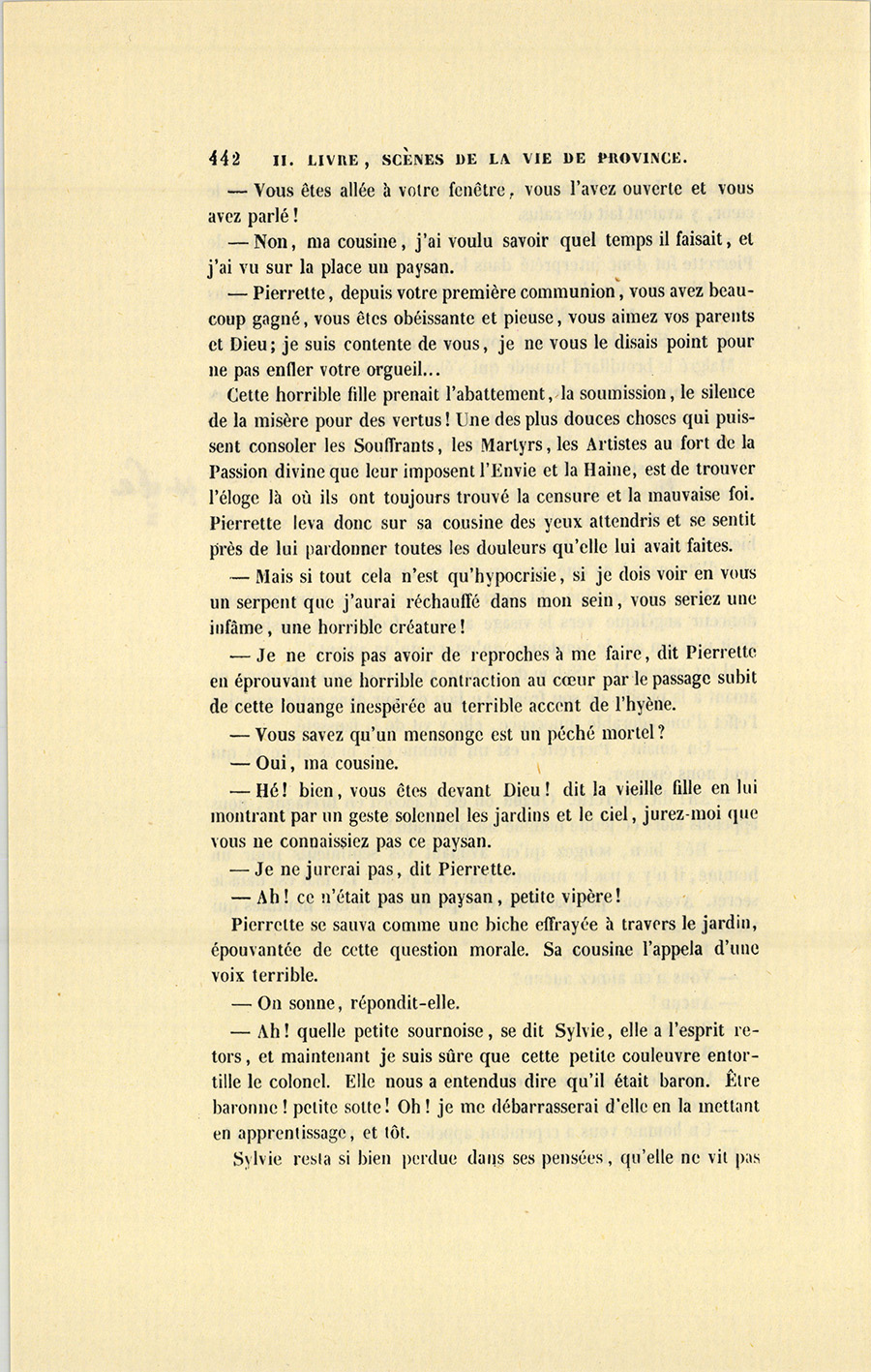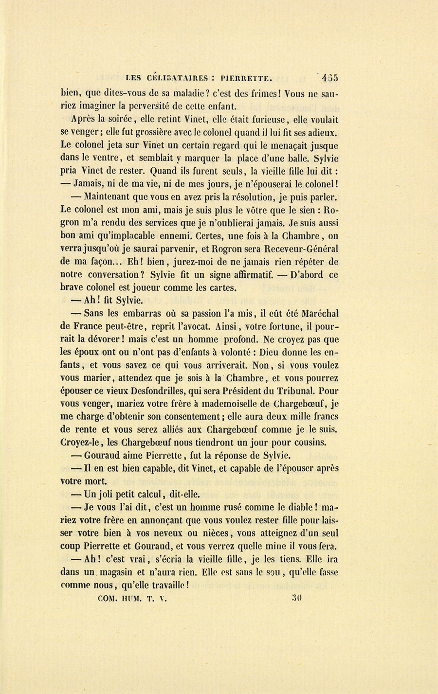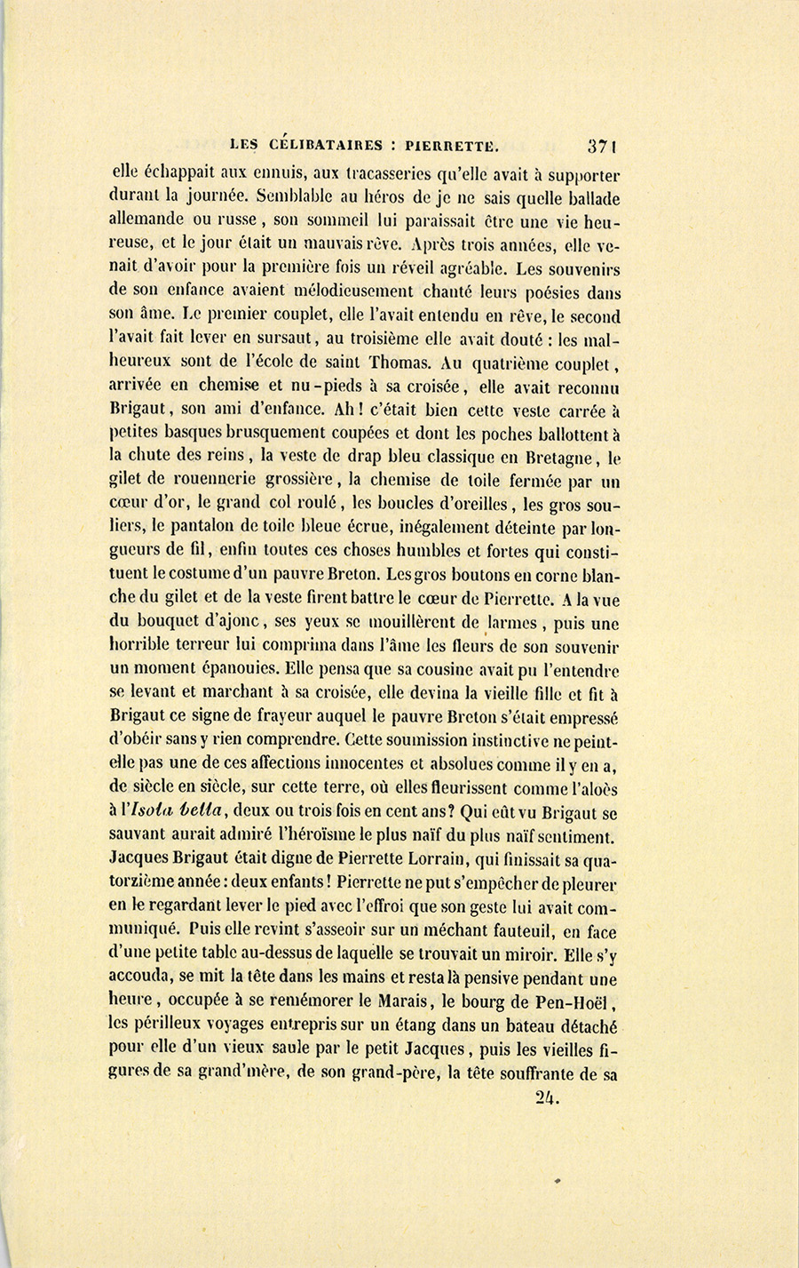 Cette personne était une femme. Aucun homme ne s’arrache aux douceurs du sommeil matinal pour écouter un troubadour en veste, une fille seule se réveille à un chant d’amour. Aussi était-ce une fille, et une vieille fille. Quand elle eut déployé ses persiennes par un geste de chauve-souris, elle regarda dans toutes les directions et n’entendit que vaguement les pas de Brigaut qui s’enfuyait. Y a-t-il rien de plus horrible à voir que la matinale apparition d’une vieille fille laide à sa fenêtre ? De tous les spectacles grotesques qui font la joie des voyageurs quand ils traversent les petites villes, n’est-ce pas le plus déplaisant ? il est trop triste, trop repoussant pour qu’on en rie. Cette vieille fille, à l’oreille si alerte, se présentait dépouillée des artifices en tout genre qu’elle employait pour s’embellir : elle n’avait ni son tour de faux cheveux ni sa collerette. Elle portait cet affreux petit sac en taffetas noir avec lequel les vieilles femmes s’enveloppent l’occiput, et qui dépassait son bonnet de nuit relevé par les mouvements du sommeil. Ce désordre donnait à cette tête l’air menaçant que les peintres {p. 370} prêtent aux sorcières. Les tempes, les oreilles et la nuque, assez peu cachées, laissaient voir leur caractère aride et sec ; leurs rides âpres se recommandaient par des tons rouges peu agréables à l’œil et que faisait encore ressortir la couleur quasi blanche de la camisole nouée au cou par des cordons vrillés. Les bâillements de cette camisole entr’ouverte montraient une poitrine comparable à celle d’une vieille paysanne peu soucieuse de sa laideur. Le bras décharné faisait l’effet d’un bâton sur lequel on aurait mis une étoffe. Vue à sa croisée, cette demoiselle paraissait grande à cause de la force et de l’étendue de son visage qui rappelait l’ampleur inouïe de certaines figures suisses. Sa physionomie, où les traits péchaient par un défaut d’ensemble, avait pour principal caractère une sécheresse dans les lignes, une aigreur dans les tons, une insensibilité dans le fond qui eût saisi de dégoût un physionomiste. Ces expressions alors visibles se modifiaient habituellement par une sorte de sourire commercial, par une bêtise bourgeoise qui jouait si bien la bonhomie, que les personnes avec lesquelles vivait cette demoiselle pouvaient très-bien la prendre pour une bonne personne. Elle possédait cette maison par indivis avec son frère. Le frère dormait si tranquillement dans sa chambre, que l’orchestre de l’Opéra ne l’eût pas éveillé, et cependant le diapason de cet orchestre est célèbre ! La vieille demoiselle avança la tête hors de la fenêtre, leva vers la mansarde ses petits yeux d’un bleu pâle et froid, aux cils courts et plantés dans un bord presque toujours enflé ; elle essaya de voir Pierrette ; mais, après avoir reconnu l’inutilité de sa manœuvre, elle rentra dans sa chambre par un mouvement semblable à celui d’une tortue qui cache sa tête après l’avoir sortie de sa carapace. [ill.] Les persiennes se fermèrent, et le silence de la place ne fut plus troublé que par les paysans qui arrivaient ou par des personnes matinales. Quand il y a une vieille fille dans une maison, les chiens de garde sont inutiles : il ne s’y passe pas le moindre événement qu’elle ne le voie, ne le commente et n’en tire toutes les conséquences possibles. Aussi, cette circonstance allait-elle donner carrière à de graves suppositions, ouvrir un de ces drames obscurs qui se passent en famille et qui, pour demeurer secrets, n’en sont pas moins terribles, si vous permettez toutefois d’appliquer le mot de drame à cette scène d’intérieur.