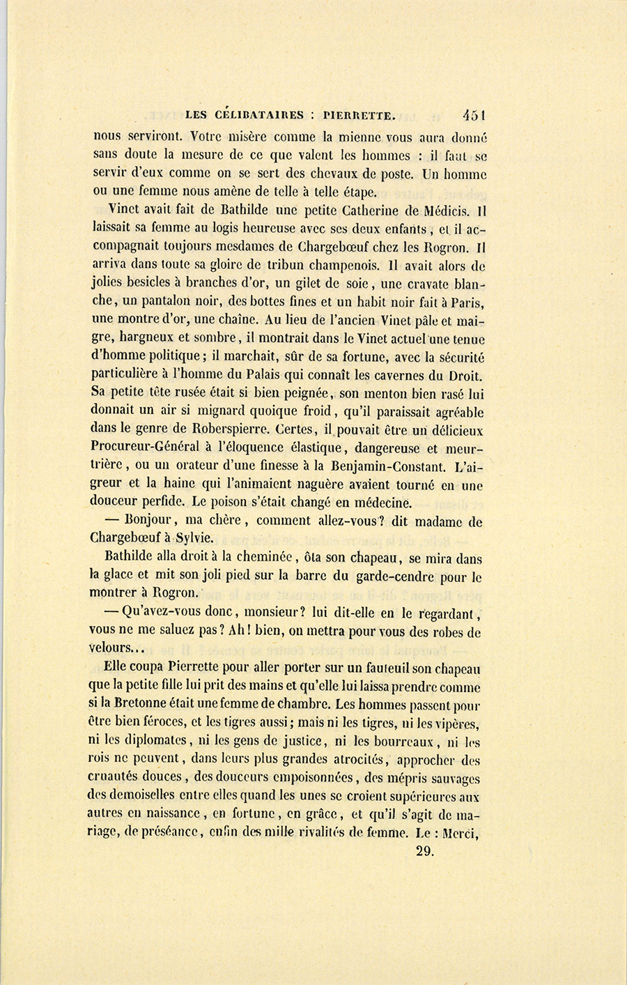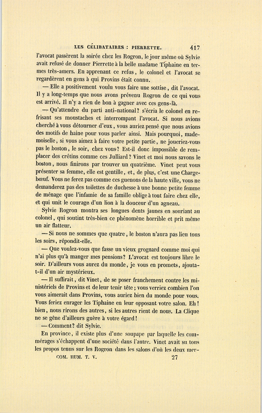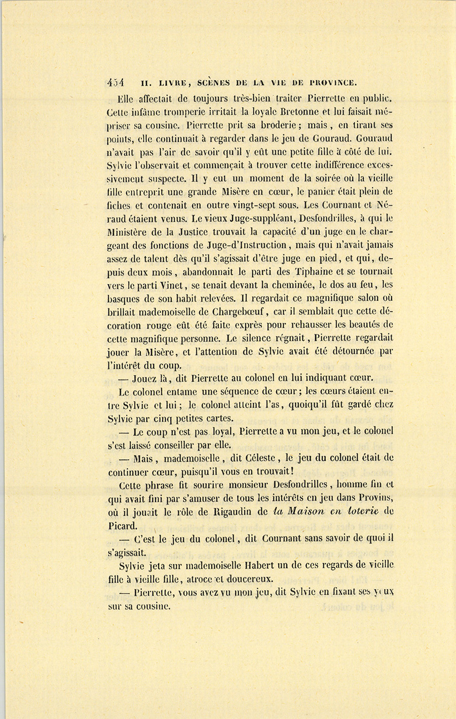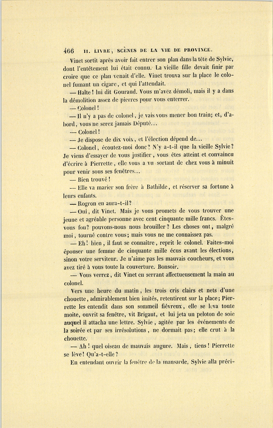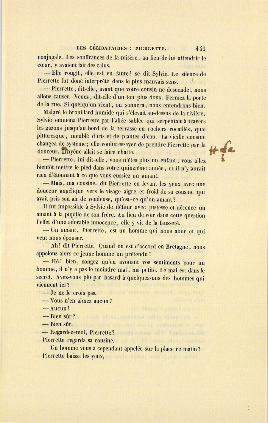 Cette personne était une femme. Aucun homme ne s’arrache aux douceurs du sommeil matinal pour écouter un troubadour en veste, une fille seule se réveille à un chant d’amour. Aussi était-ce une fille, et une vieille fille. Quand elle eut déployé ses persiennes par un geste de chauve-souris, elle regarda dans toutes les directions et n’entendit que vaguement les pas de Brigaut qui s’enfuyait. Y a-t-il rien de plus horrible à voir que la matinale apparition d’une vieille fille laide à sa fenêtre ? De tous les spectacles grotesques qui font la joie des voyageurs quand ils traversent les petites villes, n’est-ce pas le plus déplaisant ? il est trop triste, trop repoussant pour qu’on en rie. Cette vieille fille, à l’oreille si alerte, se présentait dépouillée des artifices en tout genre qu’elle employait pour s’embellir : elle n’avait ni son tour de faux cheveux ni sa collerette. Elle portait cet affreux petit sac en taffetas noir avec lequel les vieilles femmes s’enveloppent l’occiput, et qui dépassait son bonnet de nuit relevé par les mouvements du sommeil. Ce désordre donnait à cette tête l’air menaçant que les peintres {p. 370} prêtent aux sorcières. Les tempes, les oreilles et la nuque, assez peu cachées, laissaient voir leur caractère aride et sec ; leurs rides âpres se recommandaient par des tons rouges peu agréables à l’œil et que faisait encore ressortir la couleur quasi blanche de la camisole nouée au cou par des cordons vrillés. Les bâillements de cette camisole entr’ouverte montraient une poitrine comparable à celle d’une vieille paysanne peu soucieuse de sa laideur. Le bras décharné faisait l’effet d’un bâton sur lequel on aurait mis une étoffe. Vue à sa croisée, cette demoiselle paraissait grande à cause de la force et de l’étendue de son visage qui rappelait l’ampleur inouïe de certaines figures suisses. Sa physionomie, où les traits péchaient par un défaut d’ensemble, avait pour principal caractère une sécheresse dans les lignes, une aigreur dans les tons, une insensibilité dans le fond qui eût saisi de dégoût un physionomiste. Ces expressions alors visibles se modifiaient habituellement par une sorte de sourire commercial, par une bêtise bourgeoise qui jouait si bien la bonhomie, que les personnes avec lesquelles vivait cette demoiselle pouvaient très-bien la prendre pour une bonne personne. Elle possédait cette maison par indivis avec son frère. Le frère dormait si tranquillement dans sa chambre, que l’orchestre de l’Opéra ne l’eût pas éveillé, et cependant le diapason de cet orchestre est célèbre ! La vieille demoiselle avança la tête hors de la fenêtre, leva vers la mansarde ses petits yeux d’un bleu pâle et froid, aux cils courts et plantés dans un bord presque toujours enflé ; elle essaya de voir Pierrette ; mais, après avoir reconnu l’inutilité de sa manœuvre, elle rentra dans sa chambre par un mouvement semblable à celui d’une tortue qui cache sa tête après l’avoir sortie de sa carapace. [ill.] Les persiennes se fermèrent, et le silence de la place ne fut plus troublé que par les paysans qui arrivaient ou par des personnes matinales. Quand il y a une vieille fille dans une maison, les chiens de garde sont inutiles : il ne s’y passe pas le moindre événement qu’elle ne le voie, ne le commente et n’en tire toutes les conséquences possibles. Aussi, cette circonstance allait-elle donner carrière à de graves suppositions, ouvrir un de ces drames obscurs qui se passent en famille et qui, pour demeurer secrets, n’en sont pas moins terribles, si vous permettez toutefois d’appliquer le mot de drame à cette scène d’intérieur.