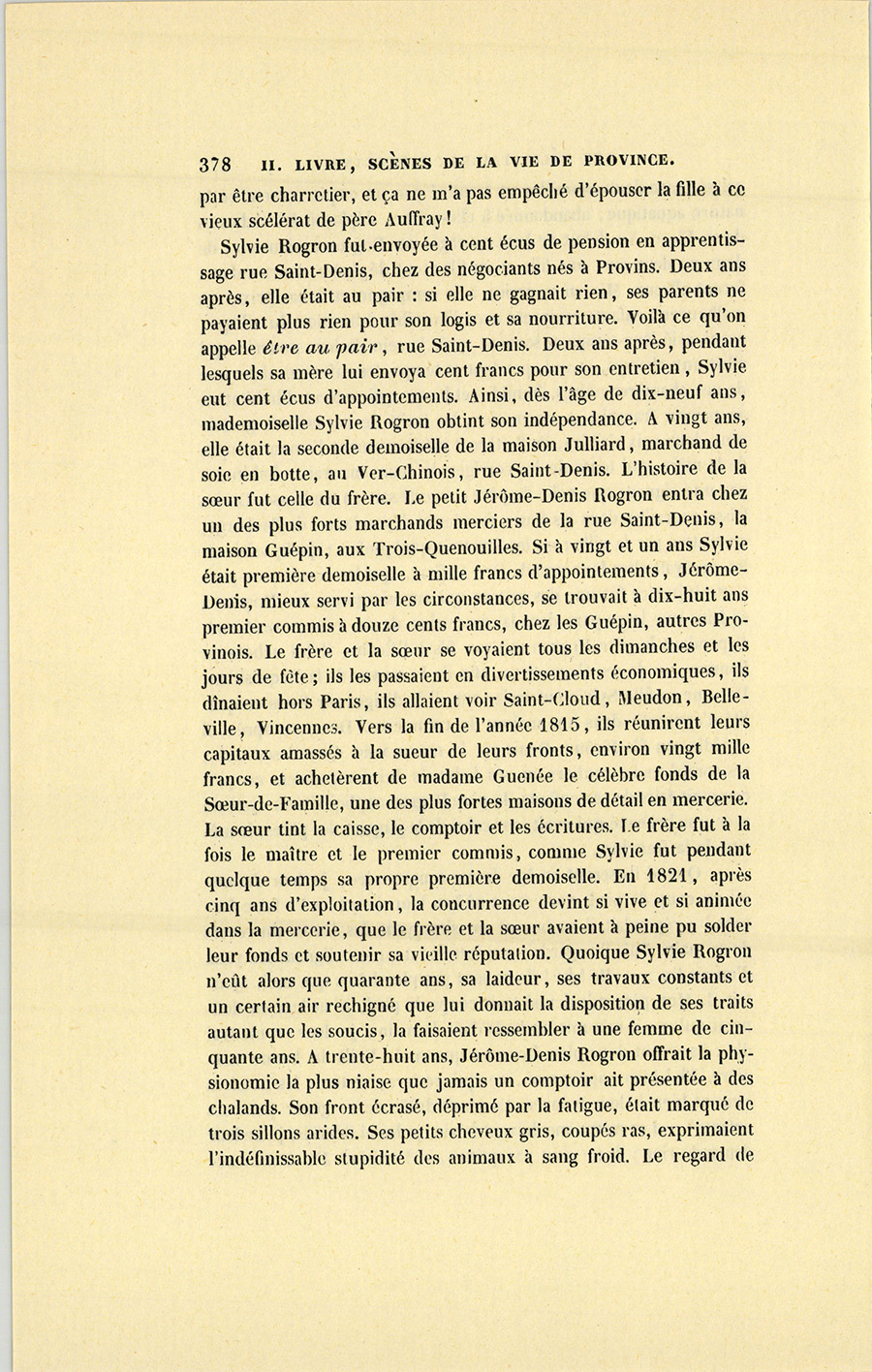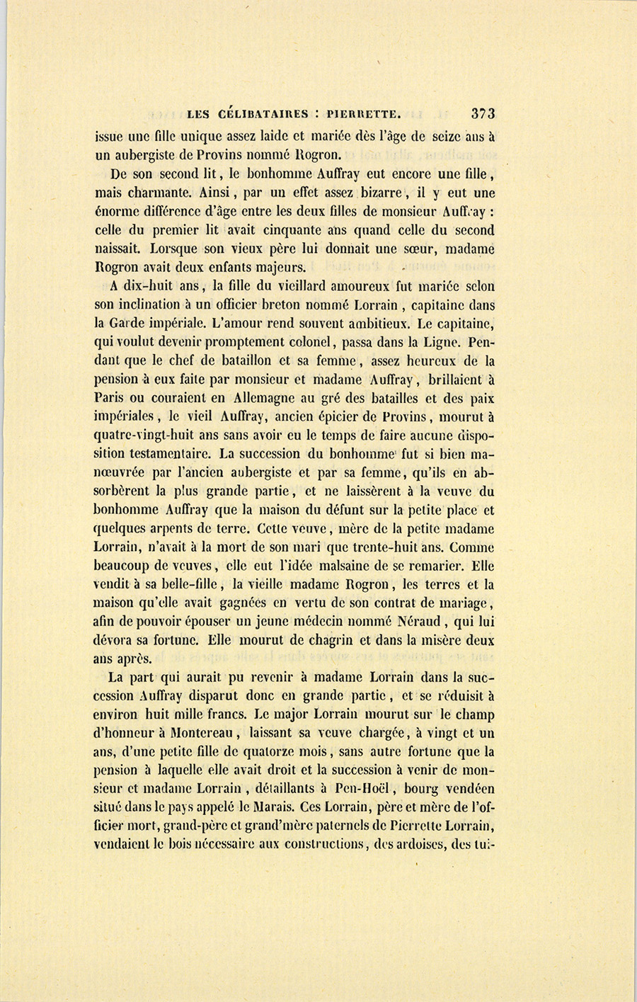 Marié d’abord à dix-huit ans, monsieur Auffray avait contracté vers soixante-neuf ans un second mariage. De son premier lit, était {p. 373} issue une fille unique assez laide et mariée dès l’âge de seize ans à un aubergiste de Provins nommé Rogron.
