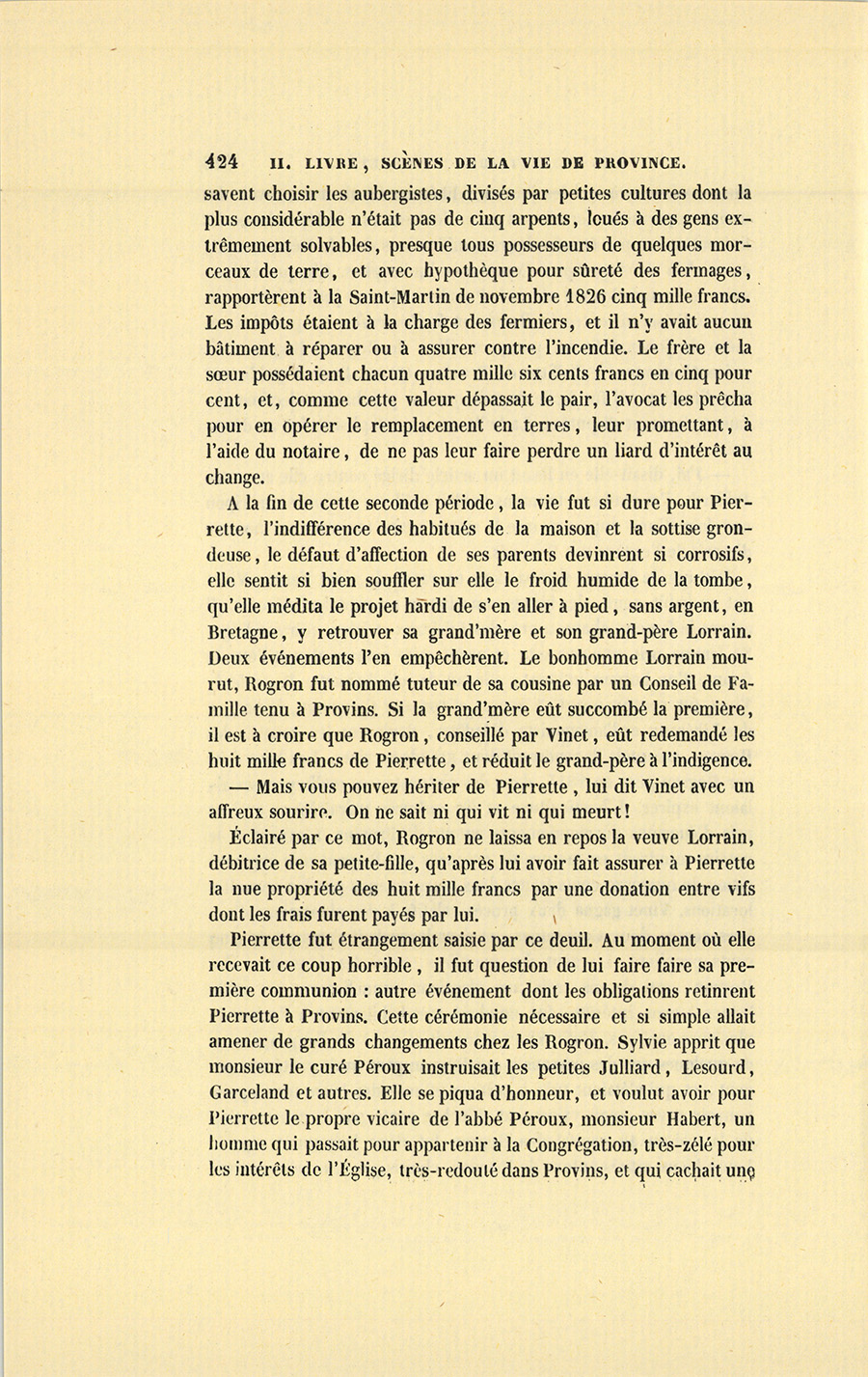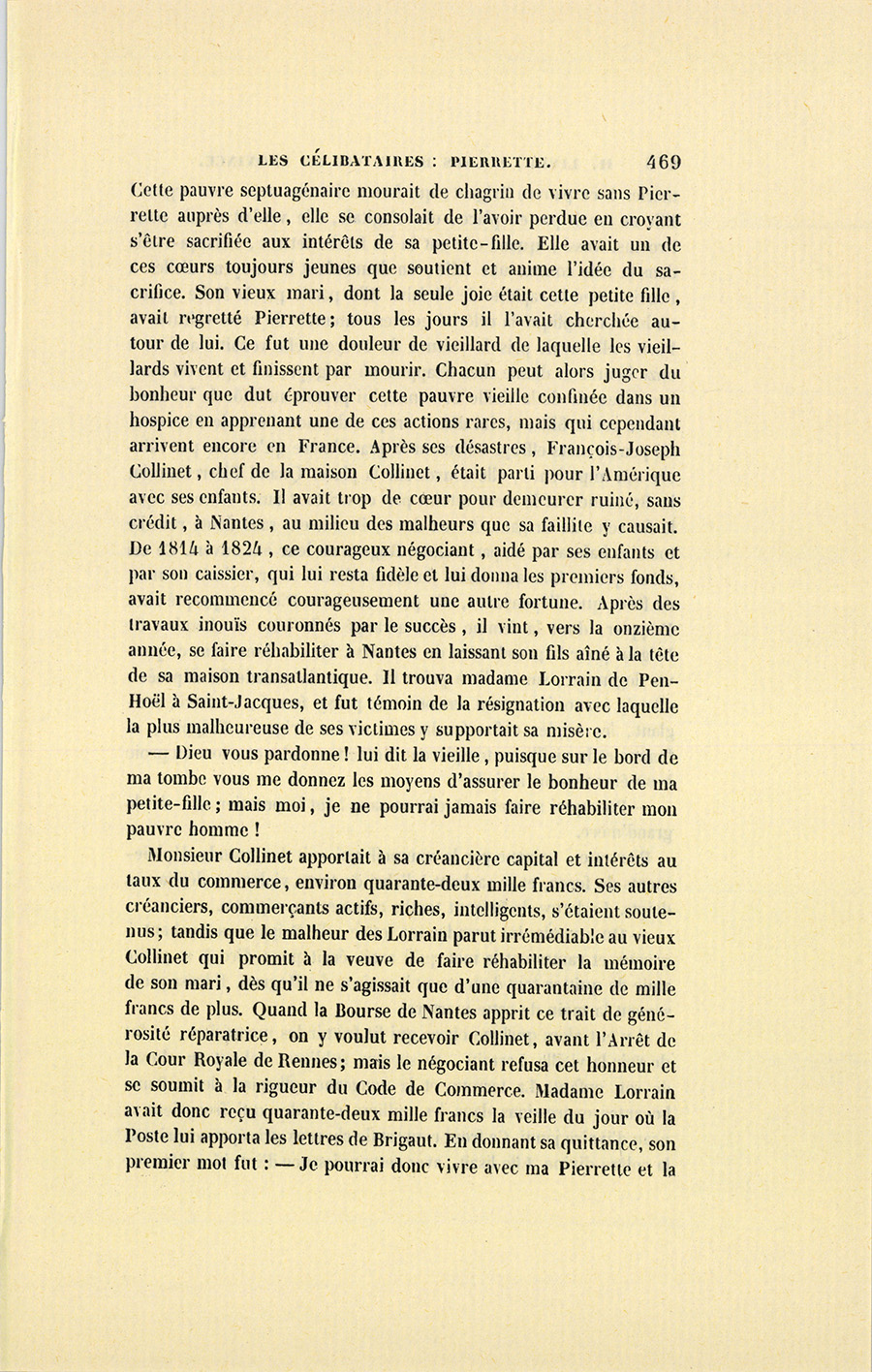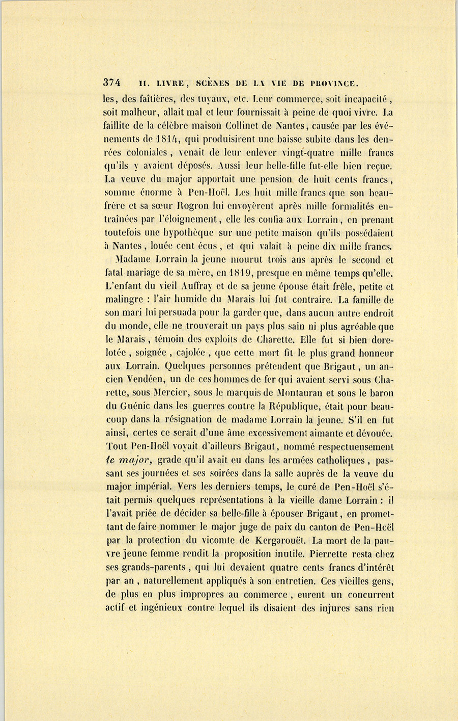 La part qui aurait pu revenir à madame Lorrain dans la succession Auffray disparut donc en grande partie, et se réduisit à environ huit mille francs. Le major Lorrain mourut sur le champ d’honneur à Montereau, laissant sa veuve chargée, à vingt et un ans, d’une petite fille de quatorze mois, sans autre fortune que la pension à laquelle elle avait droit et la succession à venir de monsieur et madame Lorrain, détaillants à Pen-Hoël, bourg vendéen situé dans le pays appelé le Marais. Ces Lorrain, père et mère de l’officier mort, grand-père et grand’mère paternels de Pierrette Lorrain, vendaient le bois nécessaire aux constructions, des ardoises, des {p. 374} tuiles, des faîtières, des tuyaux, etc. Leur commerce, soit incapacité, soit malheur, allait mal et leur fournissait à peine de quoi vivre. La faillite de la célèbre maison Collinet de Nantes, causée par les événements de 1814, qui produisirent une baisse subite dans les denrées coloniales, venait de leur enlever vingt-quatre mille francs qu’ils y avaient déposés. Aussi leur belle-fille fut-elle bien reçue. La veuve du major apportait une pension de huit cents francs, somme énorme à Pen-Hoël. Les huit mille francs que son beau-frère et sa sœur Rogron lui envoyèrent après mille formalités entraînées par l’éloignement, elle les confia aux Lorrain, en prenant toutefois une hypothèque sur une petite maison qu’ils possédaient à Nantes, louée cent écus, et qui valait à peine dix mille francs.
