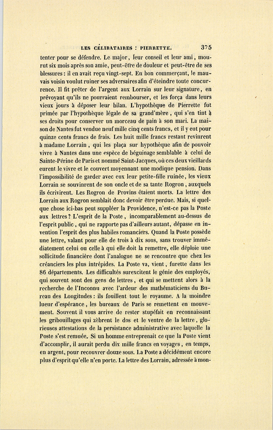 Madame Lorrain la jeune mourut trois ans après le second et fatal mariage de sa mère, en 1819, presque en même temps qu’elle. L’enfant du vieil Auffray et de sa jeune épouse était frêle, petite et malingre : l’air humide du Marais lui fut contraire. La famille de son mari lui persuada pour la garder que, dans aucun autre endroit du monde, elle ne trouverait un pays plus sain ni plus agréable que le Marais, témoin des exploits de Charette. Elle fut si bien dorelotée, soignée, cajolée, que cette mort fit le plus grand honneur aux Lorrain. Quelques personnes prétendent que Brigaut, un ancien Vendéen, un de ces hommes de fer qui avaient servi sous Charette, sous Mercier, sous le marquis de Montauran et sous le baron du Guénic dans les guerres contre la République, était pour beaucoup dans la résignation de madame Lorrain la jeune. S’il en fut ainsi, certes ce serait d’une âme excessivement aimante et dévouée. Tout Pen-Hoël voyait d’ailleurs Brigaut, nommé respectueusement le major, grade qu’il avait eu dans les armées catholiques, passant ses journées et ses soirées dans la salle auprès de la veuve du major impérial. Vers les derniers temps, le curé de Pen-Hoël s’était permis quelques représentations à la vieille dame Lorrain : il l’avait priée de décider sa belle-fille à épouser Brigaut, en promettant de faire nommer le major juge de paix du canton de Pen-Hoël par la protection du vicomte de Kergarouët. La mort de la pauvre jeune femme rendit la proposition inutile. Pierrette resta chez ses grands-parents, qui lui devaient quatre cents francs d’intérêt par an, naturellement appliqués à son entretien. Ces vieilles gens, de plus en plus impropres au commerce, eurent un concurrent actif et ingénieux contre lequel ils disaient des injures sans rien {p. 375} tenter pour se défendre. Le major, leur conseil et leur ami, mourut six mois après son amie, peut-être de douleur et peut-être de ses blessures : il en avait reçu vingt-sept. En bon commerçant, le mauvais voisin voulut ruiner ses adversaires afin d’éteindre toute concurrence. Il fit prêter de l’argent aux Lorrain sur leur signature, en prévoyant qu’ils ne pourraient rembourser, et les força dans leurs vieux jours à déposer leur bilan. L’hypothèque de Pierrette fut primée par l’hypothèque légale de sa grand’mère, qui s’en tint à ses droits pour conserver un morceau de pain à son mari. La maison de Nantes fut vendue neuf mille cinq cents francs, et il y eut pour quinze cents francs de frais. Les huit mille francs restant revinrent à madame Lorrain, qui les plaça sur hypothèque afin de pouvoir vivre à Nantes dans une espèce de béguinage semblable à celui de Sainte-Périne de Paris et nommé Saint-Jacques, où ces deux vieillards eurent le vivre et le couvert moyennant une modique pension. Dans l’impossibilité de garder avec eux leur petite-fille ruinée, les vieux Lorrain se souvinrent de son oncle et de sa tante Rogron, auxquels ils écrivirent. Les Rogron de Provins étaient morts. La lettre des Lorrain aux Rogron semblait donc devoir être perdue. Mais, si quelque chose ici-bas peut suppléer la Providence, n’est-ce pas la Poste aux lettres ? L’esprit de la Poste, incomparablement au-dessus de l’esprit public, qui ne rapporte pas d’ailleurs autant, dépasse en invention l’esprit des plus habiles romanciers. Quand la Poste possède une lettre, valant pour elle de trois à dix sous, sans trouver immédiatement celui ou celle à qui elle doit la remettre, elle déploie une sollicitude financière dont l’analogue ne se rencontre que chez les créanciers les plus intrépides. La Poste va, vient, furette dans les 86 départements. Les difficultés surexcitent le génie des employés, qui souvent sont des gens de lettres, et qui se mettent alors à la recherche de l’Inconnu avec l’ardeur des mathématiciens du Bureau des Longitudes : ils fouillent tout le royaume. À la moindre lueur d’espérance, les bureaux de Paris se remettent en mouvement. Souvent il vous arrive de rester stupéfait en reconnaissant les gribouillages qui zèbrent le dos et le ventre de la lettre, glorieuses attestations de la persistance administrative avec laquelle la Poste s’est remuée. Si un homme entreprenait ce que la Poste vient d’accomplir, il aurait perdu dix mille francs en voyages, en temps, en argent, pour recouvrer douze sous. La Poste a décidément encore plus d’esprit qu’elle n’en porte. La lettre des Lorrain, adressée à {p. 376} monsieur Rogron de Provins, décédé depuis une année, fut envoyée par la Poste à monsieur Rogron, son fils, mercier, rue Saint-Denis, à Paris. En ceci éclate l’esprit de la Poste. Un héritier est toujours plus ou moins tourmenté de savoir s’il a bien tout ramassé d’une succession, s’il n’a pas oublié des créances ou des guenilles. Le Fisc devine tout, même les caractères. Une lettre adressée au vieux Rogron de Provins mort devait piquer la curiosité de Rogron fils, à Paris, ou de mademoiselle Rogron, sa sœur, ses héritiers. Aussi le Fisc eut-il ses soixante centimes.