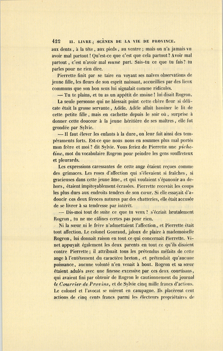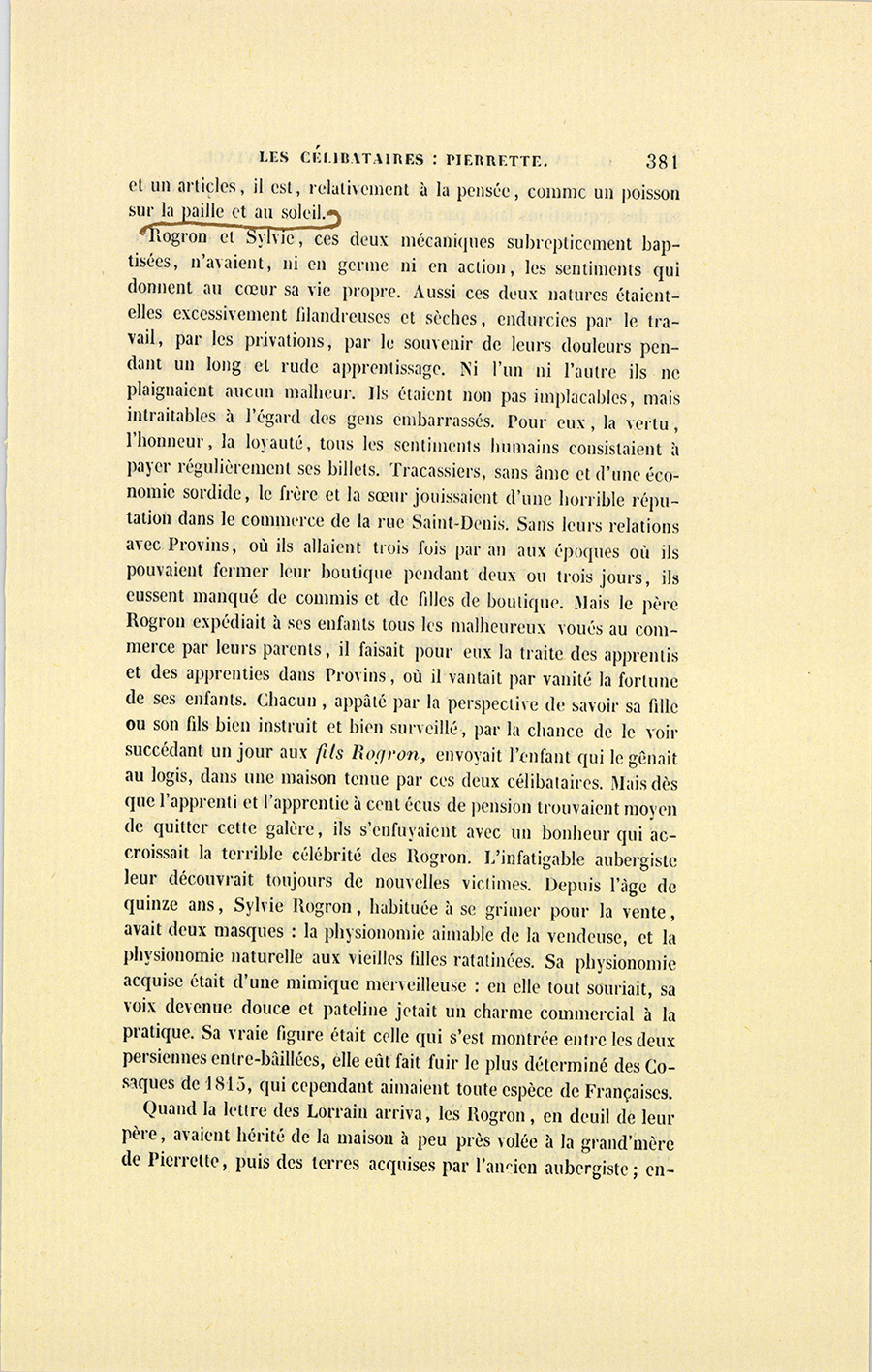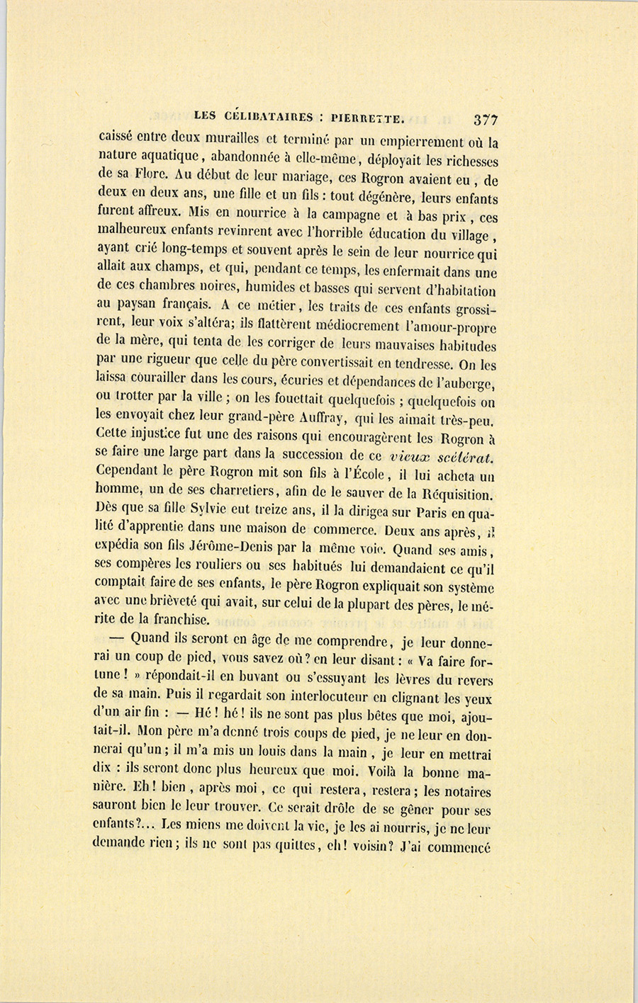 Le père Rogron, cet aubergiste de Provins à qui le vieil Auffray avait donné la fille de son premier lit, était un personnage à figure enflammée, à nez veineux, et sur les joues duquel Bacchus avait appliqué ses pampres rougis et bulbeux. Quoique gros, court et ventripotent, à jambes grasses et à mains épaisses, il était doué de la finesse des aubergistes de Suisse, auxquels il ressemblait. Sa figure représentait vaguement un vaste vignoble grêlé. Certes, il n’était pas beau, mais sa femme lui ressemblait. Jamais couple ne fut mieux assorti. Rogron aimait la bonne chère et à se faire servir par de jolies filles. Il appartenait à la secte des égoïstes dont l’allure est brutale, qui s’adonnent à leurs vices et font leurs volontés à la face d’Israël. Avide, intéressé, peu délicat, obligé de pourvoir à ses fantaisies, il mangea ses gains jusqu’au jour où les dents lui manquèrent. L’avarice resta. Sur ses vieux jours, il vendit son auberge, ramassa, comme on l’a vu, presque toute la succession de son beau-père, et se retira dans la petite maison de la place, achetée pour un morceau de pain à la veuve du père Auffray, la grand’mère de Pierrette. Rogron et sa femme possédaient environ deux mille francs de rente, provenant de la location de vingt-sept pièces de terre situées autour de Provins, et les intérêts du prix de leur auberge, vendue vingt mille francs. La maison du bonhomme Auffray, quoique en fort mauvais état, fut habitée telle quelle par ces anciens aubergistes qui se gardèrent, comme de la peste, d’y toucher : les vieux rats aiment les lézardes et les ruines. L’ancien aubergiste, qui prit goût au jardinage, employa ses économies à l’augmentation du jardin ; il le poussa jusqu’au bord de la rivière, il en fit un carré long, {p. 377} encaissé entre deux murailles et terminé par un empierrement où la nature aquatique, abandonnée à elle-même, déployait les richesses de sa Flore. Au début de leur mariage, ces Rogron avaient eu, de deux en deux ans, une fille et un fils : tout dégénère, leurs enfants furent affreux. Mis en nourrice à la campagne et à bas prix, ces malheureux enfants revinrent avec l’horrible éducation du village, ayant crié long-temps et souvent après le sein de leur nourrice qui allait aux champs, et qui, pendant ce temps, les enfermait dans une de ces chambres noires, humides et basses qui servent d’habitation au paysan français. À ce métier, les traits de ces enfants grossirent, leur voix s’altéra ; ils flattèrent médiocrement l’amour-propre de la mère, qui tenta de les corriger de leurs mauvaises habitudes par une rigueur que celle du père convertissait en tendresse. On les laissa courailler dans les cours, écuries et dépendances de l’auberge, ou trotter par la ville ; on les fouettait quelquefois ; quelquefois on les envoyait chez leur grand-père Auffray, qui les aimait très-peu. Cette injustice fut une des raisons qui encouragèrent les Rogron à se faire une large part dans la succession de ce vieux scélérat. Cependant le père Rogron mit son fils à l’École, il lui acheta un homme, un de ses charretiers, afin de le sauver de la Réquisition. Dès que sa fille Sylvie eut treize ans, il la dirigea sur Paris en qualité d’apprentie dans une maison de commerce. Deux ans après, il expédia son fils Jérôme-Denis par la même voie. Quand ses amis, ses compères les rouliers ou ses habitués lui demandaient ce qu’il comptait faire de ses enfants, le père Rogron expliquait son système avec une brièveté qui avait, sur celui de la plupart des pères, le mérite de la franchise.
