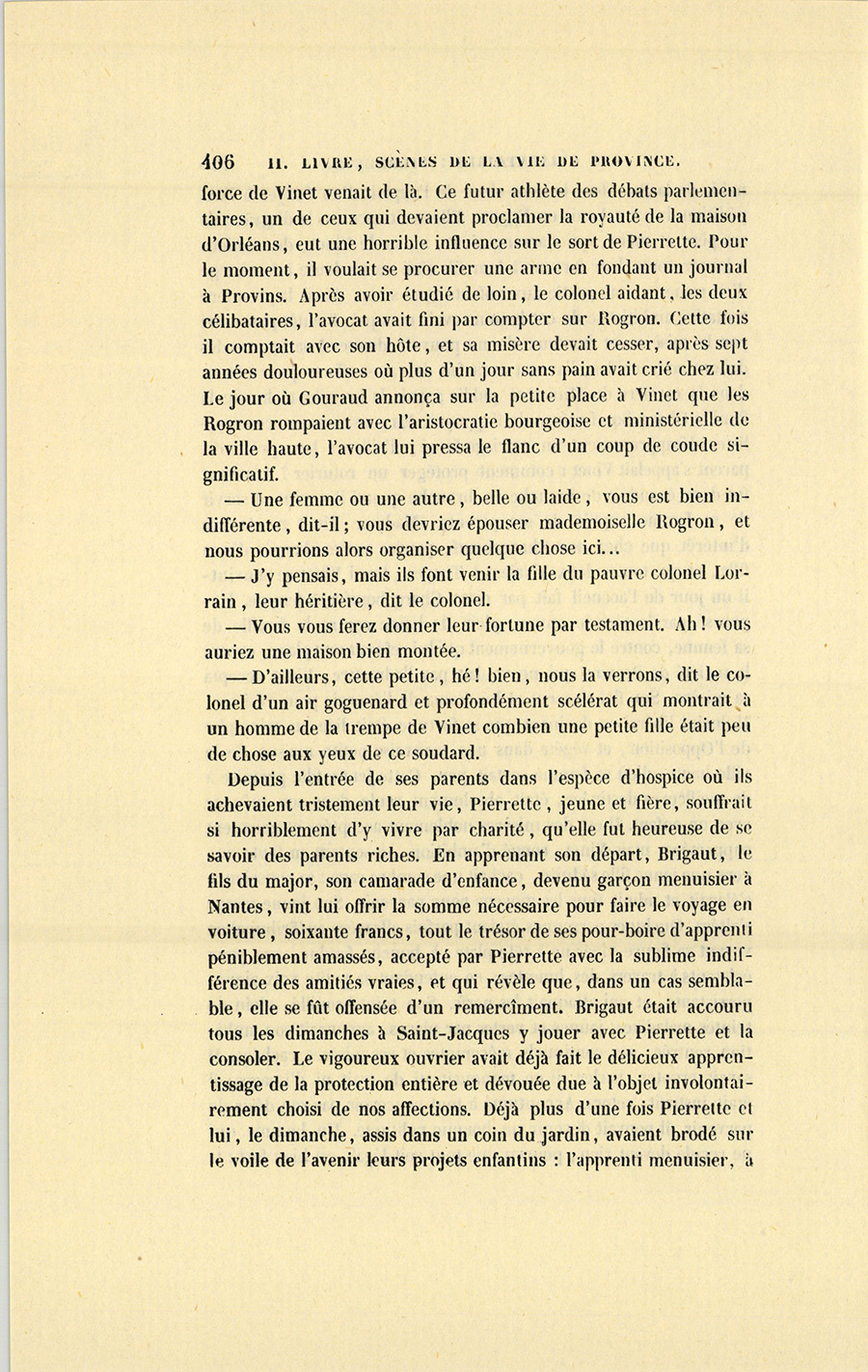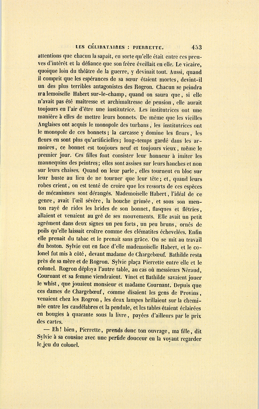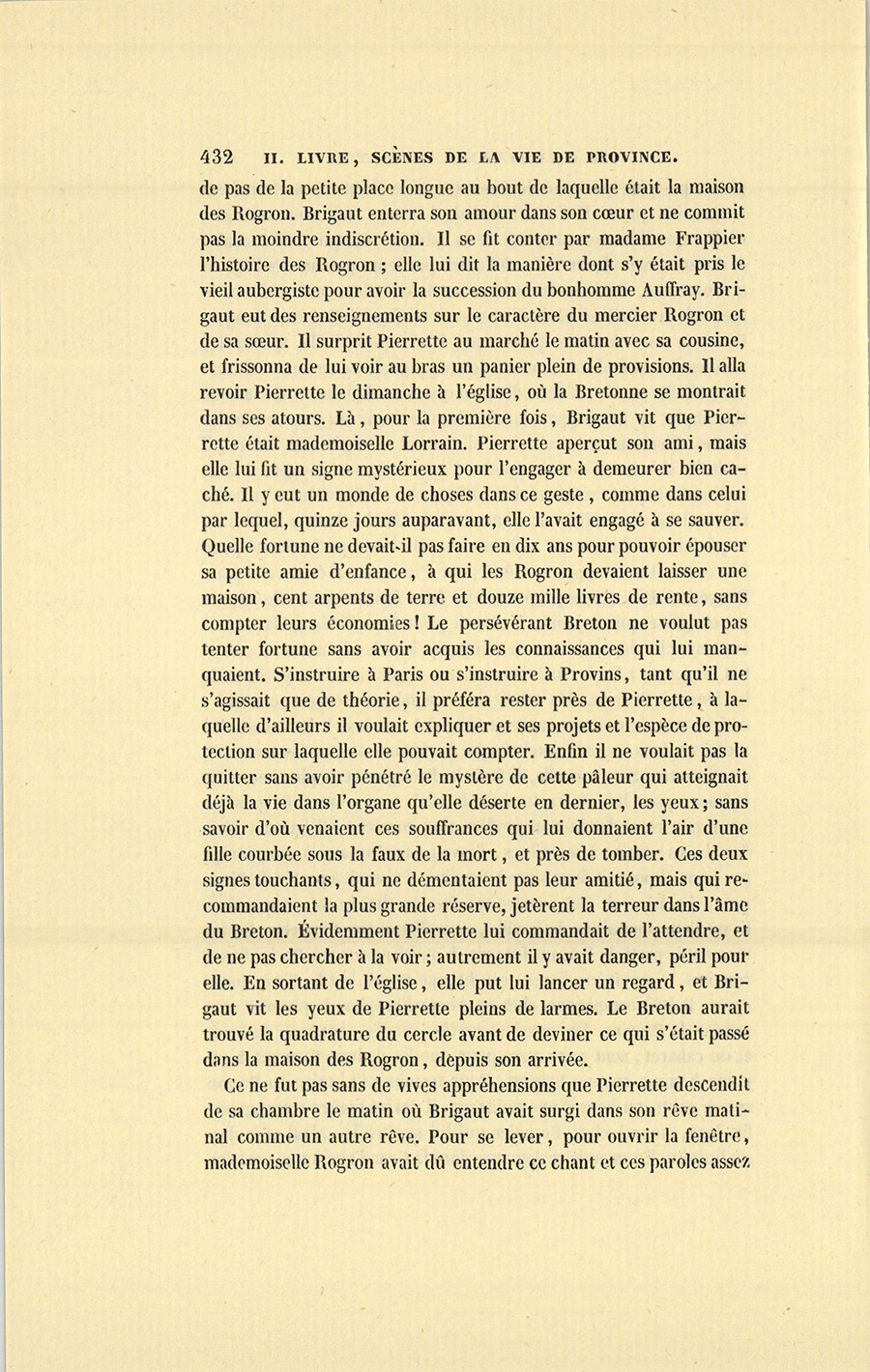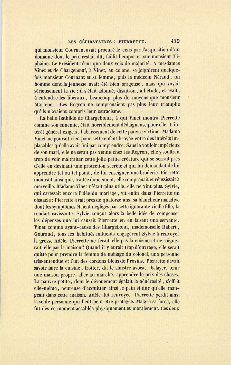 La lettre des Lorrain vint au milieu d’une méditation inspirée par ce bel avenir. Les merciers connaissaient à peine leur cousine Pierrette Lorrain. L’affaire de la succession Auffray, traitée depuis long-temps par le vieil aubergiste, avait eu lieu pendant leur établissement, et Rogron causait très-peu sur ses capitaux. Envoyés de bonne heure à Paris, le frère et la sœur se souvenaient à peine de leur tante Lorrain. Une heure de discussions généalogiques leur fut nécessaire pour se remémorer leur tante, fille du second lit de leur grand-père Auffray, sœur consanguine de leur mère. Ils retrouvèrent la mère de madame Lorrain dans madame Néraud, morte de chagrin. Ils jugèrent alors que le second mariage de leur grand-père avait été pour eux une chose funeste ; son résultat était le partage de la succession Auffray entre les deux lits. Ils avaient d’ailleurs entendu quelques récriminations de leur père, toujours un peu goguenard et aubergiste. Les deux merciers examinèrent la lettre des Lorrain à travers ces souvenirs peu favorables à la cause de Pierrette. Se charger d’une orpheline, d’une fille, d’une cousine qui, malgré tout, serait leur héritière au cas où ni l’un ni l’autre ne se marierait, il y avait là matière à discussion. La question fut étudiée sous toutes ses faces. D’abord ils n’avaient jamais vu Pierrette. Puis ce serait un ennui que d’avoir une jeune fille à garder. Ne prendraient-ils pas des obligations avec elle ? il serait impossible de la renvoyer si elle ne leur convenait pas ; enfin ne faudrait-il pas la marier ? Et si Rogron trouvait chaussure à son pied parmi les héritières de Provins, ne valait-il pas mieux réserver toute leur fortune pour ses enfants ? Selon Sylvie, une chaussure au pied de son frère était une fille bête, riche et laide, qui se laisserait gouverner par elle. Les deux marchands se décidèrent à refuser. Sylvie se chargea {p. 386} de la réponse. Le courant des affaires fut assez considérable pour retarder cette lettre, qui ne semblait pas urgente, et à laquelle la vieille fille ne pensa plus dès que leur première demoiselle consentit à traiter du fonds de la Sœur-de-Famille. Sylvie Rogron et son frère partirent pour Provins quatre ans avant le jour où la venue de Brigaut allait jeter tant d’intérêt dans la vie de Pierrette. Mais les œuvres de ces deux personnes en province exigent une explication aussi nécessaire que celle sur leur existence à Paris, car Provins ne devait pas moins être funeste à Pierrette que les antécédents commerciaux de ses cousins.