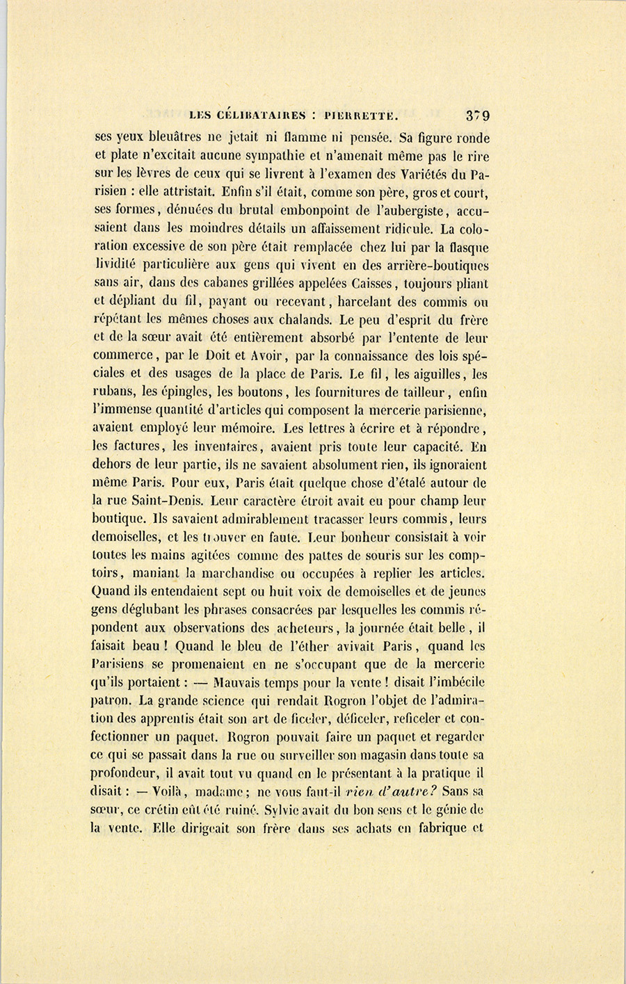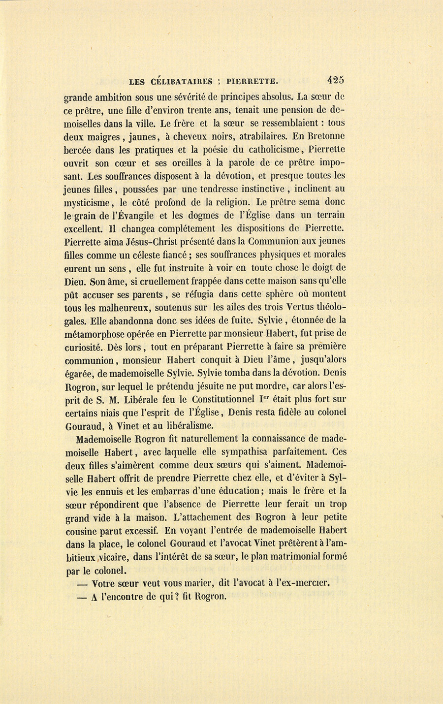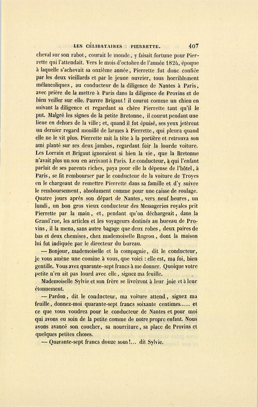 La lettre des Lorrain vint au milieu d’une méditation inspirée par ce bel avenir. Les merciers connaissaient à peine leur cousine Pierrette Lorrain. L’affaire de la succession Auffray, traitée depuis long-temps par le vieil aubergiste, avait eu lieu pendant leur établissement, et Rogron causait très-peu sur ses capitaux. Envoyés de bonne heure à Paris, le frère et la sœur se souvenaient à peine de leur tante Lorrain. Une heure de discussions généalogiques leur fut nécessaire pour se remémorer leur tante, fille du second lit de leur grand-père Auffray, sœur consanguine de leur mère. Ils retrouvèrent la mère de madame Lorrain dans madame Néraud, morte de chagrin. Ils jugèrent alors que le second mariage de leur grand-père avait été pour eux une chose funeste ; son résultat était le partage de la succession Auffray entre les deux lits. Ils avaient d’ailleurs entendu quelques récriminations de leur père, toujours un peu goguenard et aubergiste. Les deux merciers examinèrent la lettre des Lorrain à travers ces souvenirs peu favorables à la cause de Pierrette. Se charger d’une orpheline, d’une fille, d’une cousine qui, malgré tout, serait leur héritière au cas où ni l’un ni l’autre ne se marierait, il y avait là matière à discussion. La question fut étudiée sous toutes ses faces. D’abord ils n’avaient jamais vu Pierrette. Puis ce serait un ennui que d’avoir une jeune fille à garder. Ne prendraient-ils pas des obligations avec elle ? il serait impossible de la renvoyer si elle ne leur convenait pas ; enfin ne faudrait-il pas la marier ? Et si Rogron trouvait chaussure à son pied parmi les héritières de Provins, ne valait-il pas mieux réserver toute leur fortune pour ses enfants ? Selon Sylvie, une chaussure au pied de son frère était une fille bête, riche et laide, qui se laisserait gouverner par elle. Les deux marchands se décidèrent à refuser. Sylvie se chargea {p. 386} de la réponse. Le courant des affaires fut assez considérable pour retarder cette lettre, qui ne semblait pas urgente, et à laquelle la vieille fille ne pensa plus dès que leur première demoiselle consentit à traiter du fonds de la Sœur-de-Famille. Sylvie Rogron et son frère partirent pour Provins quatre ans avant le jour où la venue de Brigaut allait jeter tant d’intérêt dans la vie de Pierrette. Mais les œuvres de ces deux personnes en province exigent une explication aussi nécessaire que celle sur leur existence à Paris, car Provins ne devait pas moins être funeste à Pierrette que les antécédents commerciaux de ses cousins.