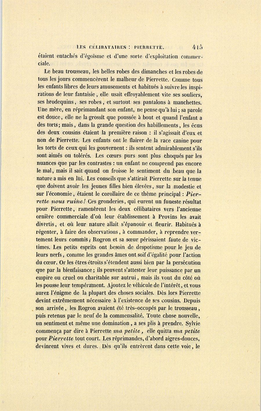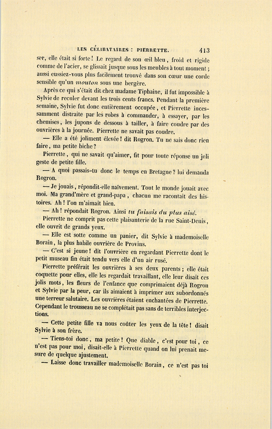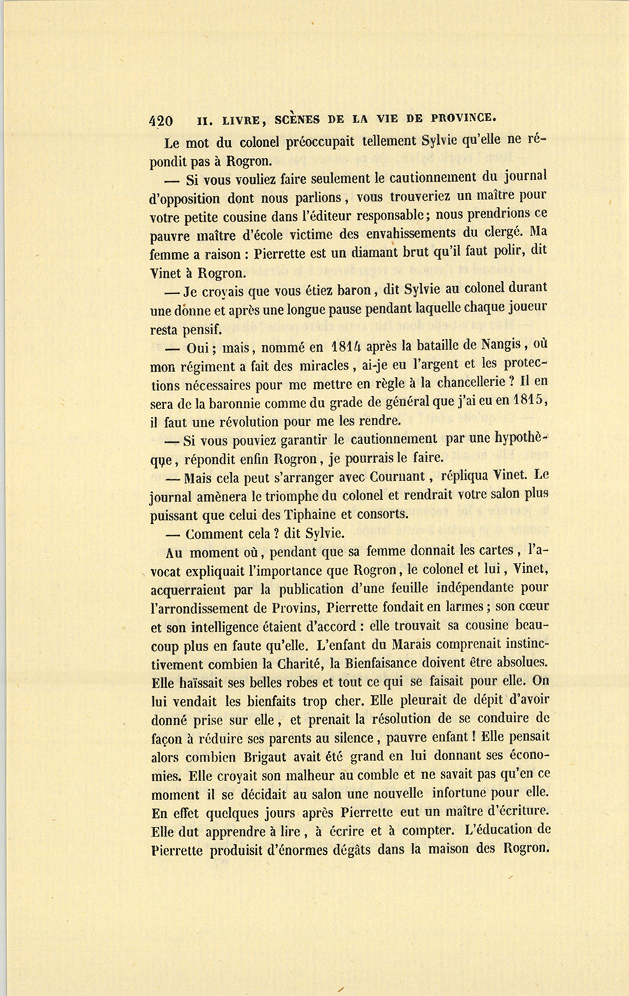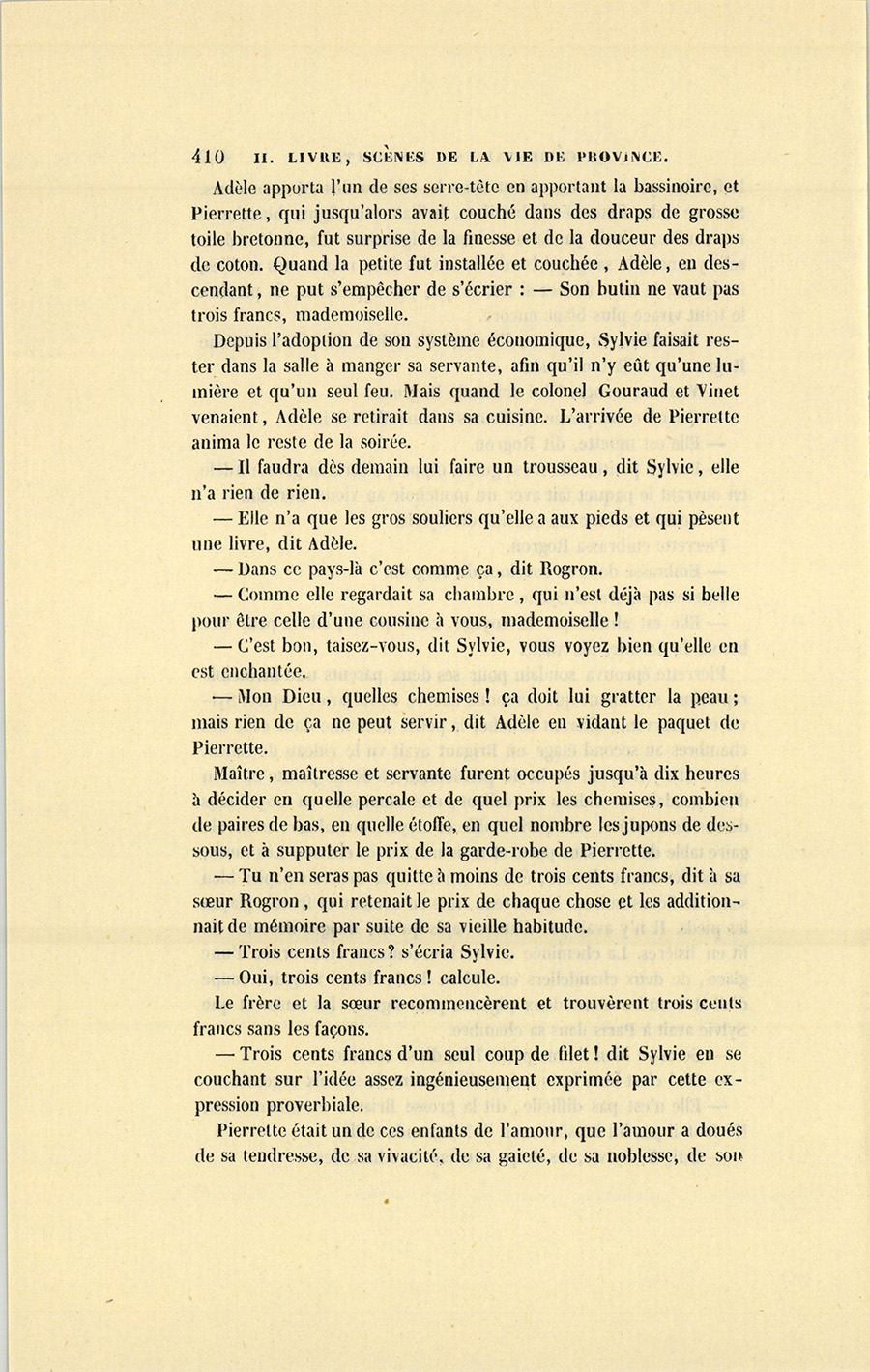 La lettre des Lorrain vint au milieu d’une méditation inspirée par ce bel avenir. Les merciers connaissaient à peine leur cousine Pierrette Lorrain. L’affaire de la succession Auffray, traitée depuis long-temps par le vieil aubergiste, avait eu lieu pendant leur établissement, et Rogron causait très-peu sur ses capitaux. Envoyés de bonne heure à Paris, le frère et la sœur se souvenaient à peine de leur tante Lorrain. Une heure de discussions généalogiques leur fut nécessaire pour se remémorer leur tante, fille du second lit de leur grand-père Auffray, sœur consanguine de leur mère. Ils retrouvèrent la mère de madame Lorrain dans madame Néraud, morte de chagrin. Ils jugèrent alors que le second mariage de leur grand-père avait été pour eux une chose funeste ; son résultat était le partage de la succession Auffray entre les deux lits. Ils avaient d’ailleurs entendu quelques récriminations de leur père, toujours un peu goguenard et aubergiste. Les deux merciers examinèrent la lettre des Lorrain à travers ces souvenirs peu favorables à la cause de Pierrette. Se charger d’une orpheline, d’une fille, d’une cousine qui, malgré tout, serait leur héritière au cas où ni l’un ni l’autre ne se marierait, il y avait là matière à discussion. La question fut étudiée sous toutes ses faces. D’abord ils n’avaient jamais vu Pierrette. Puis ce serait un ennui que d’avoir une jeune fille à garder. Ne prendraient-ils pas des obligations avec elle ? il serait impossible de la renvoyer si elle ne leur convenait pas ; enfin ne faudrait-il pas la marier ? Et si Rogron trouvait chaussure à son pied parmi les héritières de Provins, ne valait-il pas mieux réserver toute leur fortune pour ses enfants ? Selon Sylvie, une chaussure au pied de son frère était une fille bête, riche et laide, qui se laisserait gouverner par elle. Les deux marchands se décidèrent à refuser. Sylvie se chargea {p. 386} de la réponse. Le courant des affaires fut assez considérable pour retarder cette lettre, qui ne semblait pas urgente, et à laquelle la vieille fille ne pensa plus dès que leur première demoiselle consentit à traiter du fonds de la Sœur-de-Famille. Sylvie Rogron et son frère partirent pour Provins quatre ans avant le jour où la venue de Brigaut allait jeter tant d’intérêt dans la vie de Pierrette. Mais les œuvres de ces deux personnes en province exigent une explication aussi nécessaire que celle sur leur existence à Paris, car Provins ne devait pas moins être funeste à Pierrette que les antécédents commerciaux de ses cousins.