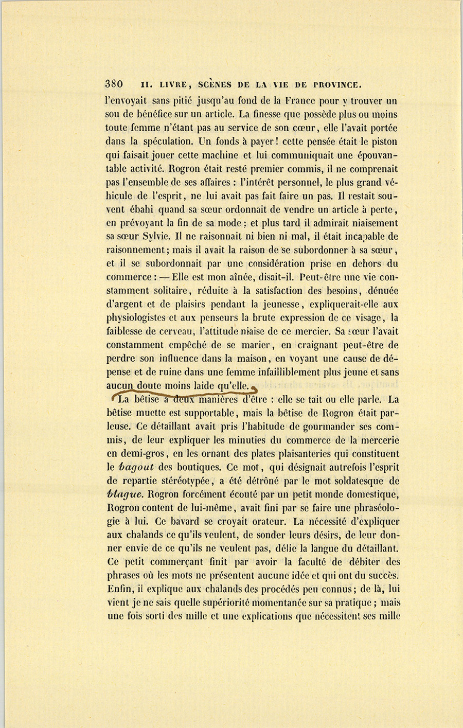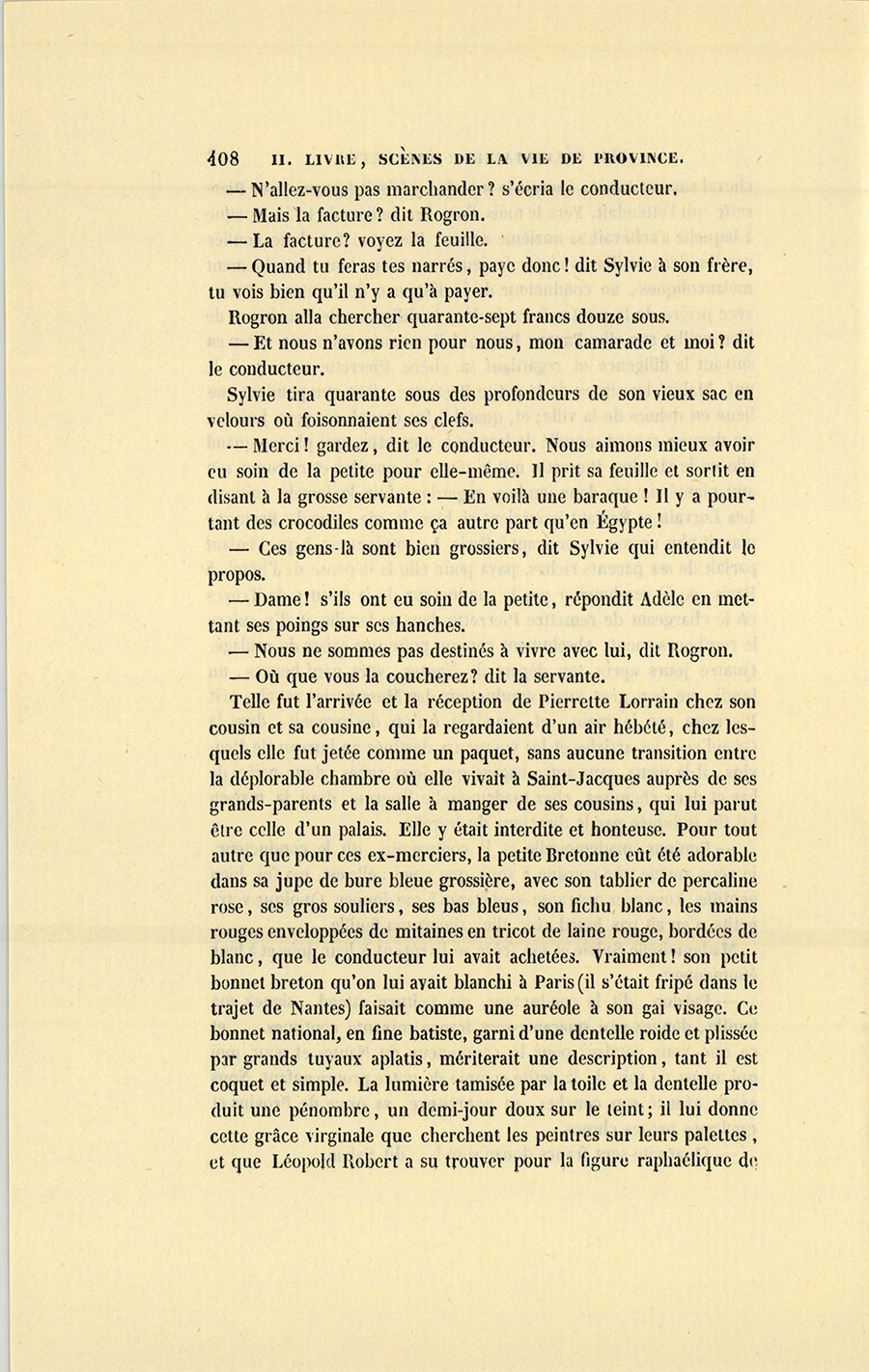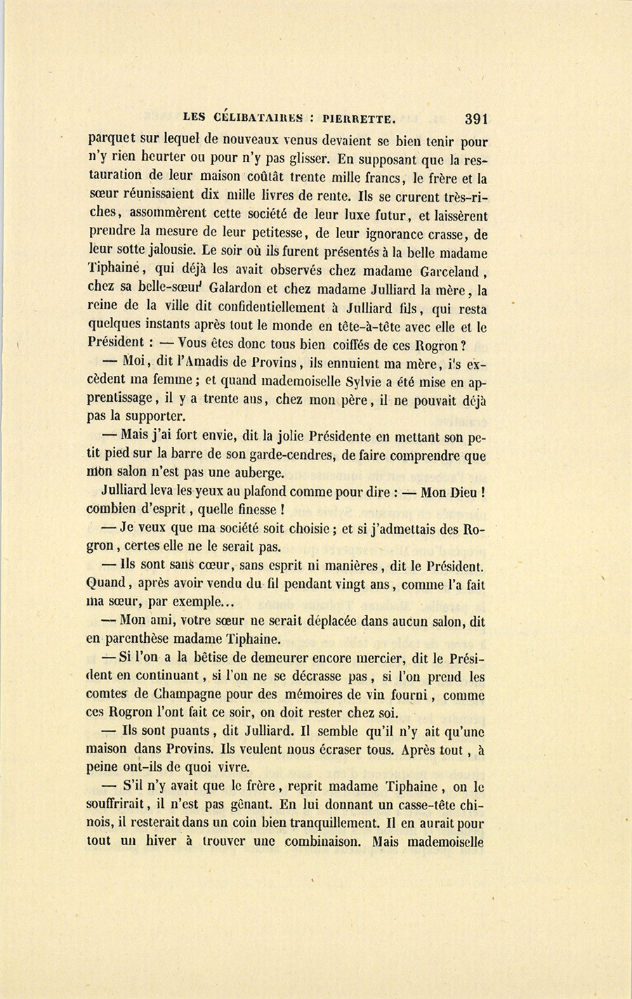 – Si l’on a la bêtise de demeurer encore mercier, dit le Président en continuant, si l’on ne se décrasse pas, si l’on prend les comtes de Champagne pour des mémoires de vin fourni, comme ces Rogron l’ont fait ce soir, on doit rester chez soi.
