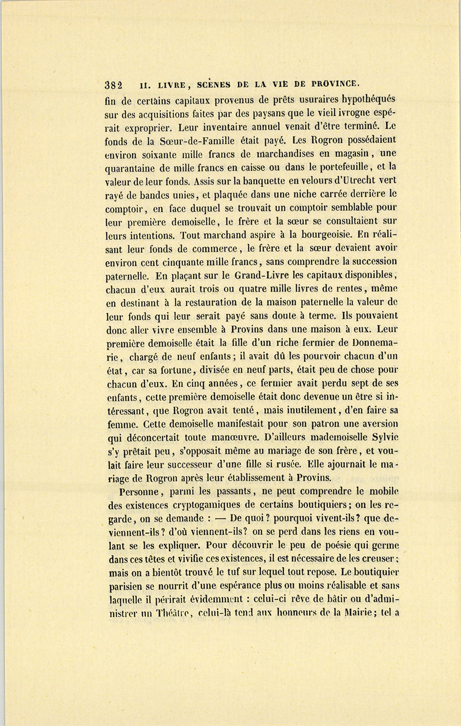 Quand la lettre des Lorrain arriva, les Rogron, en deuil de leur père, avaient hérité de la maison à peu près volée à la grand’mère de Pierrette, puis des terres acquises par l’ancien aubergiste ; {p. 382} enfin de certains capitaux provenus de prêts usuraires hypothéqués sur des acquisitions faites par des paysans que le vieil ivrogne espérait exproprier. Leur inventaire annuel venait d’être terminé. Le fonds de la Sœur-de-Famille était payé. Les Rogron possédaient environ soixante mille francs de marchandises en magasin, une quarantaine de mille francs en caisse ou dans le portefeuille, et la valeur de leur fonds. Assis sur la banquette en velours d’Utrecht vert rayé de bandes unies, et plaquée dans une niche carrée derrière le comptoir, en face duquel se trouvait un comptoir semblable pour leur première demoiselle, le frère et la sœur se consultaient sur leurs intentions. Tout marchand aspire à la bourgeoisie. En réalisant leur fonds de commerce, le frère et la sœur devaient avoir environ cent cinquante mille francs, sans comprendre la succession paternelle. En plaçant sur le Grand-Livre les capitaux disponibles, chacun d’eux aurait trois ou quatre mille livres de rentes, même en destinant à la restauration de la maison paternelle la valeur de leur fonds qui leur serait payé sans doute à terme. Ils pouvaient donc aller vivre ensemble à Provins dans une maison à eux. Leur première demoiselle était la fille d’un riche fermier de Donnemarie, chargé de neuf enfants ; il avait dû les pourvoir chacun d’un état, car sa fortune, divisée en neuf parts, était peu de chose pour chacun d’eux. En cinq années, ce fermier avait perdu sept de ses enfants, cette première demoiselle était donc devenue un être si intéressant, que Rogron avait tenté, mais inutilement, d’en faire sa femme. Cette demoiselle manifestait pour son patron une aversion qui déconcertait toute manœuvre. D’ailleurs mademoiselle Sylvie s’y prêtait peu, s’opposait même au mariage de son frère, et voulait faire leur successeur d’une fille si rusée. Elle ajournait le mariage de Rogron après leur établissement à Provins.