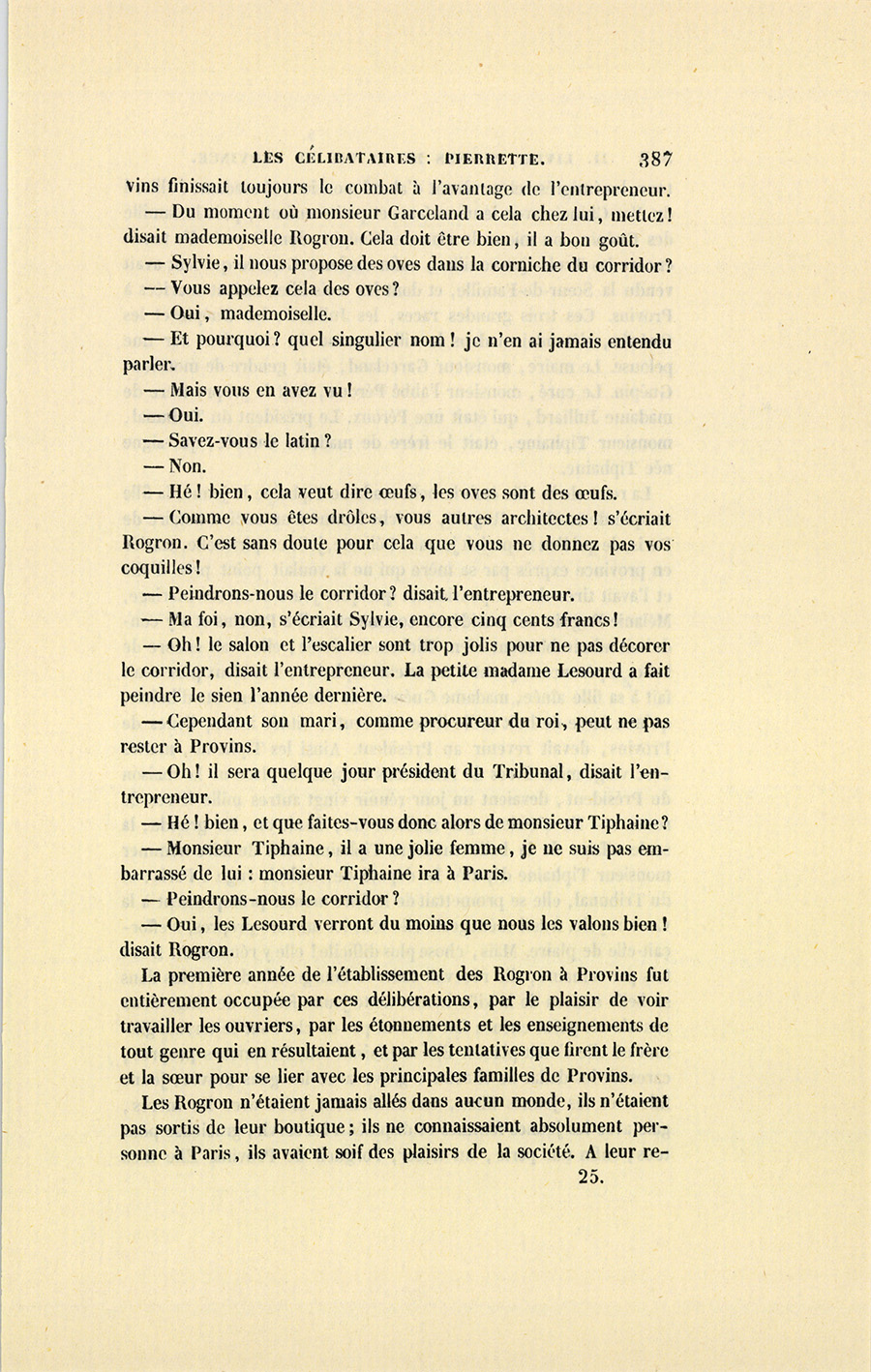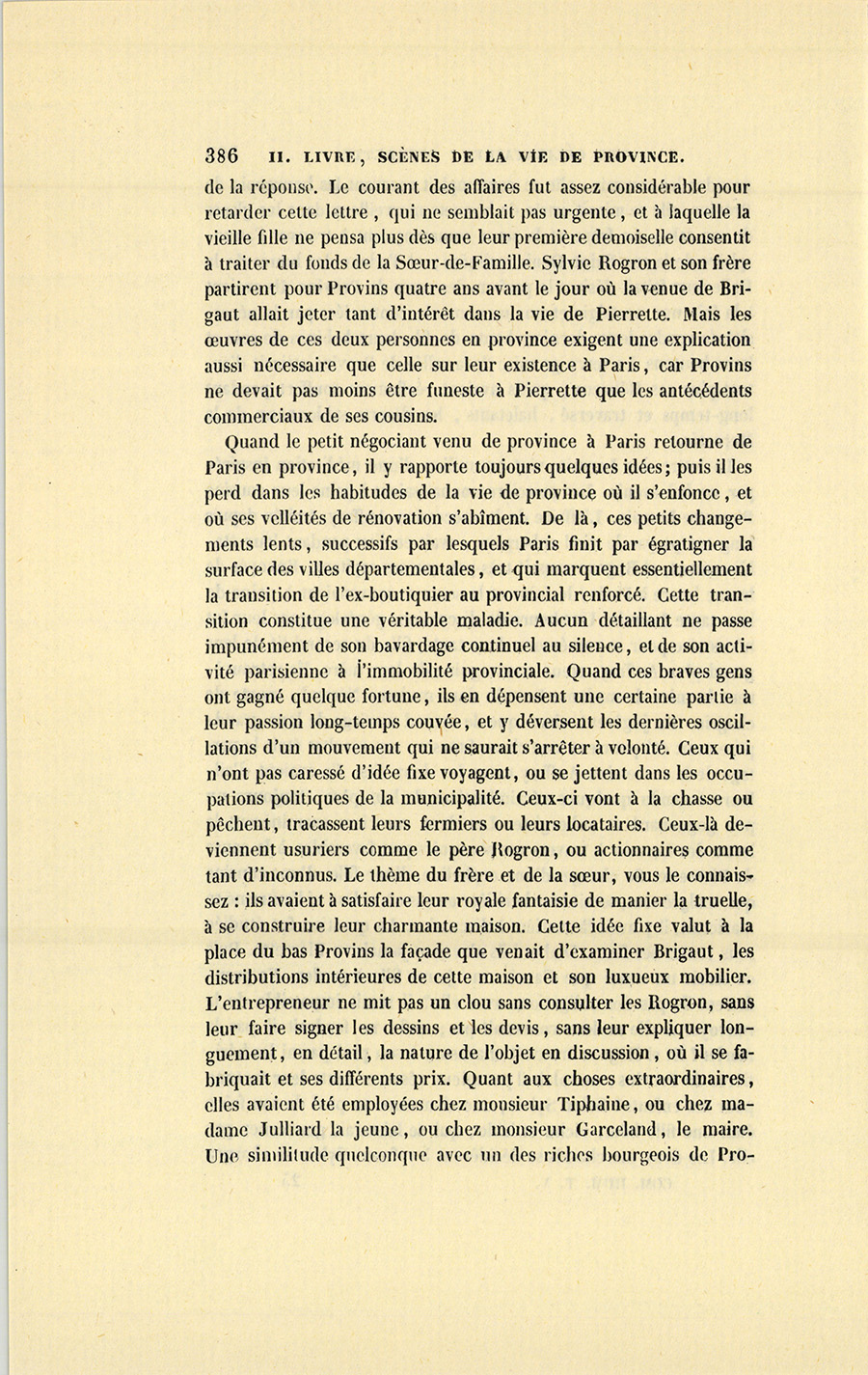 Quand le petit négociant venu de province à Paris retourne de Paris en province, il y rapporte toujours quelques idées ; puis il les perd dans les habitudes de la vie de province où il s’enfonce, et où ses velléités de rénovation s’abîment. De là, ces petits changements lents, successifs par lesquels Paris finit par égratigner la surface des villes départementales, et qui marquent essentiellement la transition de l’ex-boutiquier au provincial renforcé. Cette transition constitue une véritable maladie. Aucun détaillant ne passe impunément de son bavardage continuel au silence, et de son activité parisienne à l’immobilité provinciale. Quand ces braves gens ont gagné quelque fortune, ils en dépensent une certaine partie à leur passion long-temps couvée, et y déversent les dernières oscillations d’un mouvement qui ne saurait s’arrêter à volonté. Ceux qui n’ont pas caressé d’idée fixe voyagent, ou se jettent dans les occupations politiques de la municipalité. Ceux-ci vont à la chasse ou pêchent, tracassent leurs fermiers ou leurs locataires. Ceux-là deviennent usuriers comme le père Rogron, ou actionnaires comme tant d’inconnus. Le thème du frère et de la sœur, vous le connaissez : ils avaient à satisfaire leur royale fantaisie de manier la truelle, à se construire leur charmante maison. Cette idée fixe valut à la place du bas Provins la façade que venait d’examiner Brigaut, les distributions intérieures de cette maison et son luxueux mobilier. L’entrepreneur ne mit pas un clou sans consulter les Rogron, sans leur faire signer les dessins et les devis, sans leur expliquer longuement, en détail, la nature de l’objet en discussion, où il se fabriquait et ses différents prix. Quant aux choses extraordinaires, elles avaient été employées chez monsieur Tiphaine, ou chez madame Julliard la jeune, ou chez monsieur Garceland, le maire. Une similitude quelconque avec un des riches bourgeois de {p. 387} Provins finissait toujours le combat à l’avantage de l’entrepreneur.