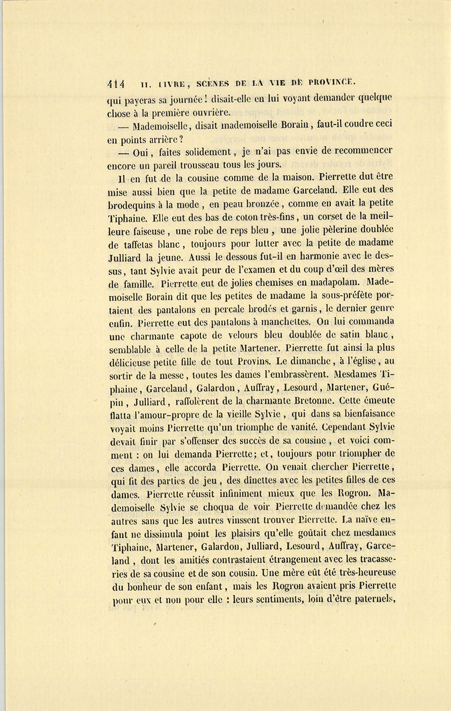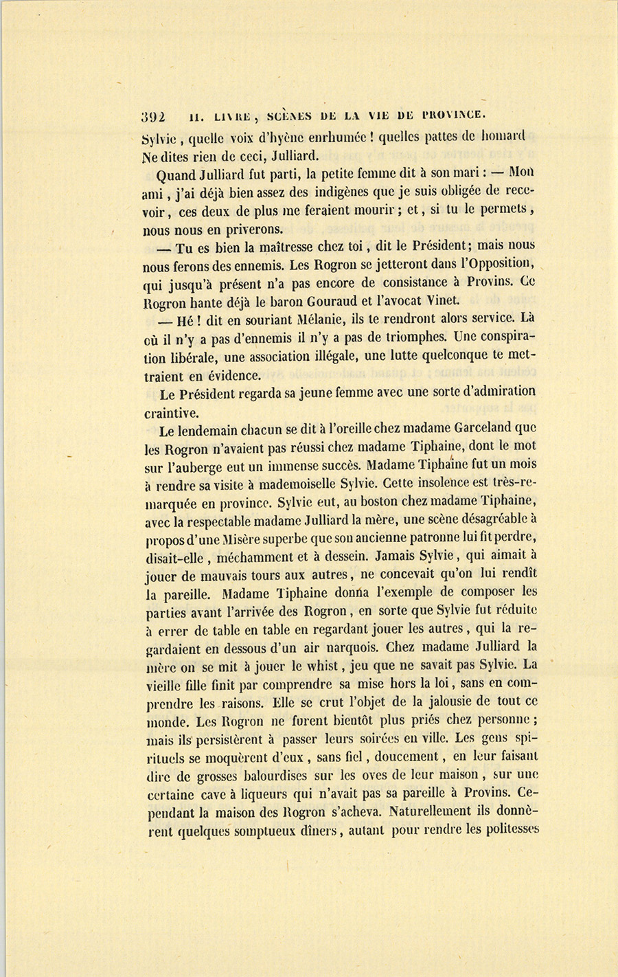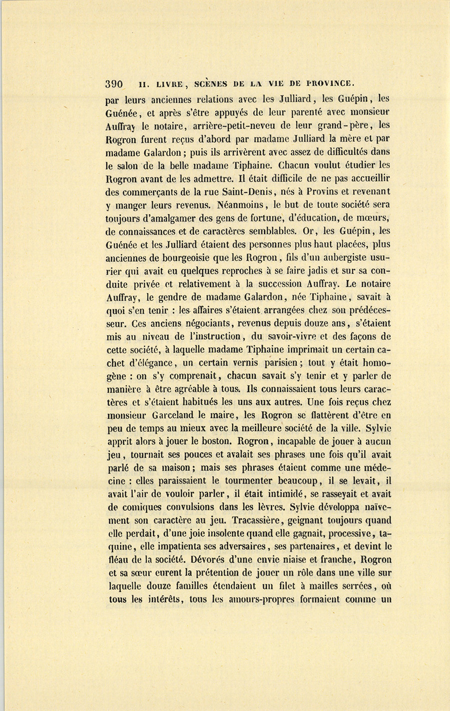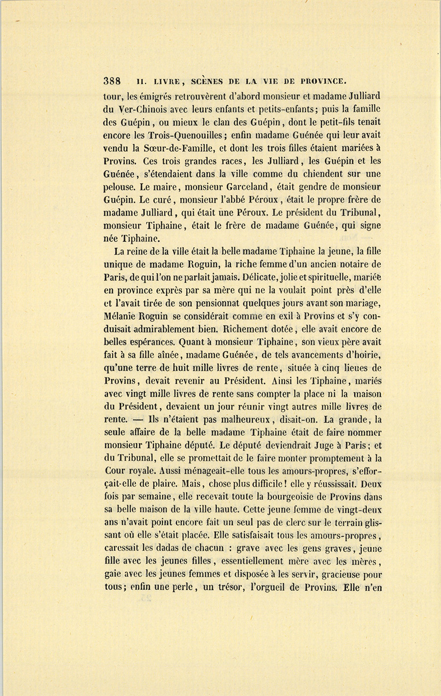 Les Rogron n’étaient jamais allés dans aucun monde, ils n’étaient pas sortis de leur boutique ; ils ne connaissaient absolument personne à Paris, ils avaient soif des plaisirs de la société. À leur {p. 388} retour, les émigrés retrouvèrent d’abord monsieur et madame Julliard du Ver-Chinois avec leurs enfants et petits-enfants ; puis la famille des Guépin, ou mieux le clan des Guépin, dont le petit-fils tenait encore les Trois-Quenouilles ; enfin madame Guénée qui leur avait vendu la Sœur-de-Famille, et dont les trois filles étaient mariées à Provins. Ces trois grandes races, les Julliard, les Guépin et les Guénée, s’étendaient dans la ville comme du chiendent sur une pelouse. Le maire, monsieur Garceland, était gendre de monsieur Guépin. Le curé, monsieur l’abbé Péroux, était le propre frère de madame Julliard, qui était une Péroux. Le président du Tribunal, monsieur Tiphaine, était le frère de madame Guénée, qui signe née Tiphaine.