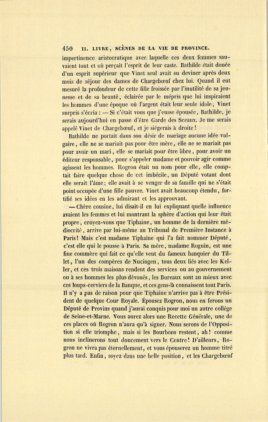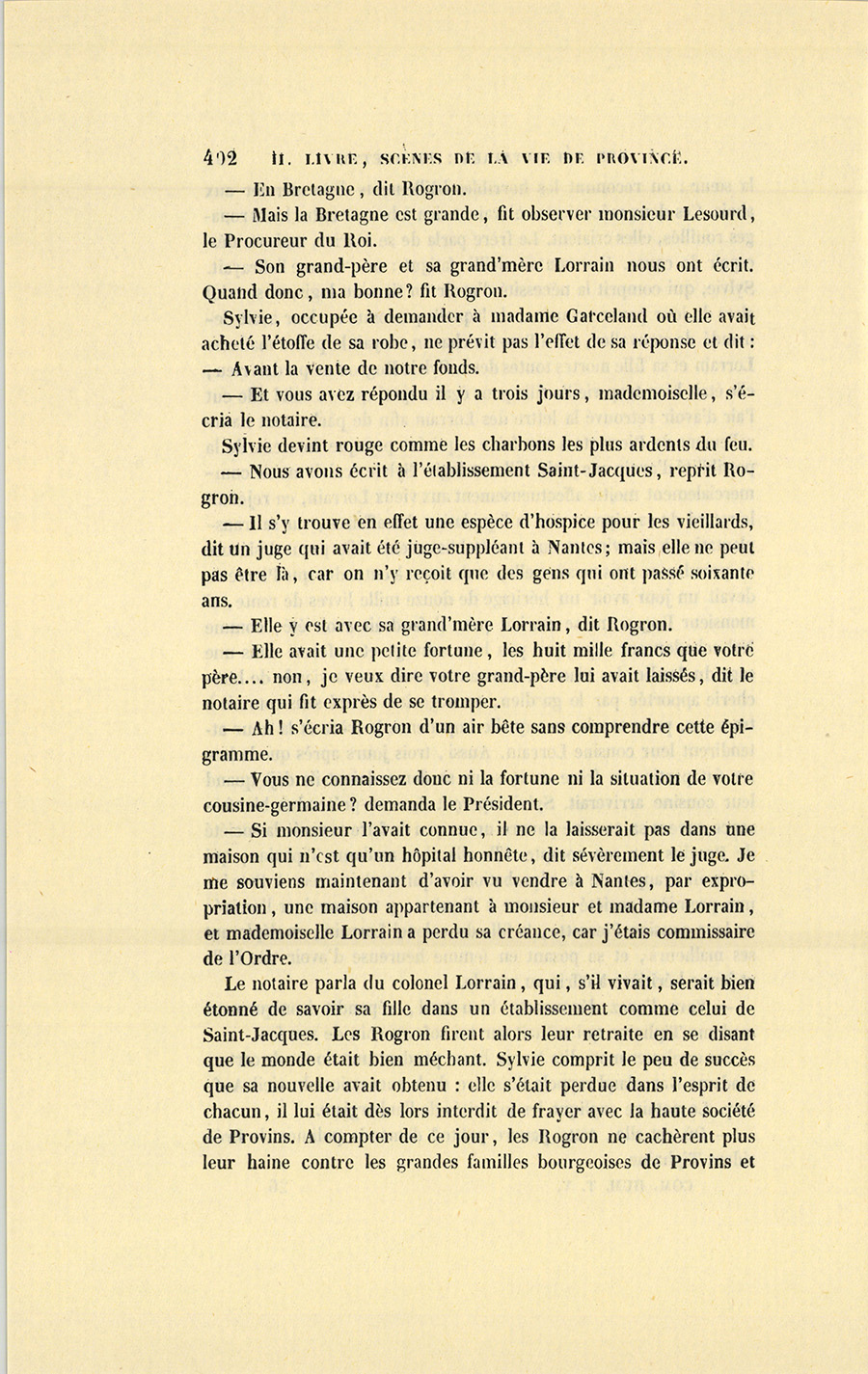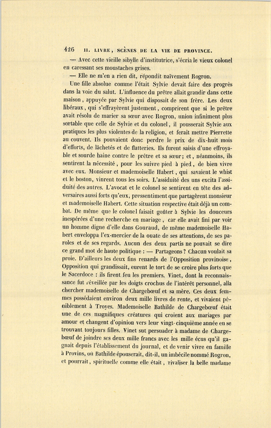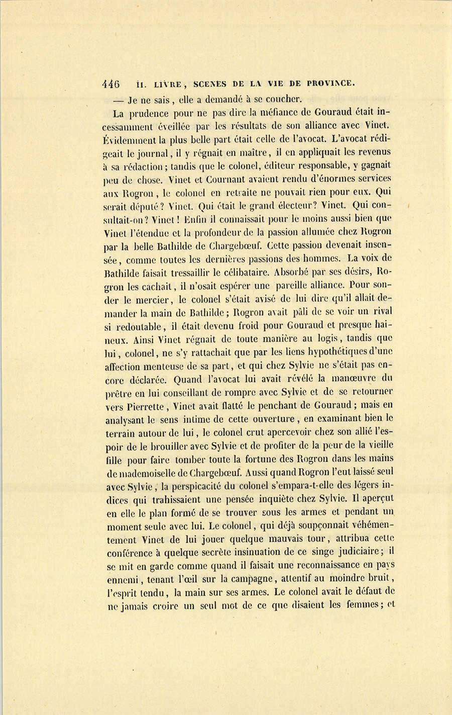 Les Rogron n’étaient jamais allés dans aucun monde, ils n’étaient pas sortis de leur boutique ; ils ne connaissaient absolument personne à Paris, ils avaient soif des plaisirs de la société. À leur {p. 388} retour, les émigrés retrouvèrent d’abord monsieur et madame Julliard du Ver-Chinois avec leurs enfants et petits-enfants ; puis la famille des Guépin, ou mieux le clan des Guépin, dont le petit-fils tenait encore les Trois-Quenouilles ; enfin madame Guénée qui leur avait vendu la Sœur-de-Famille, et dont les trois filles étaient mariées à Provins. Ces trois grandes races, les Julliard, les Guépin et les Guénée, s’étendaient dans la ville comme du chiendent sur une pelouse. Le maire, monsieur Garceland, était gendre de monsieur Guépin. Le curé, monsieur l’abbé Péroux, était le propre frère de madame Julliard, qui était une Péroux. Le président du Tribunal, monsieur Tiphaine, était le frère de madame Guénée, qui signe née Tiphaine.