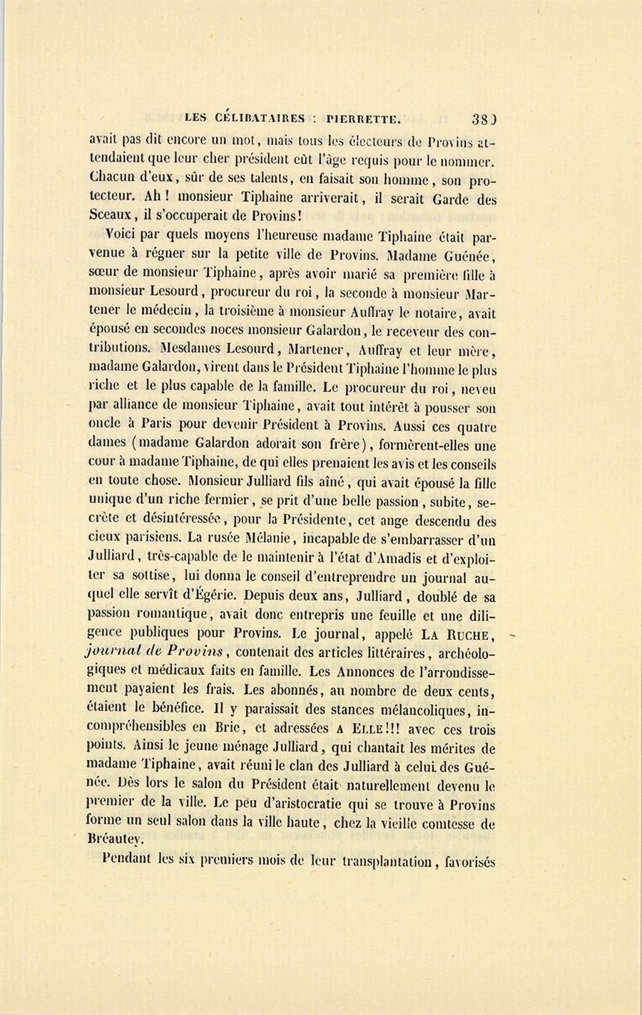 Voici par quels moyens l’heureuse madame Tiphaine était parvenue à régner sur la petite ville de Provins. Madame Guénée, sœur de monsieur Tiphaine, après avoir marié sa première fille à monsieur Lesourd, procureur du roi, la seconde à monsieur Martener le médecin, la troisième à monsieur Auffray le notaire, avait épousé en secondes noces monsieur Galardon, le receveur des contributions. Mesdames Lesourd, Martener, Auffray et leur mère, madame Galardon, virent dans le Président Tiphaine l’homme le plus riche et le plus capable de la famille. Le procureur du roi, neveu par alliance de monsieur Tiphaine, avait tout intérêt à pousser son oncle à Paris pour devenir Président à Provins. Aussi ces quatre dames (madame Galardon adorait son frère), formèrent-elles une cour à madame Tiphaine, de qui elles prenaient les avis et les conseils en toute chose. Monsieur Julliard fils aîné, qui avait épousé la fille unique d’un riche fermier, se prit d’une belle passion, subite, secrète et désintéressée, pour la Présidente, cet ange descendu des cieux parisiens. La rusée Mélanie, incapable de s’embarrasser d’un Julliard, très-capable de le maintenir à l’état d’Amadis et d’exploiter sa sottise, lui donna le conseil d’entreprendre un journal auquel elle servît d’Égérie. Depuis deux ans, Julliard, doublé de sa passion romantique, avait donc entrepris une feuille et une diligence publiques pour Provins. Le journal, appelé La Ruche, journal de Provins, contenait des articles littéraires, archéologiques et médicaux faits en famille. Les Annonces de l’arrondissement payaient les frais. Les abonnés, au nombre de deux cents, étaient le bénéfice. Il y paraissait des stances mélancoliques, incompréhensibles en Brie, et adressées à Elle !!! avec ces trois points. Ainsi le jeune ménage Julliard, qui chantait les mérites de madame Tiphaine, avait réuni le clan des Julliard à celui des Guénée. Dès lors le salon du Président était naturellement devenu le premier de la ville. Le peu d’aristocratie qui se trouve à Provins forme un seul salon dans la ville haute, chez la vieille comtesse de Bréautey.