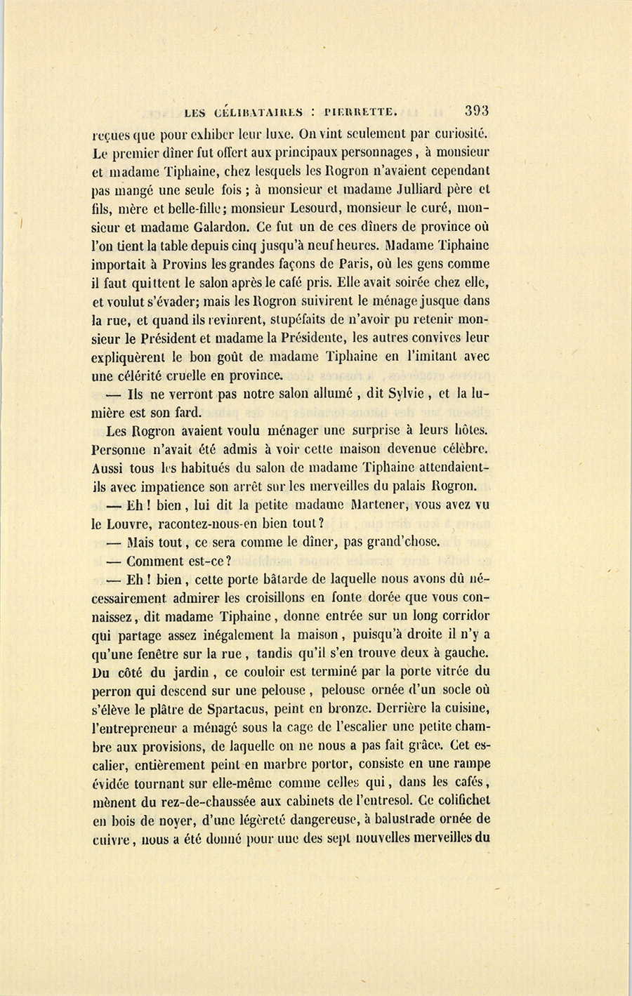 La belle madame Tiphaine continua sa description épigrammatique. D’après cet échantillon, chacun se figurera facilement {p. 397} l’appartement que la sœur et le frère occupaient au premier étage et qu’ils montrèrent à leurs hôtes ; mais personne ne saurait inventer les sottes recherches auxquelles le spirituel entrepreneur avait entraîné les Rogron : les moulures des portes, les volets intérieurs façonnés, les pâtes d’ornement dans les corniches, les jolies peintures, les mains en cuivre doré, les sonnettes, les intérieurs de cheminée à systèmes fumivores, les inventions pour éviter l’humidité, les tableaux de marqueterie figurés par la peinture dans l’escalier, la vitrerie, la serrurerie superfines ; enfin tous ces colifichets, qui renchérissent une construction et qui plaisent aux bourgeois, avaient été prodigués outre mesure.