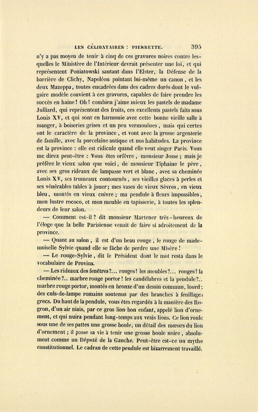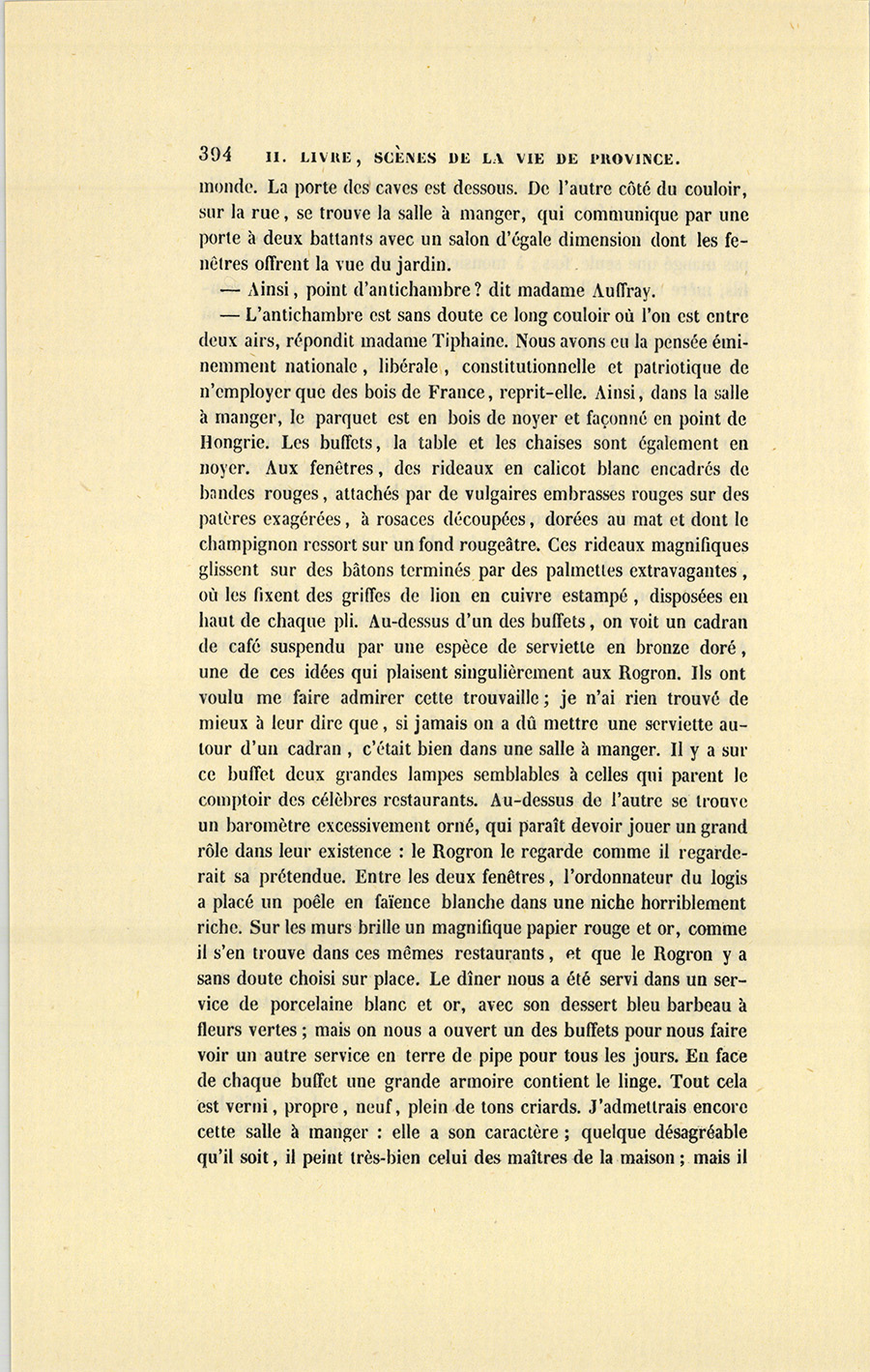 – L’antichambre est sans doute ce long couloir où l’on est entre deux airs, répondit madame Tiphaine. Nous avons eu la pensée éminemment nationale, libérale, constitutionnelle et patriotique de n’employer que des bois de France, reprit-elle. Ainsi, dans la salle à manger, le parquet est en bois de noyer et façonné en point de Hongrie. Les buffets, la table et les chaises sont également en noyer. Aux fenêtres, des rideaux en calicot blanc encadrés de bandes rouges, attachés par de vulgaires embrasses rouges sur des patères exagérées, à rosaces découpées, dorées au mat et dont le champignon ressort sur un fond rougeâtre. Ces rideaux magnifiques glissent sur des bâtons terminés par des palmettes extravagantes, où les fixent des griffes de lion en cuivre estampé, disposées en haut de chaque pli. Au-dessus d’un des buffets, on voit un cadran de café suspendu par une espèce de serviette en bronze doré, une de ces idées qui plaisent singulièrement aux Rogron. Ils ont voulu me faire admirer cette trouvaille ; je n’ai rien trouvé de mieux à leur dire que, si jamais on a dû mettre une serviette autour d’un cadran, c’était bien dans une salle à manger. Il y a sur ce buffet deux grandes lampes semblables à celles qui parent le comptoir des célèbres restaurants. Au-dessus de l’autre se trouve un baromètre excessivement orné, qui paraît devoir jouer un grand rôle dans leur existence : le Rogron le regarde comme il regarderait sa prétendue. Entre les deux fenêtres, l’ordonnateur du logis a placé un poêle en faïence blanche dans une niche horriblement riche. Sur les murs brille un magnifique papier rouge et or, comme il s’en trouve dans ces mêmes restaurants, et que le Rogron y a sans doute choisi sur place. Le dîner nous a été servi dans un service de porcelaine blanc et or, avec son dessert bleu barbeau à fleurs vertes ; mais on nous a ouvert un des buffets pour nous faire voir un autre service en terre de pipe pour tous les jours. En face de chaque buffet une grande armoire contient le linge. Tout cela est verni, propre, neuf, plein de tons criards. J’admettrais encore cette salle à manger : elle a son caractère ; quelque désagréable qu’il soit, il peint très-bien celui des maîtres de la maison ; mais il {p. 395} n’y a pas moyen de tenir à cinq de ces gravures noires contre lesquelles le Ministère de l’Intérieur devrait présenter une loi, et qui représentent Poniatowski sautant dans l’Elster, la Défense de la barrière de Clichy, Napoléon pointant lui-même un canon, et les deux Mazeppa, toutes encadrées dans des cadres dorés dont le vulgaire modèle convient à ces gravures, capables de faire prendre les succès en haine ! Oh ! combien j’aime mieux les pastels de madame Julliard, qui représentent des fruits, ces excellents pastels faits sous Louis XV, et qui sont en harmonie avec cette bonne vieille salle à manger, à boiseries grises et un peu vermoulues, mais qui certes ont le caractère de la province, et vont avec la grosse argenterie de famille, avec la porcelaine antique et nos habitudes. La province est la province : elle est ridicule quand elle veut singer Paris. Vous me direz peut-être : Vous êtes orfèvre, monsieur Josse ; mais je préfère le vieux salon que voici, de monsieur Tiphaine le père, avec ses gros rideaux de lampasse vert et blanc, avec sa cheminée Louis XV, ses trumeaux contournés, ses vieilles glaces à perles et ses vénérables tables à jouer ; mes vases de vieux Sèvres, en vieux bleu, montés en vieux cuivre ; ma pendule à fleurs impossibles, mon lustre rococo, et mon meuble en tapisserie, à toutes les splendeurs de leur salon.