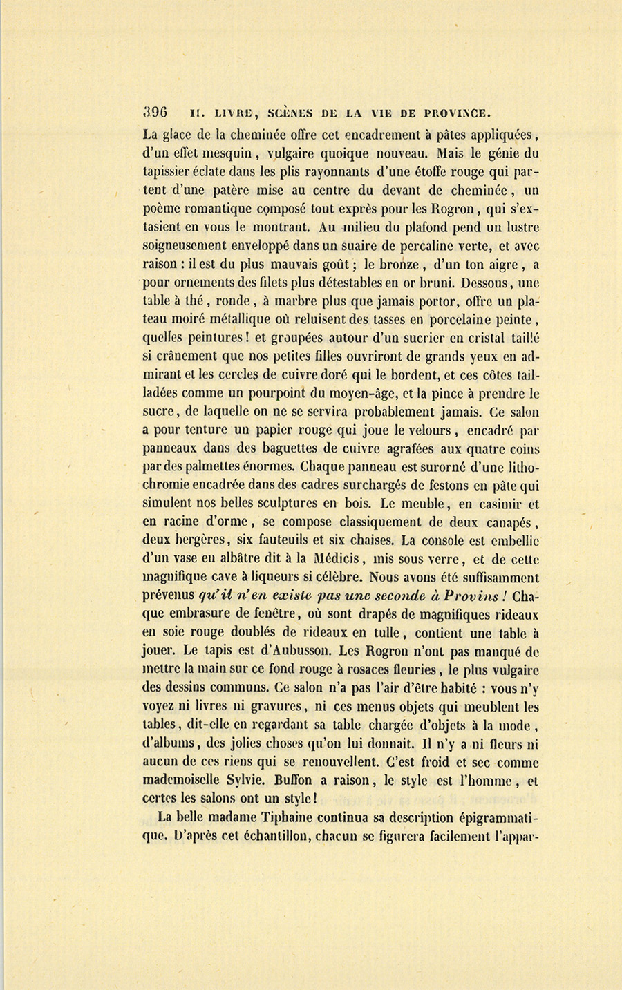 – Les rideaux des fenêtres ?… rouges ! les meubles ?… rouges ! la cheminée ?… marbre rouge portor ! les candélabres et la pendule ?… marbre rouge portor, montés en bronze d’un dessin commun, lourd ; des culs-de-lampe romains soutenus par des branches à feuillages grecs. Du haut de la pendule, vous êtes regardés à la manière des Rogron, d’un air niais, par ce gros lion bon enfant, appelé lion d’ornement, et qui nuira pendant long-temps aux vrais lions. Ce lion roule sous une de ses pattes une grosse boule, un détail des mœurs du lion d’ornement ; il passe sa vie à tenir une grosse boule noire, absolument comme un Député de la Gauche. Peut-être est-ce un mythe constitutionnel. Le cadran de cette pendule est bizarrement travaillé. {p. 396} La glace de la cheminée offre cet encadrement à pâtes appliquées, d’un effet mesquin, vulgaire quoique nouveau. Mais le génie du tapissier éclate dans les plis rayonnants d’une étoffe rouge qui partent d’une patère mise au centre du devant de cheminée, un poème romantique composé tout exprès pour les Rogron, qui s’extasient en vous le montrant. Au milieu du plafond pend un lustre soigneusement enveloppé dans un suaire de percaline verte, et avec raison : il est du plus mauvais goût ; le bronze, d’un ton aigre, a pour ornements des filets plus détestables en or bruni. Dessous, une table à thé, ronde, à marbre plus que jamais portor, offre un plateau moiré métallique où reluisent des tasses en porcelaine peinte, quelles peintures ! et groupées autour d’un sucrier en cristal taillé si crânement que nos petites filles ouvriront de grands yeux en admirant et les cercles de cuivre doré qui le bordent, et ces côtes tailladées comme un pourpoint du moyen-âge, et la pince à prendre le sucre, de laquelle on ne se servira probablement jamais. Ce salon a pour tenture un papier rouge qui joue le velours, encadré par panneaux dans des baguettes de cuivre agrafées aux quatre coins par des palmettes énormes. Chaque panneau est surorné d’une lithochromie encadrée dans des cadres surchargés de festons en pâte qui simulent nos belles sculptures en bois. Le meuble, en casimir et en racine d’orme, se compose classiquement de deux canapés, deux bergères, six fauteuils et six chaises. La console est embellie d’un vase en albâtre dit à la Médicis, mis sous verre, et de cette magnifique cave à liqueurs si célèbre. Nous avons été suffisamment prévenus qu’il n’en existe pas une seconde à Provins ! Chaque embrasure de fenêtre, où sont drapés de magnifiques rideaux en soie rouge doublés de rideaux en tulle, contient une table à jouer. Le tapis est d’Aubusson. Les Rogron n’ont pas manqué de mettre la main sur ce fond rouge à rosaces fleuries, le plus vulgaire des dessins communs. Ce salon n’a pas l’air d’être habité : vous n’y voyez ni livres ni gravures, ni ces menus objets qui meublent les tables, dit-elle en regardant sa table chargée d’objets à la mode, d’albums, des jolies choses qu’on lui donnait. Il n’y a ni fleurs ni aucun de ces riens qui se renouvellent. C’est froid et sec comme mademoiselle Sylvie. Buffon a raison, le style est l’homme, et certes les salons ont un style !