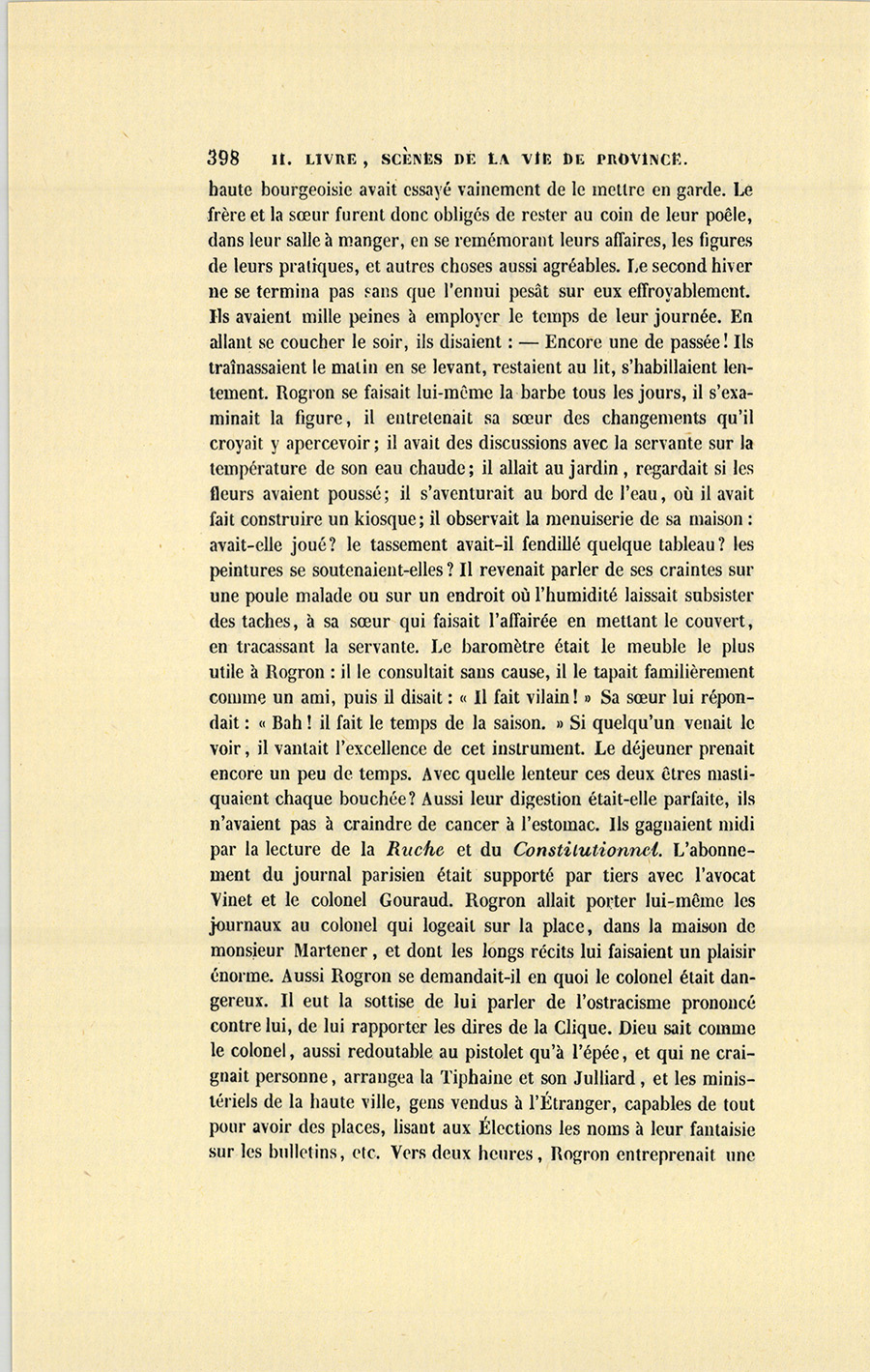 Quatorze mois après leur arrivée, le frère et la sœur tombèrent donc dans une vie solitaire et sans occupation. Son bannissement du monde avait engendré dans le cœur de Sylvie une haine effroyable contre les Tiphaine, les Julliard, les Auffray, les Garceland, enfin contre la société de Provins qu’elle nommait la clique, et avec laquelle ses rapports devinrent excessivement froids. Elle aurait bien voulu leur opposer une seconde société ; mais la bourgeoisie inférieure était entièrement composée de petits commerçants, libres seulement les dimanches et les jours de fête ; ou de gens tarés comme l’avocat Vinet et le médecin Néraud, des bonapartistes inadmissibles comme le colonel baron Gouraud, avec lesquels Rogron se lia d’ailleurs très-inconsidérément, et contre lesquels la {p. 398} haute bourgeoisie avait essayé vainement de le mettre en garde. Le frère et la sœur furent donc obligés de rester au coin de leur poêle, dans leur salle à manger, en se remémorant leurs affaires, les figures de leurs pratiques, et autres choses aussi agréables. Le second hiver ne se termina pas sans que l’ennui pesât sur eux effroyablement. Ils avaient mille peines à employer le temps de leur journée. En allant se coucher le soir, ils disaient : – Encore une de passée ! Ils traînassaient le matin en se levant, restaient au lit, s’habillaient lentement. Rogron se faisait lui-même la barbe tous les jours, il s’examinait la figure, il entretenait sa sœur des changements qu’il croyait y apercevoir ; il avait des discussions avec la servante sur la température de son eau chaude ; il allait au jardin, regardait si les fleurs avaient poussé ; il s’aventurait au bord de l’eau, où il avait fait construire un kiosque ; il observait la menuiserie de sa maison : avait-elle joué ? le tassement avait-il fendillé quelque tableau ? les peintures se soutenaient-elles ? Il revenait parler de ses craintes sur une poule malade ou sur un endroit où l’humidité laissait subsister des taches, à sa sœur qui faisait l’affairée en mettant le couvert, en tracassant la servante. Le baromètre était le meuble le plus utile à Rogron : il le consultait sans cause, il le tapait familièrement comme un ami, puis il disait : « Il fait vilain ! » Sa sœur lui répondait : « Bah ! il fait le temps de la saison. » Si quelqu’un venait le voir, il vantait l’excellence de cet instrument. Le déjeuner prenait encore un peu de temps. Avec quelle lenteur ces deux êtres mastiquaient chaque bouchée ? Aussi leur digestion était-elle parfaite, ils n’avaient pas à craindre de cancer à l’estomac. Ils gagnaient midi par la lecture de la Ruche et du Constitutionnel. L’abonnement du journal parisien était supporté par tiers avec l’avocat Vinet et le colonel Gouraud. Rogron allait porter lui-même les journaux au colonel qui logeait sur la place, dans la maison de monsieur Martener, et dont les longs récits lui faisaient un plaisir énorme. Aussi Rogron se demandait-il en quoi le colonel était dangereux. Il eut la sottise de lui parler de l’ostracisme prononcé contre lui, de lui rapporter les dires de la Clique. Dieu sait comme le colonel, aussi redoutable au pistolet qu’à l’épée, et qui ne craignait personne, arrangea la Tiphaine et son Julliard, et les ministériels de la haute ville, gens vendus à l’Étranger, capables de tout pour avoir des places, lisant aux Élections les noms à leur fantaisie sur les bulletins, etc. Vers deux heures, Rogron entreprenait une {p. 399} petite promenade. Il était bien heureux quand un boutiquier sur le pas de sa porte l’arrêtait en lui disant : – Comment va, père Rogron ? Il causait et demandait des nouvelles de la ville, il écoutait et colportait les commérages, les petits bruits de Provins. Il montait jusqu’à la haute ville et allait dans les chemins creux selon le temps. Parfois, il rencontrait des vieillards en promenade comme lui. Ces rencontres étaient d’heureux événements. Il se trouvait à Provins des gens désabusés de la vie parisienne, des savants modestes vivant avec leurs livres. Jugez de l’attitude de Rogron en écoutant un Juge-suppléant nommé Desfondrilles, plus archéologue que magistrat, disant à l’homme instruit, le vieux monsieur Martener le père, en lui montrant la vallée : – Expliquez-moi pourquoi les oisifs de l’Europe vont à Spa plutôt qu’à Provins, quand les Eaux de Provins ont une supériorité reconnue par la médecine française, une action, une martialité dignes des propriétés médicales de nos roses ?