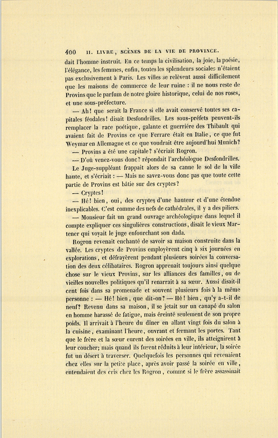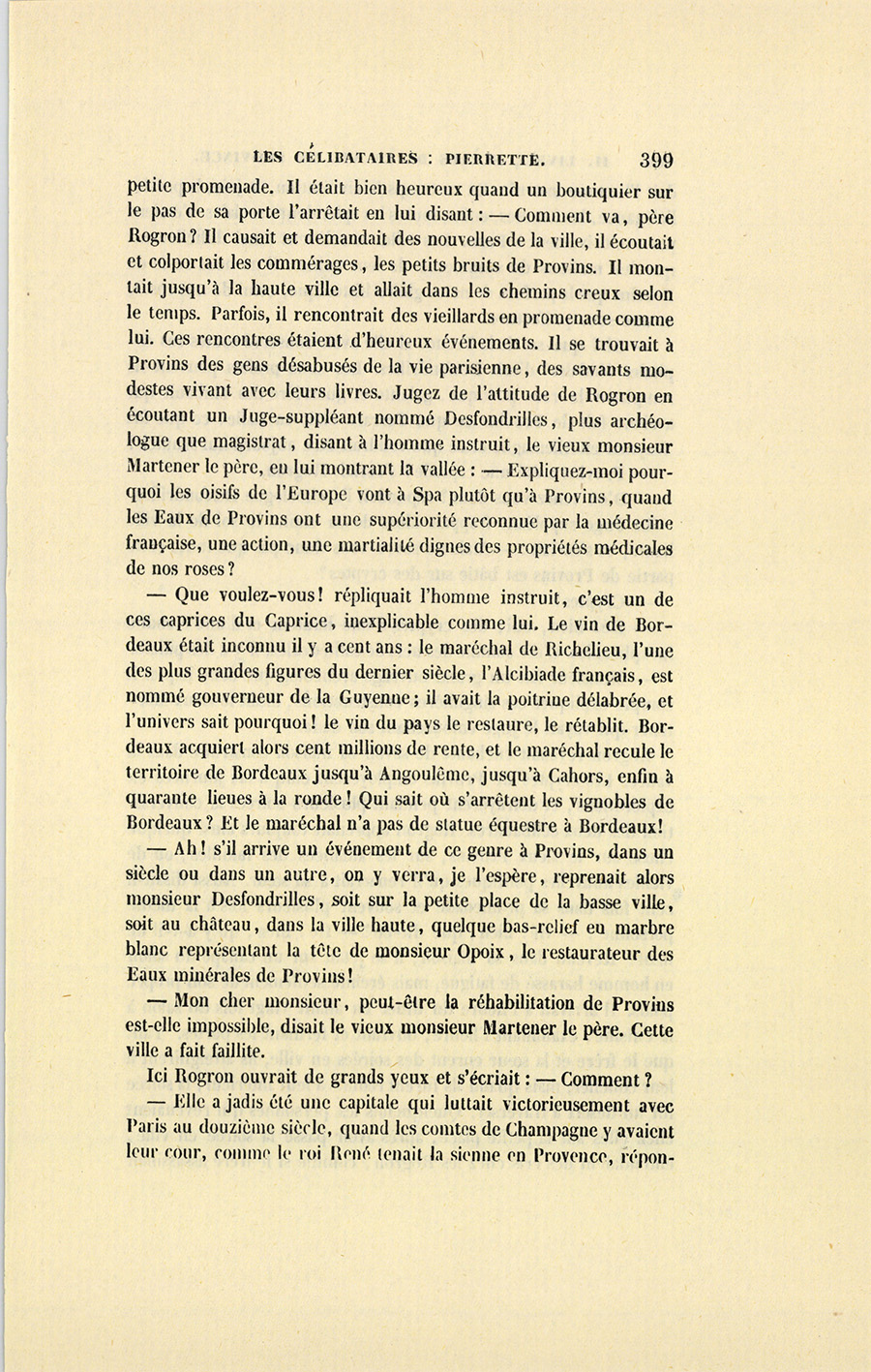 – Ah ! que serait la France si elle avait conservé toutes ses capitales féodales ! disait Desfondrilles. Les sous-préfets peuvent-ils remplacer la race poétique, galante et guerrière des Thibault qui avaient fait de Provins ce que Ferrare était en Italie, ce que fut Weymar en Allemagne et ce que voudrait être aujourd’hui Munich ?
