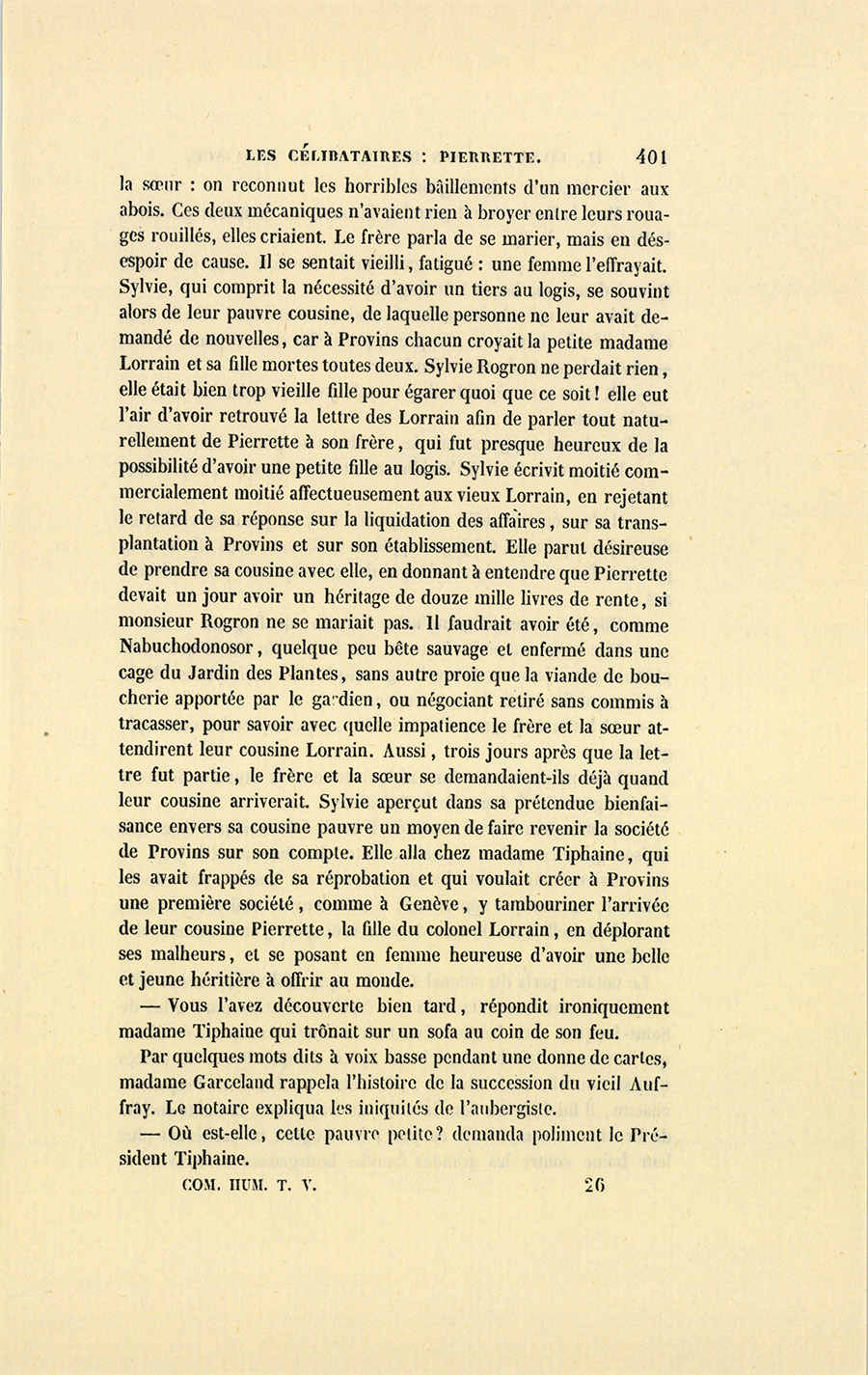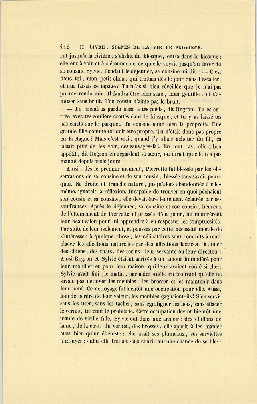 Rogron revenait enchanté de savoir sa maison construite dans la vallée. Les cryptes de Provins employèrent cinq à six journées en explorations, et défrayèrent pendant plusieurs soirées la conversation des deux célibataires. Rogron apprenait toujours ainsi quelque chose sur le vieux Provins, sur les alliances des familles, ou de vieilles nouvelles politiques qu’il renarrait à sa sœur. Aussi disait-il cent fois dans sa promenade et souvent plusieurs fois à la même personne : – Hé ! bien, que dit-on ? – Hé ! bien, qu’y a-t-il de neuf ? Revenu dans sa maison, il se jetait sur un canapé du salon en homme harassé de fatigue, mais éreinté seulement de son propre poids. Il arrivait à l’heure du dîner en allant vingt fois du salon à la cuisine, examinant l’heure, ouvrant et fermant les portes. Tant que le frère et la sœur eurent des soirées en ville, ils atteignirent à leur coucher ; mais quand ils furent réduits à leur intérieur, la soirée fut un désert à traverser. Quelquefois les personnes qui revenaient chez elles sur la petite place, après avoir passé la soirée en ville, entendaient des cris chez les Rogron, comme si le frère assassinait {p. 401} la sœur : on reconnut les horribles bâillements d’un mercier aux abois. Ces deux mécaniques n’avaient rien à broyer entre leurs rouages rouillés, elles criaient. Le frère parla de se marier, mais en désespoir de cause. Il se sentait vieilli, fatigué : une femme l’effrayait. Sylvie, qui comprit la nécessité d’avoir un tiers au logis, se souvint alors de leur pauvre cousine, de laquelle personne ne leur avait demandé de nouvelles, car à Provins chacun croyait la petite madame Lorrain et sa fille mortes toutes deux. Sylvie Rogron ne perdait rien, elle était bien trop vieille fille pour égarer quoi que ce soit ! elle eut l’air d’avoir retrouvé la lettre des Lorrain afin de parler tout naturellement de Pierrette à son frère, qui fut presque heureux de la possibilité d’avoir une petite fille au logis. Sylvie écrivit moitié commercialement moitié affectueusement aux vieux Lorrain, en rejetant le retard de sa réponse sur la liquidation des affaires, sur sa transplantation à Provins et sur son établissement. Elle parut désireuse de prendre sa cousine avec elle, en donnant à entendre que Pierrette devait un jour avoir un héritage de douze mille livres de rente, si monsieur Rogron ne se mariait pas. Il faudrait avoir été, comme Nabuchodonosor, quelque peu bête sauvage et enfermé dans une cage du Jardin des Plantes, sans autre proie que la viande de boucherie apportée par le gardien, ou négociant retiré sans commis à tracasser, pour savoir avec quelle impatience le frère et la sœur attendirent leur cousine Lorrain. Aussi, trois jours après que la lettre fut partie, le frère et la sœur se demandaient-ils déjà quand leur cousine arriverait. Sylvie aperçut dans sa prétendue bienfaisance envers sa cousine pauvre un moyen de faire revenir la société de Provins sur son compte. Elle alla chez madame Tiphaine, qui les avait frappés de sa réprobation et qui voulait créer à Provins une première société, comme à Genève, y tambouriner l’arrivée de leur cousine Pierrette, la fille du colonel Lorrain, en déplorant ses malheurs, et se posant en femme heureuse d’avoir une belle et jeune héritière à offrir au monde.