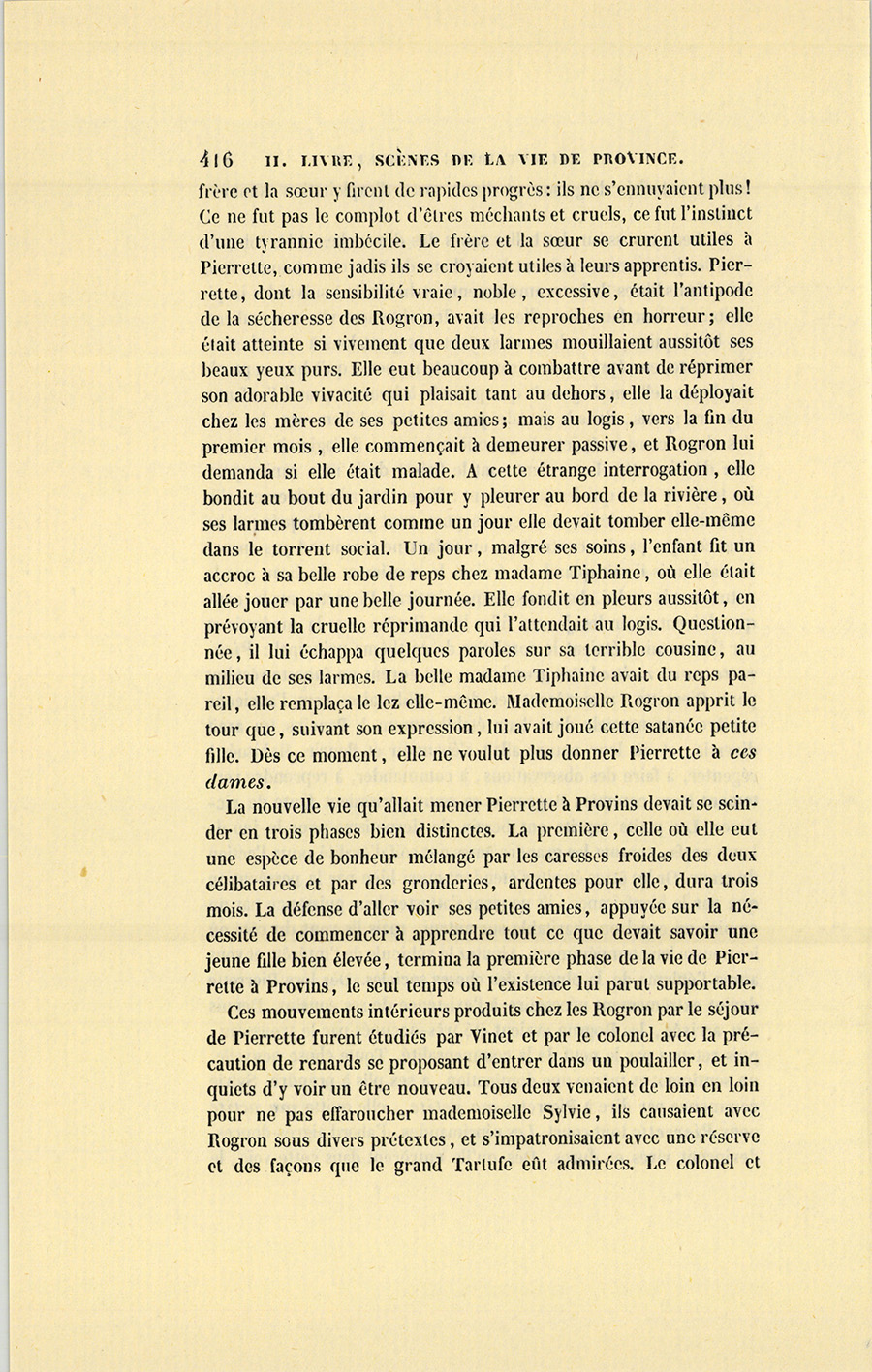 De temps en temps, sur cette petite place, quand un enfant de Provins y arrive de Paris pour s’y établir, et sort de chez mademoiselle Rogron, un ancien partisan des Tiphaine dit : – Les Rogron ont eu dans les temps une triste affaire à cause d’une pupille…