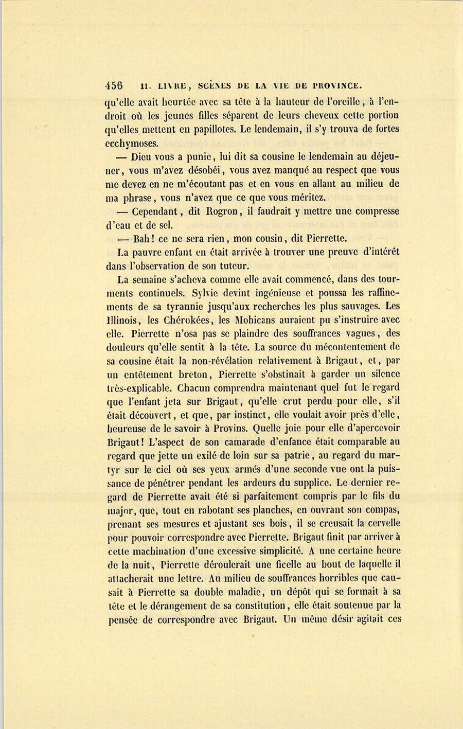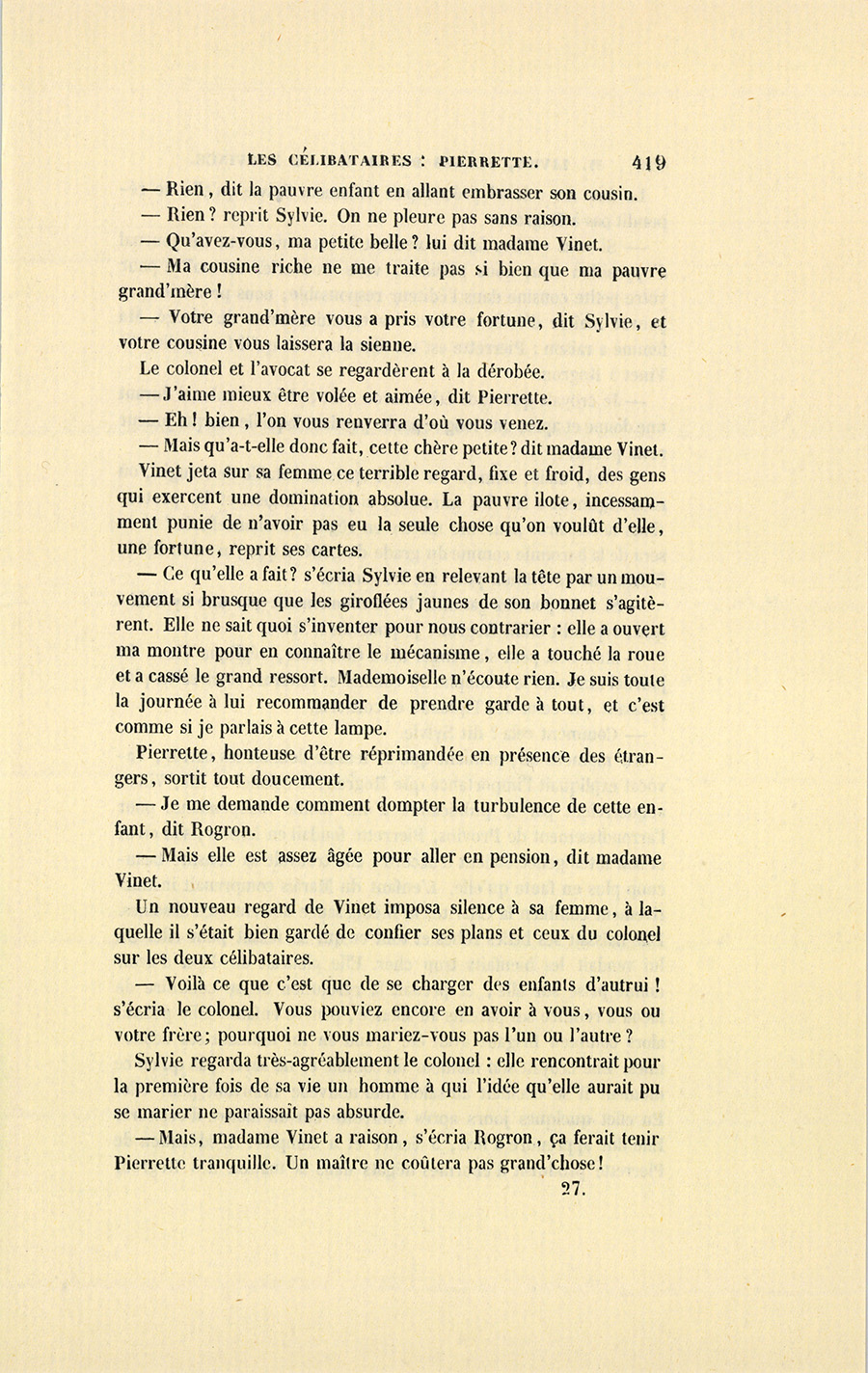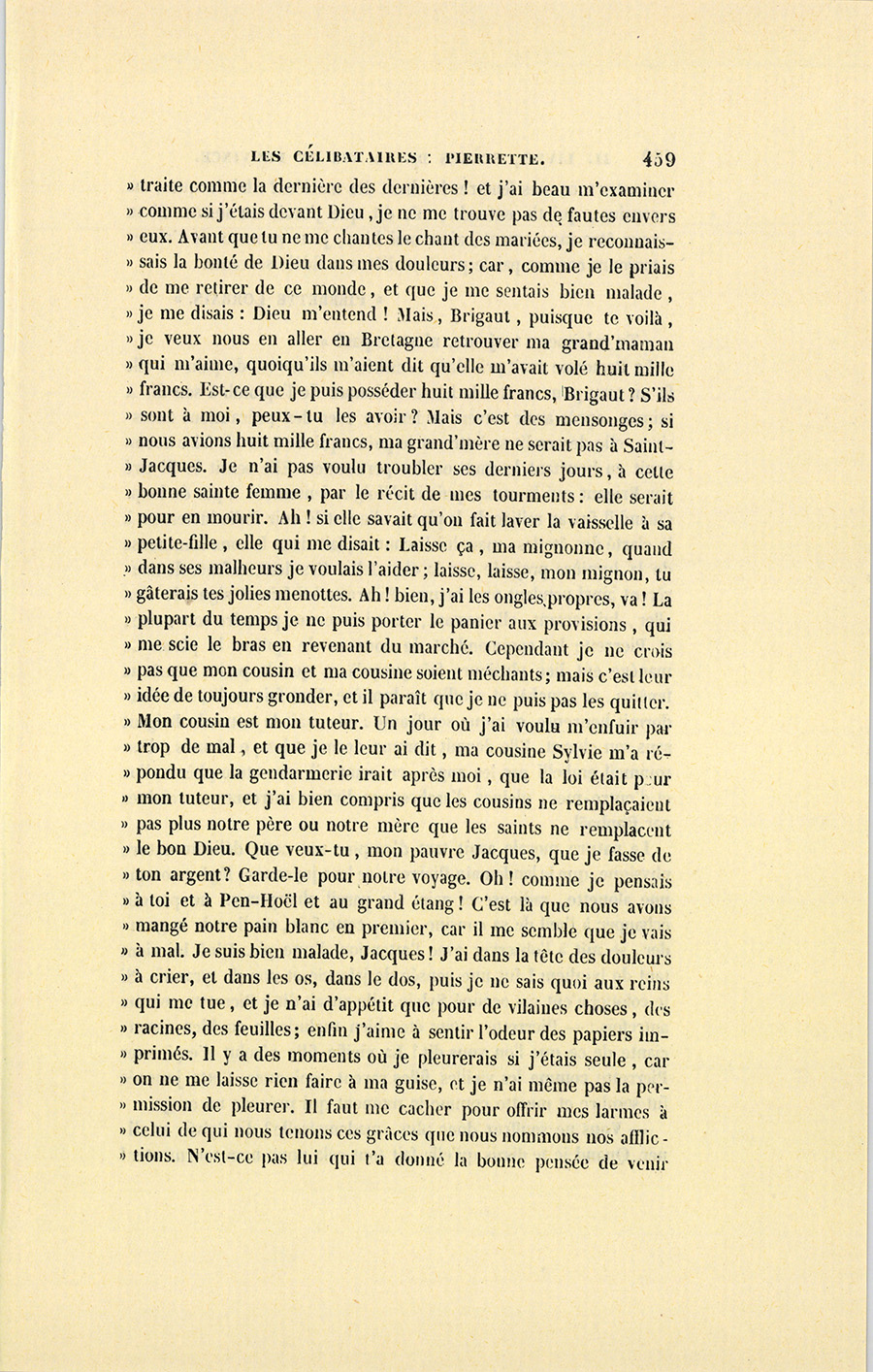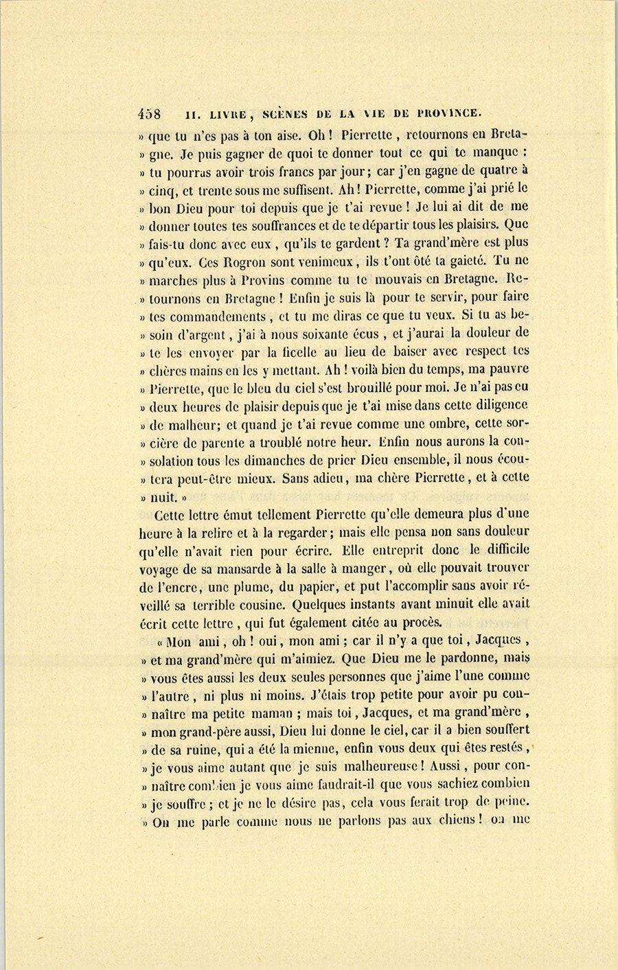 – Grand’mère, dit-elle, laisse tout ton bien à Brigaut (Brigaut fondait en larmes). – Et, dit Pierrette en continuant, donne mille francs à cette bonne Adèle qui me bassinait mon lit en cachette. Si elle était restée chez mes cousins, je vivrais…