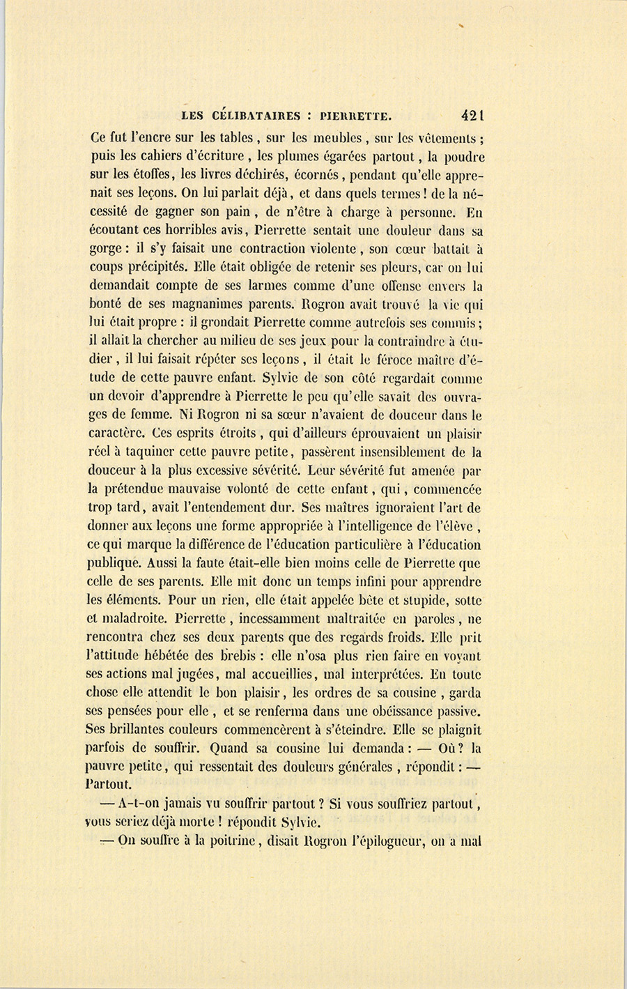 Ce fut la seule fois que d’une manière détournée elle rappela son horrible martyre chez les Rogron, desquels elle ne parlait point, et leur souvenir devait lui être si pénible, que personne ne parlait d’eux.